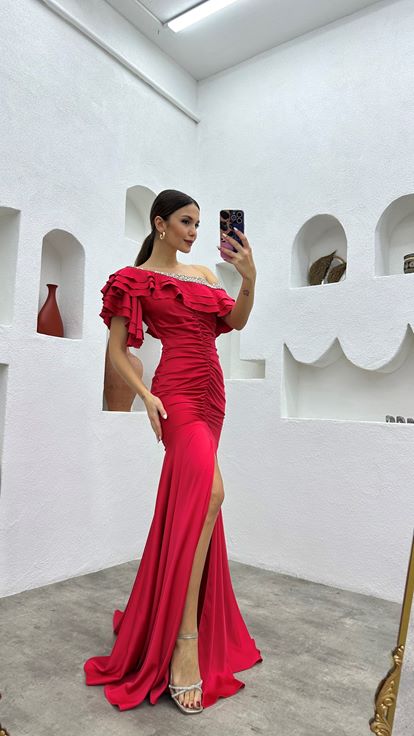 • Kırmızı Göğsü Taşlı Volanlı Büzgülü Abiye Elbise