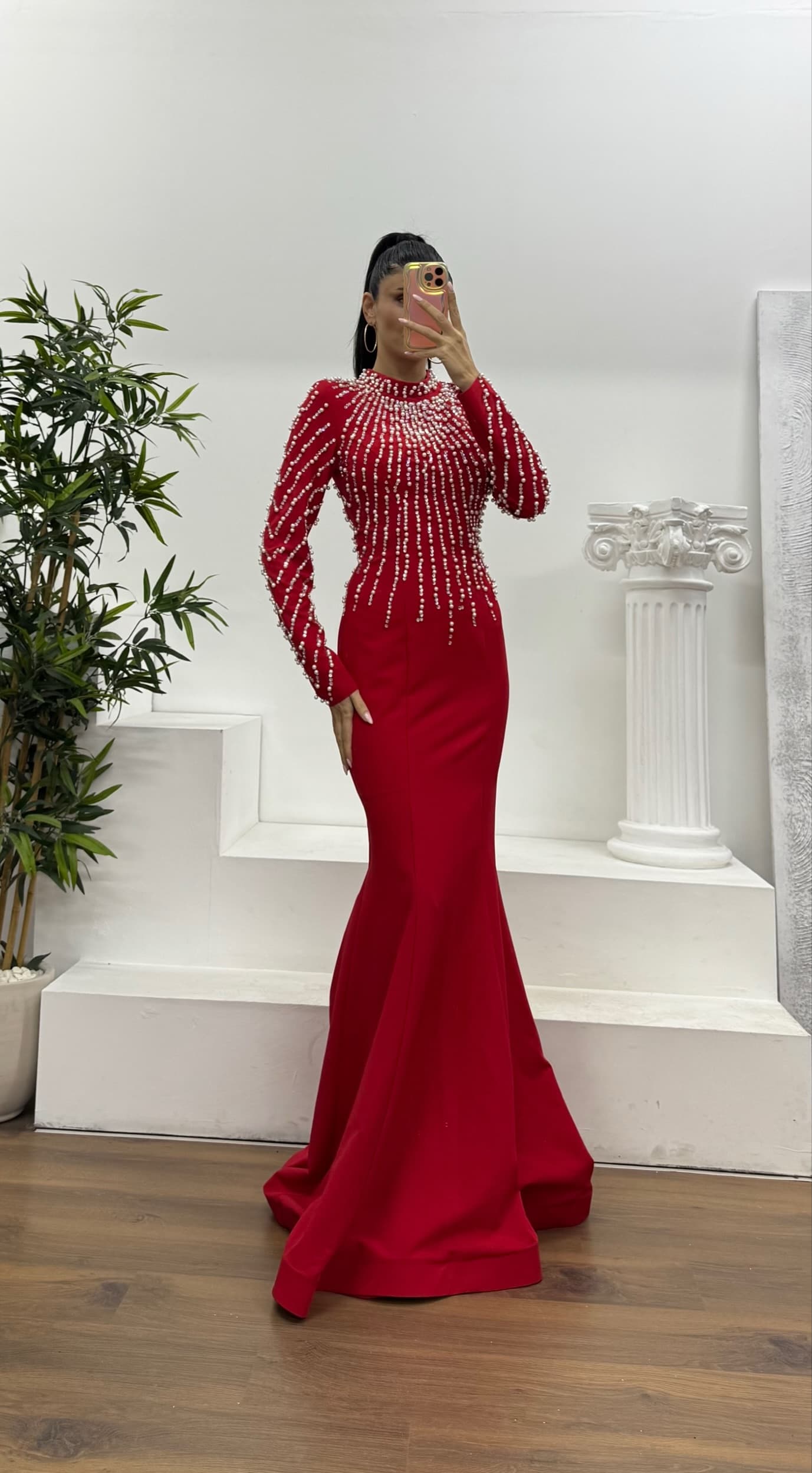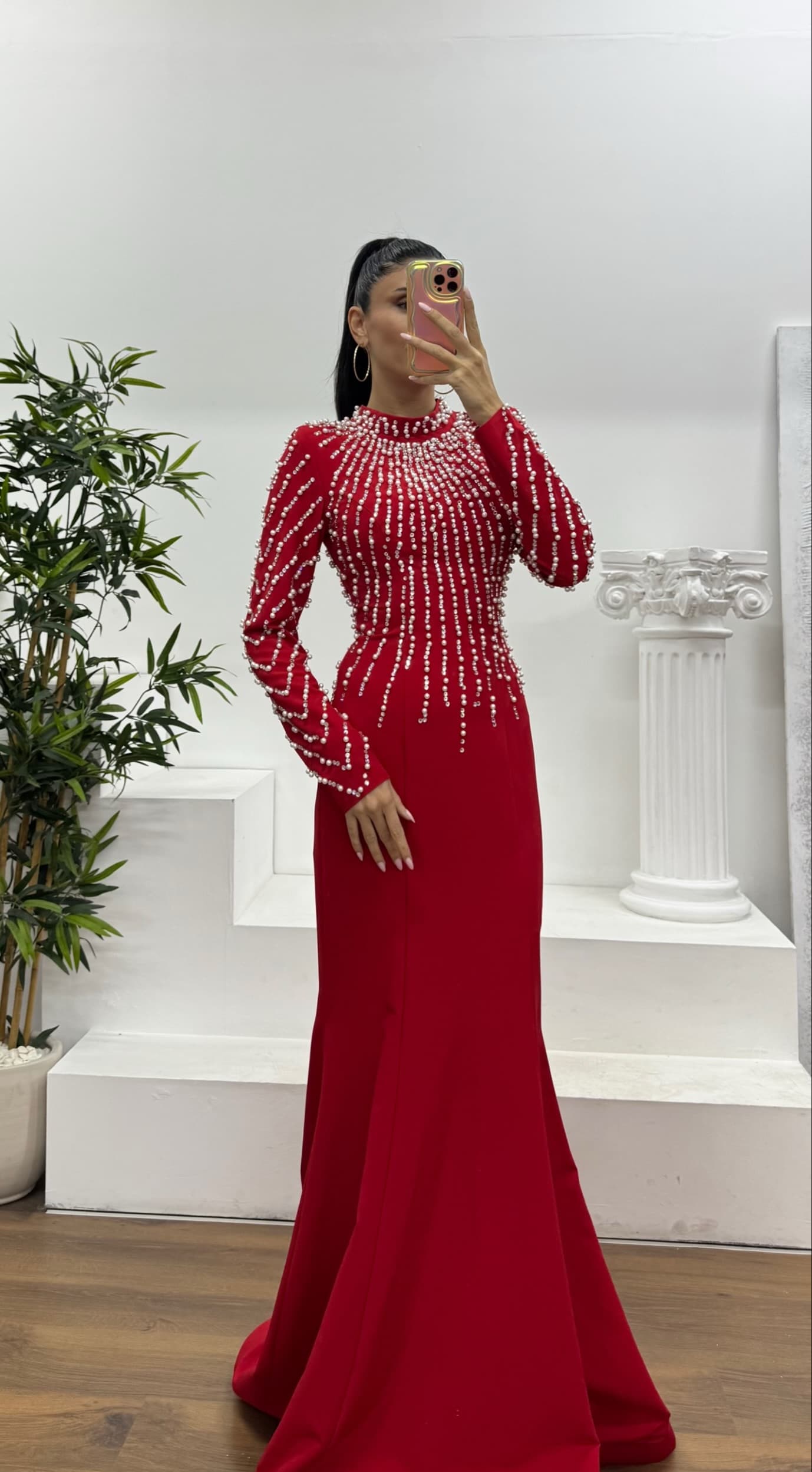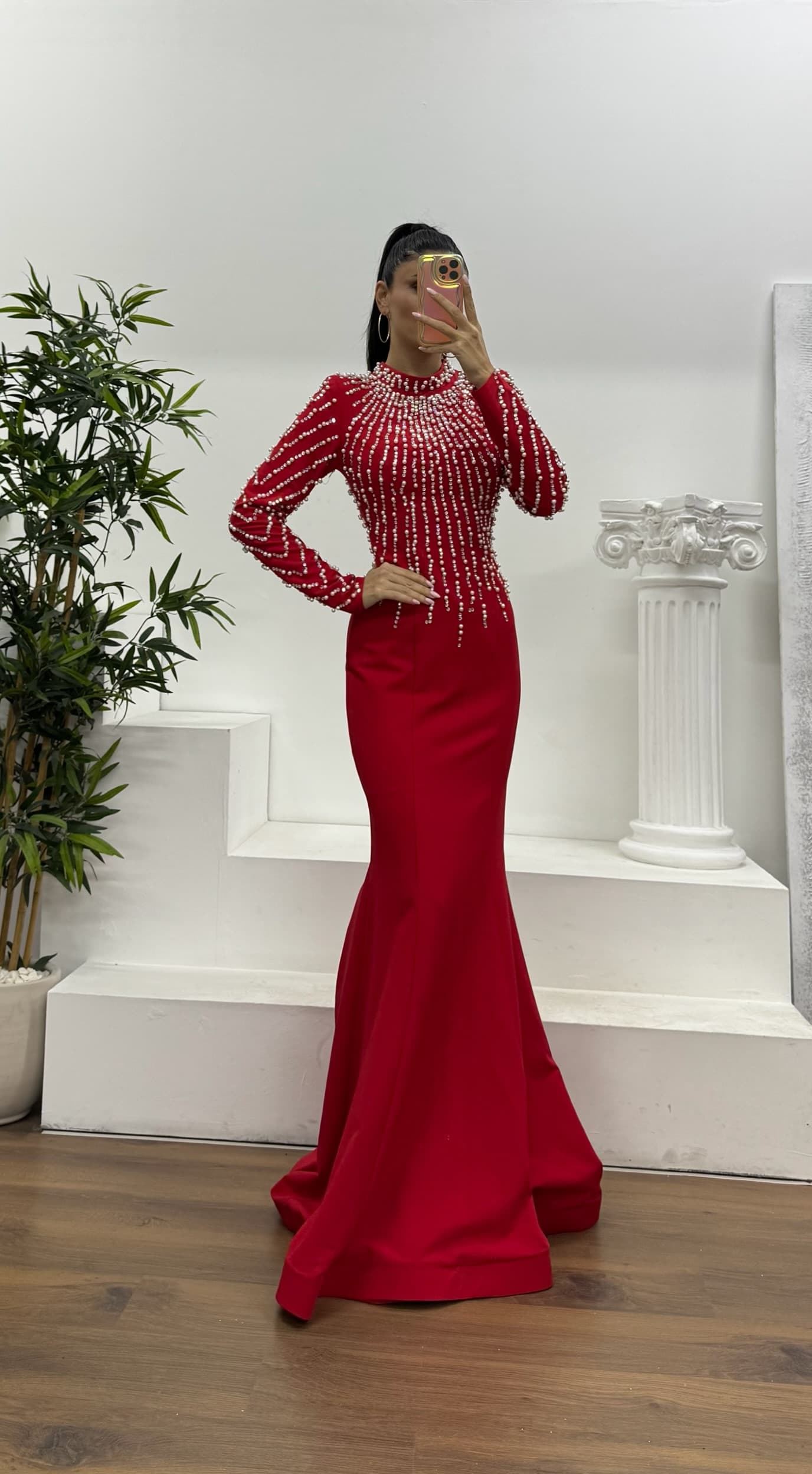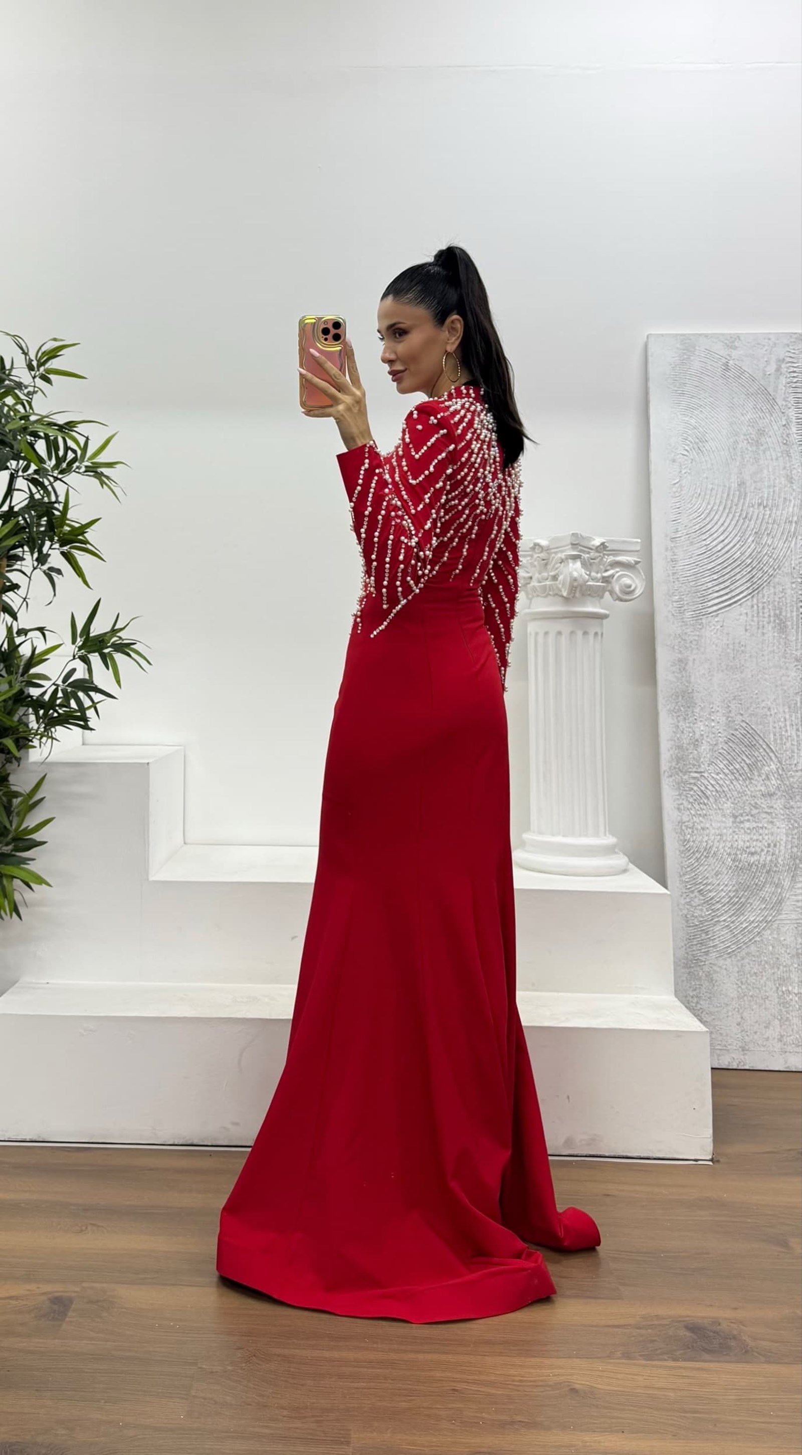 • Kırmızı İnci İşlemeli Abiye Elbise