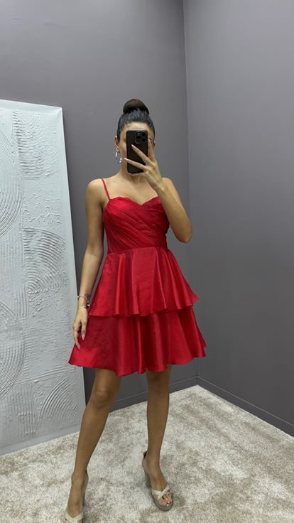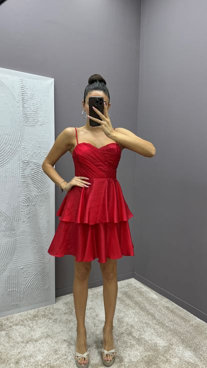 Kırmızı İp Askılı Eteği Kat Kat Tasarım Elbise