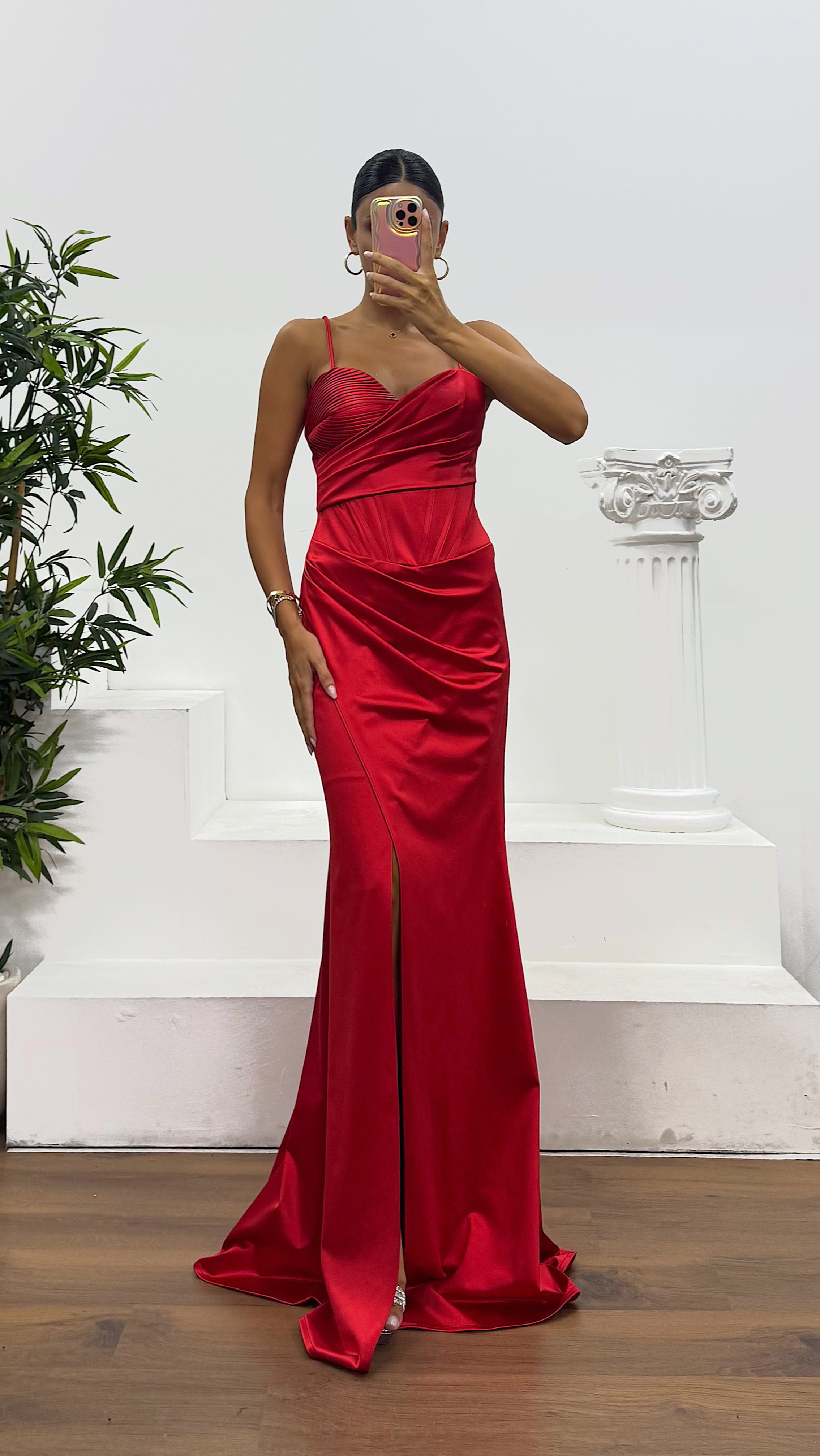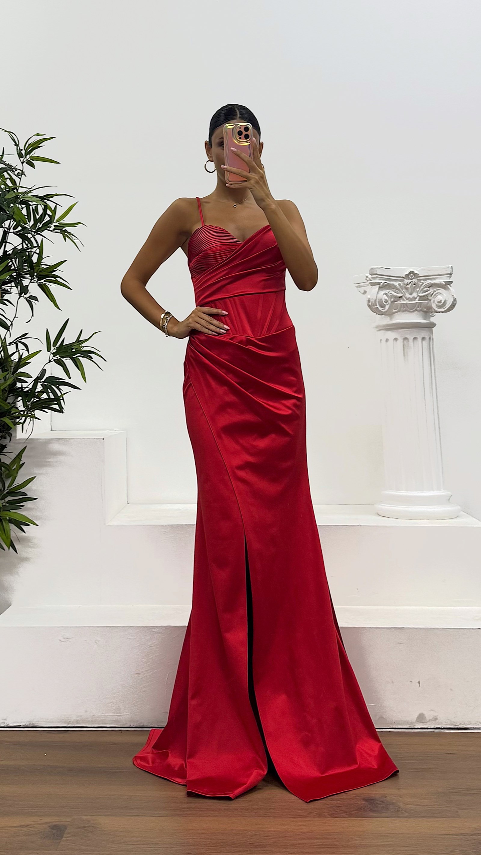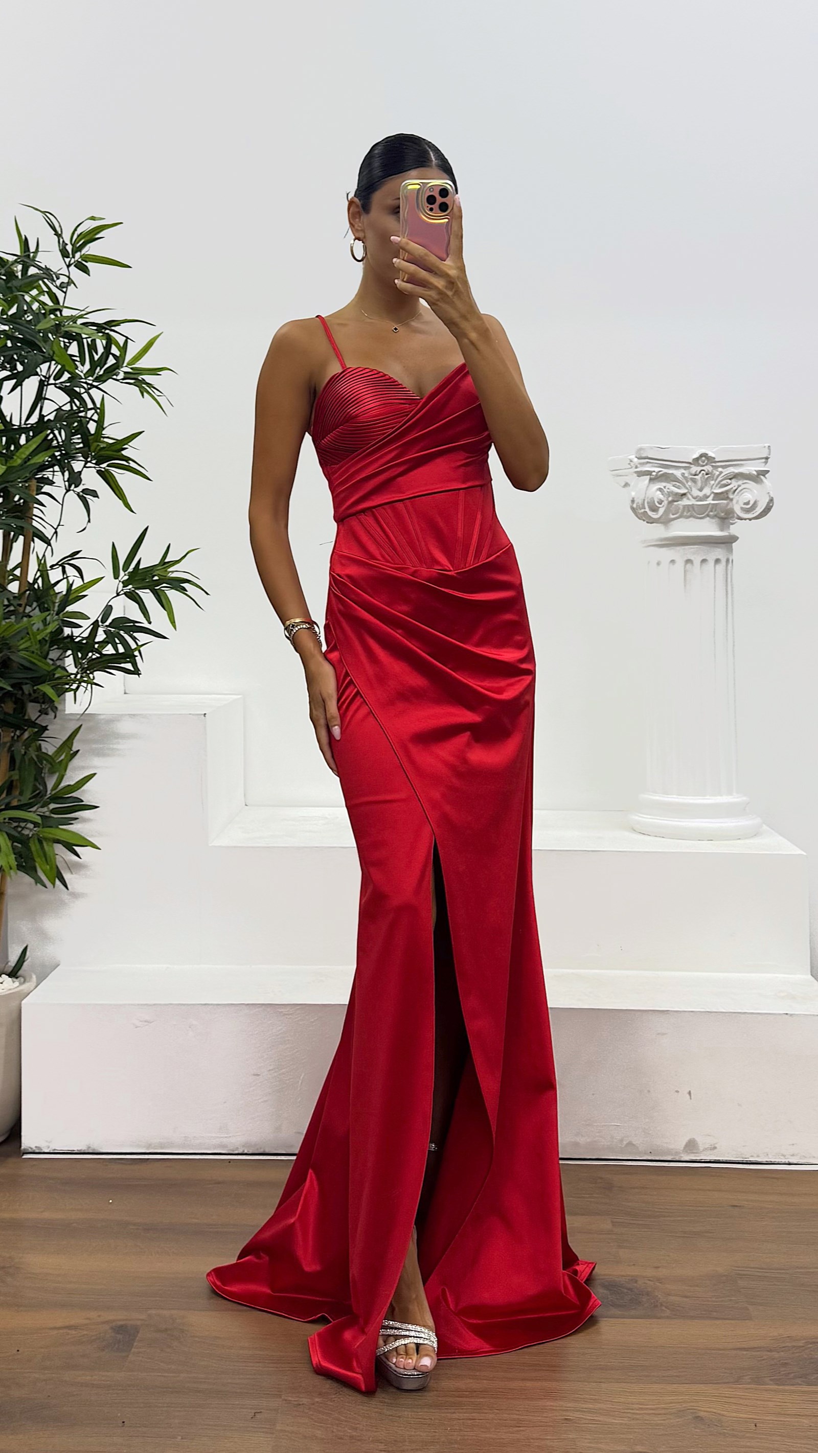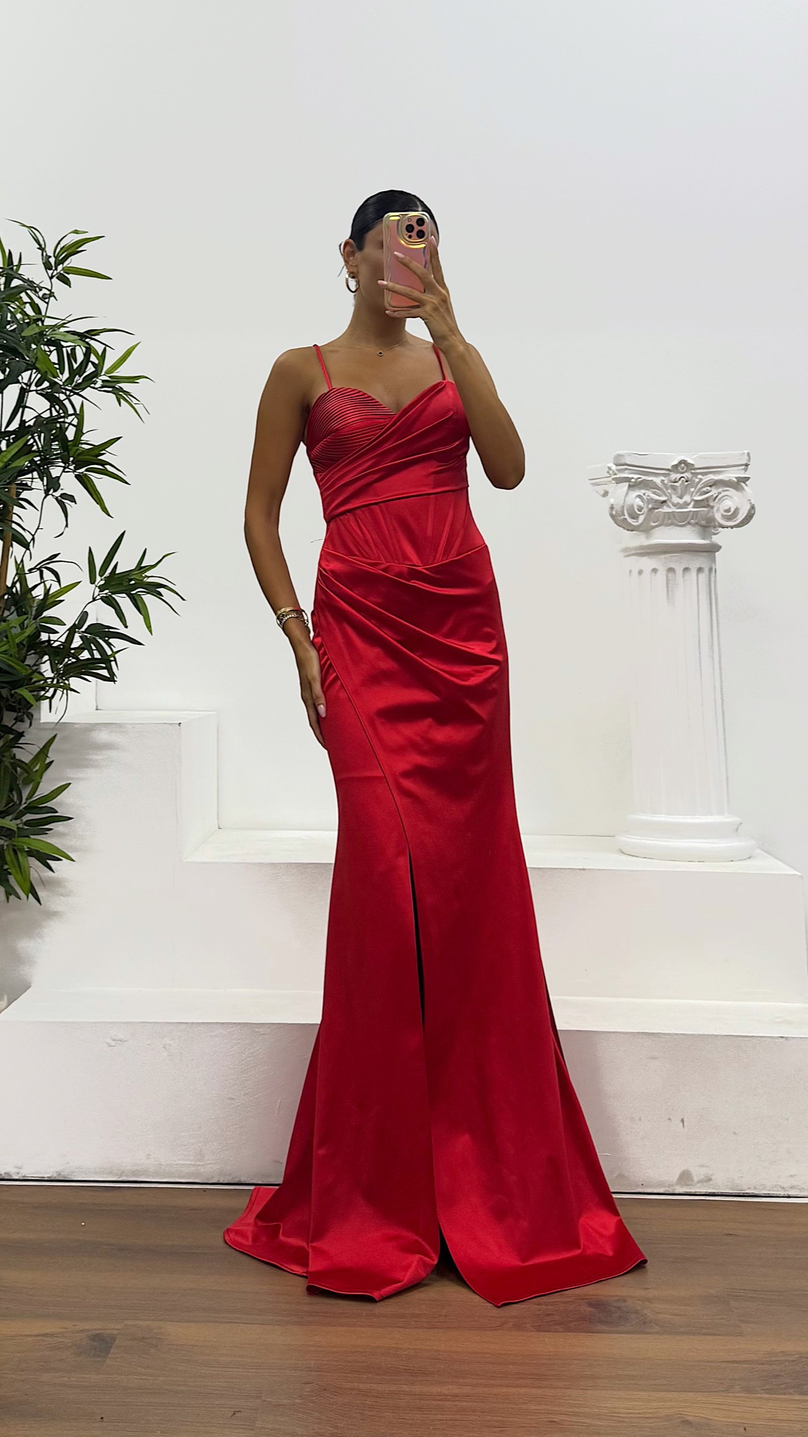 Ürün 36-42 bedene kadar uyumlu, göğüs pedli, astarlı, yırtmaçlı, sırt capraz ip ve fermuar kapamalı, ip askılı abiye olarak tasarlanmıştır.