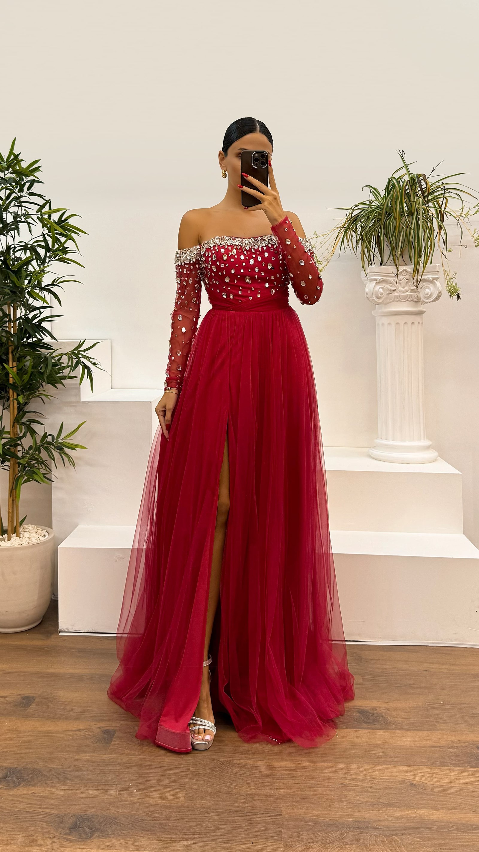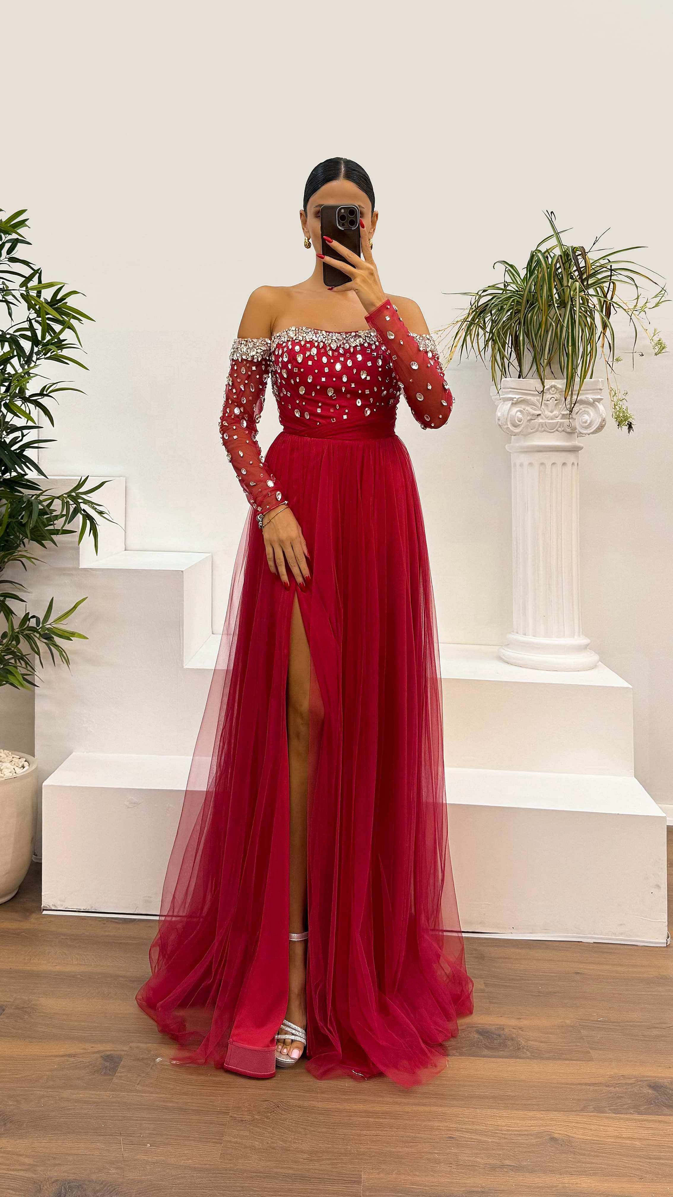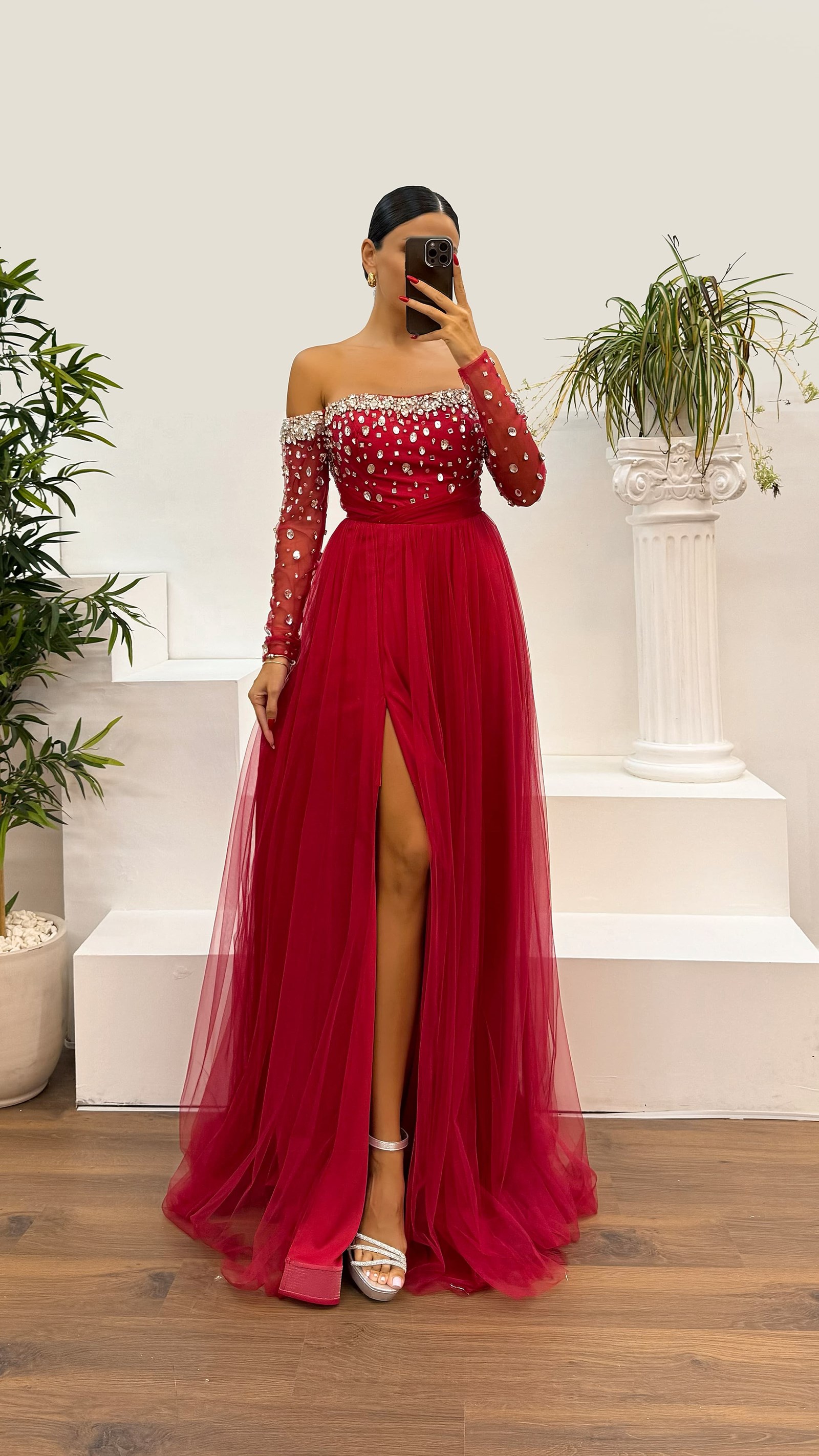 • Kırmızı Kayık Yaka İşlemeli Tül Abiye Elbise