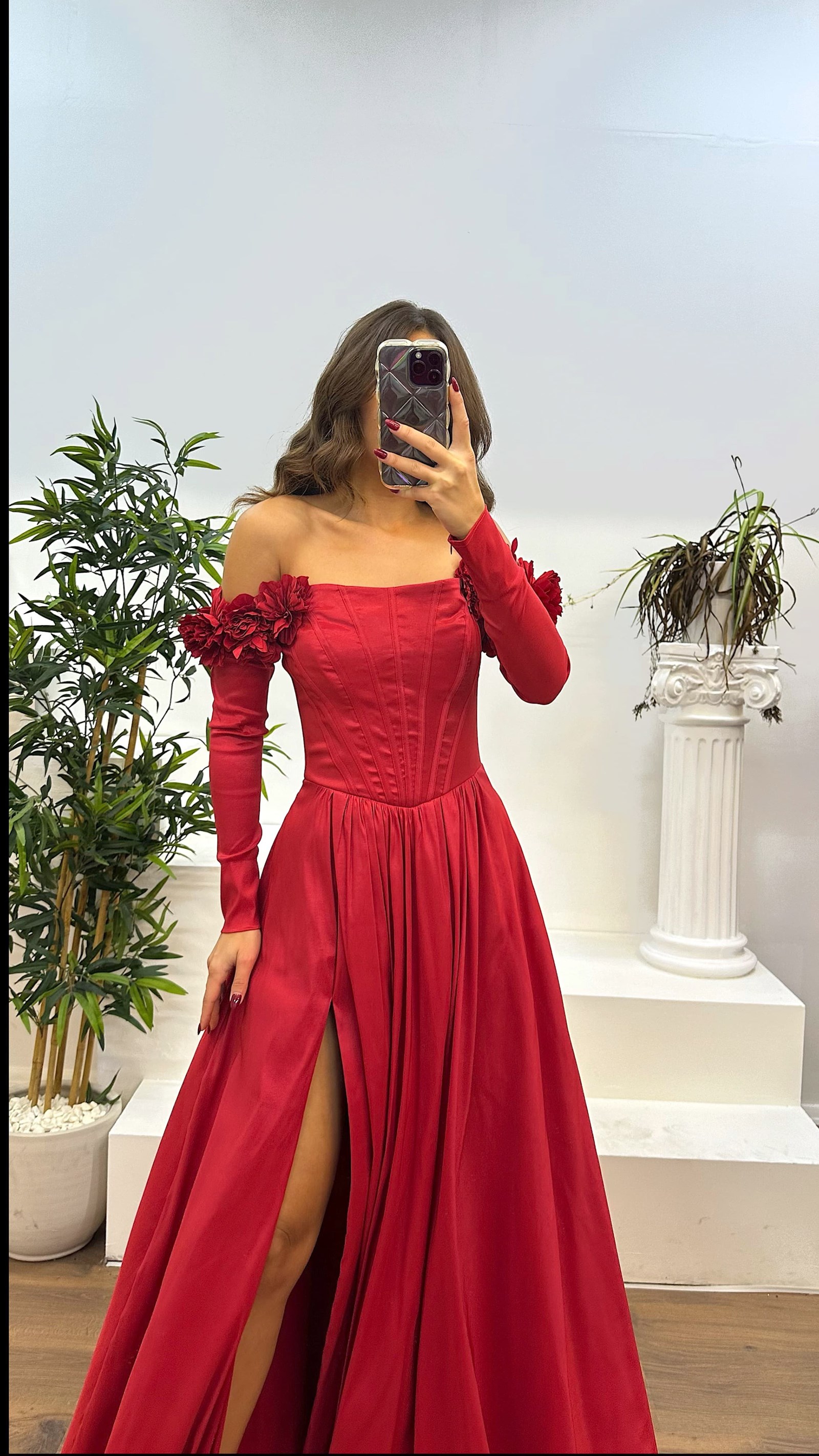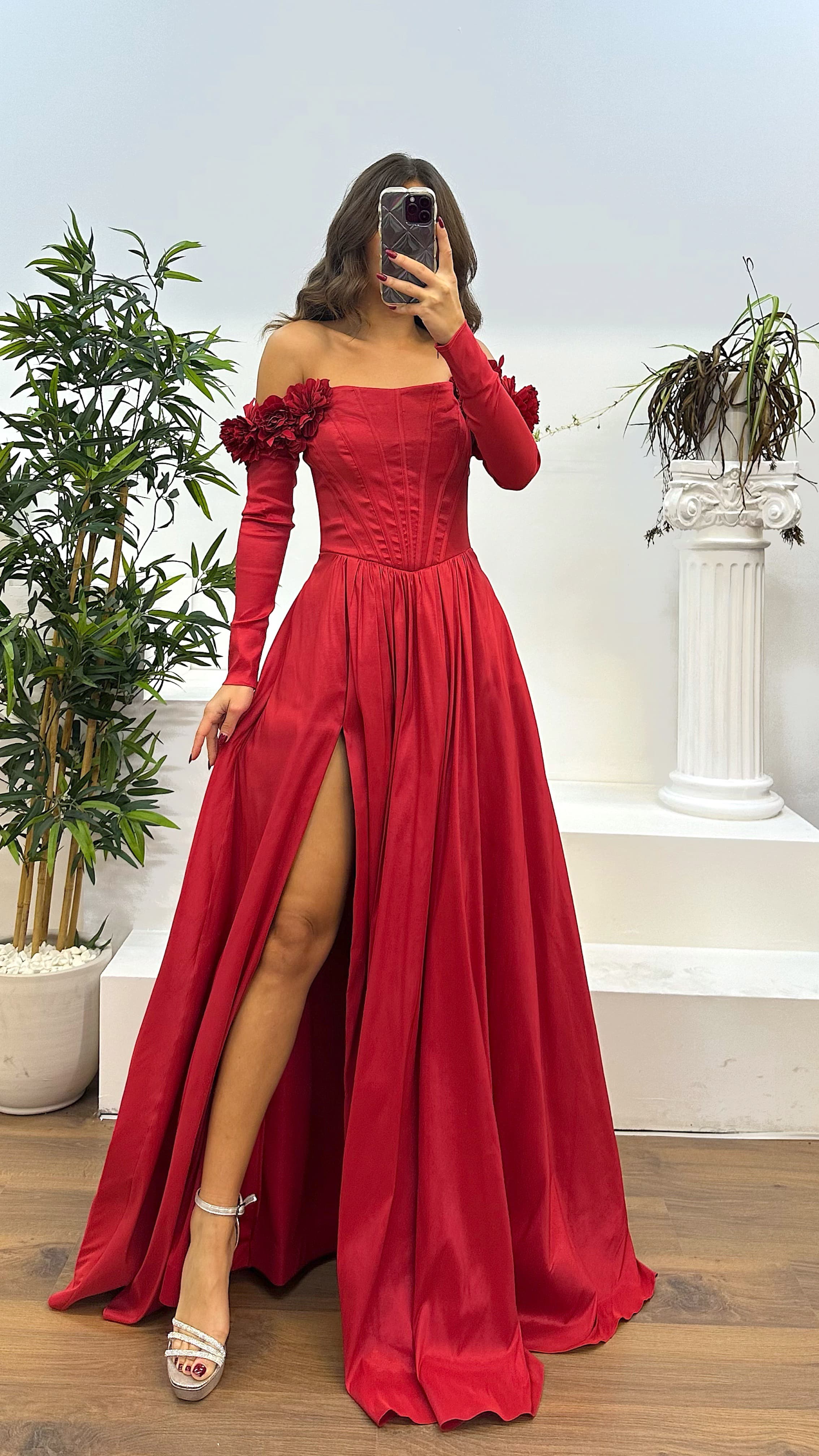 • Kırmızı Kayık Yaka Uzun Kol Abiye Elbise