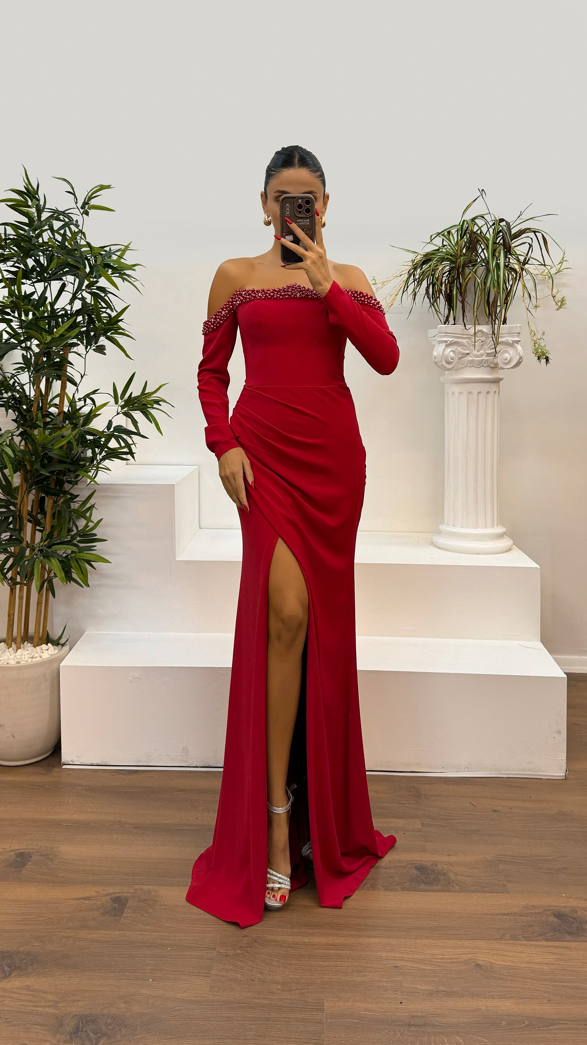 Kırmızı Kayık Yaka Uzun Kollu Abiye Elbise