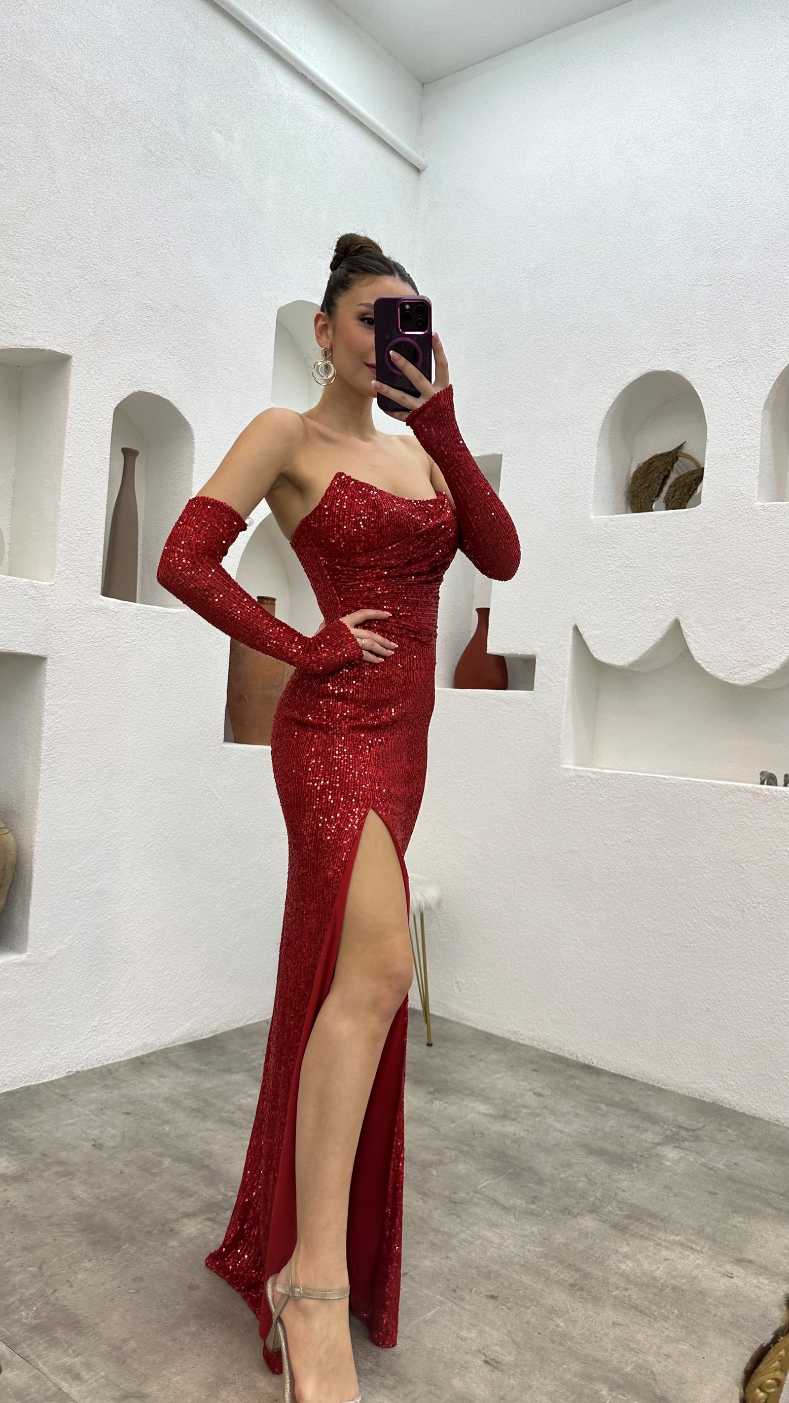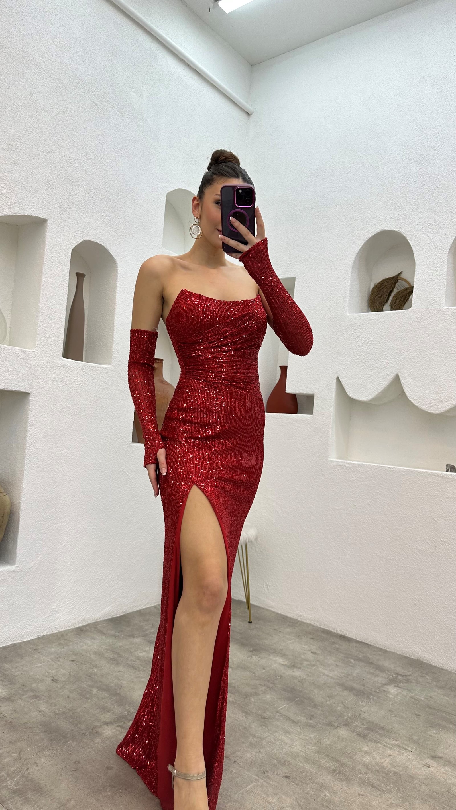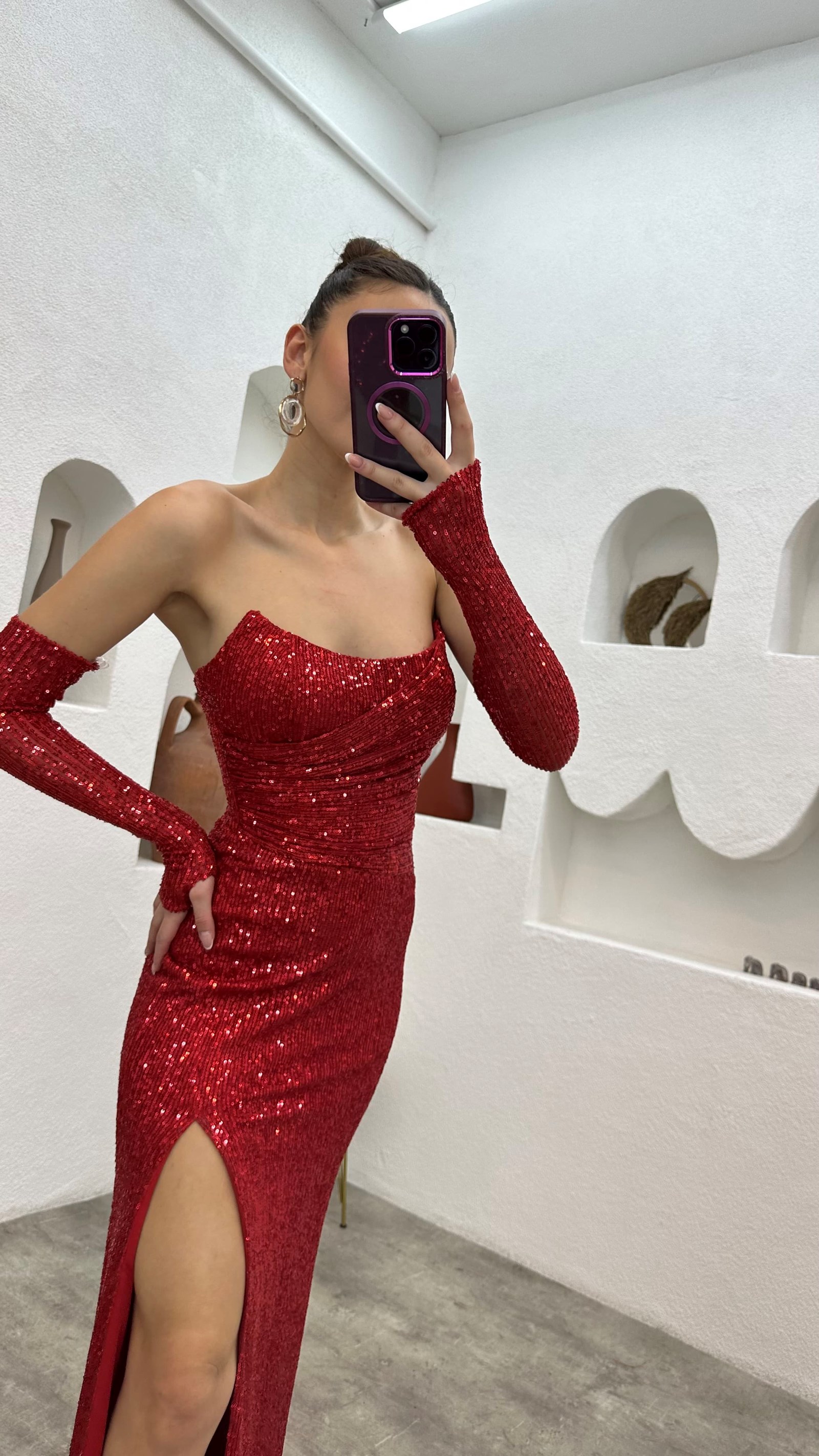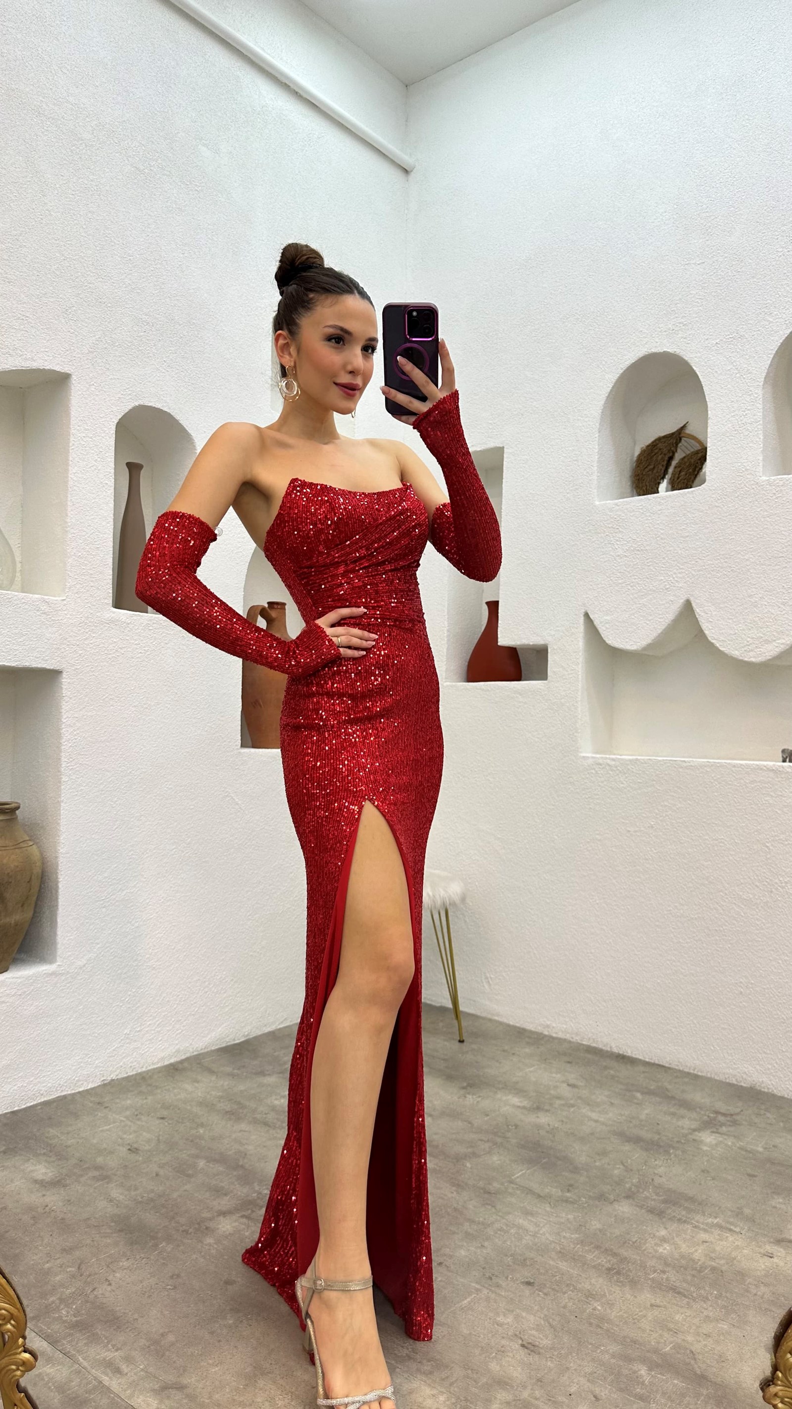 Kırmızı Kol Detay Straplez Pul Payet Abiye Elbise