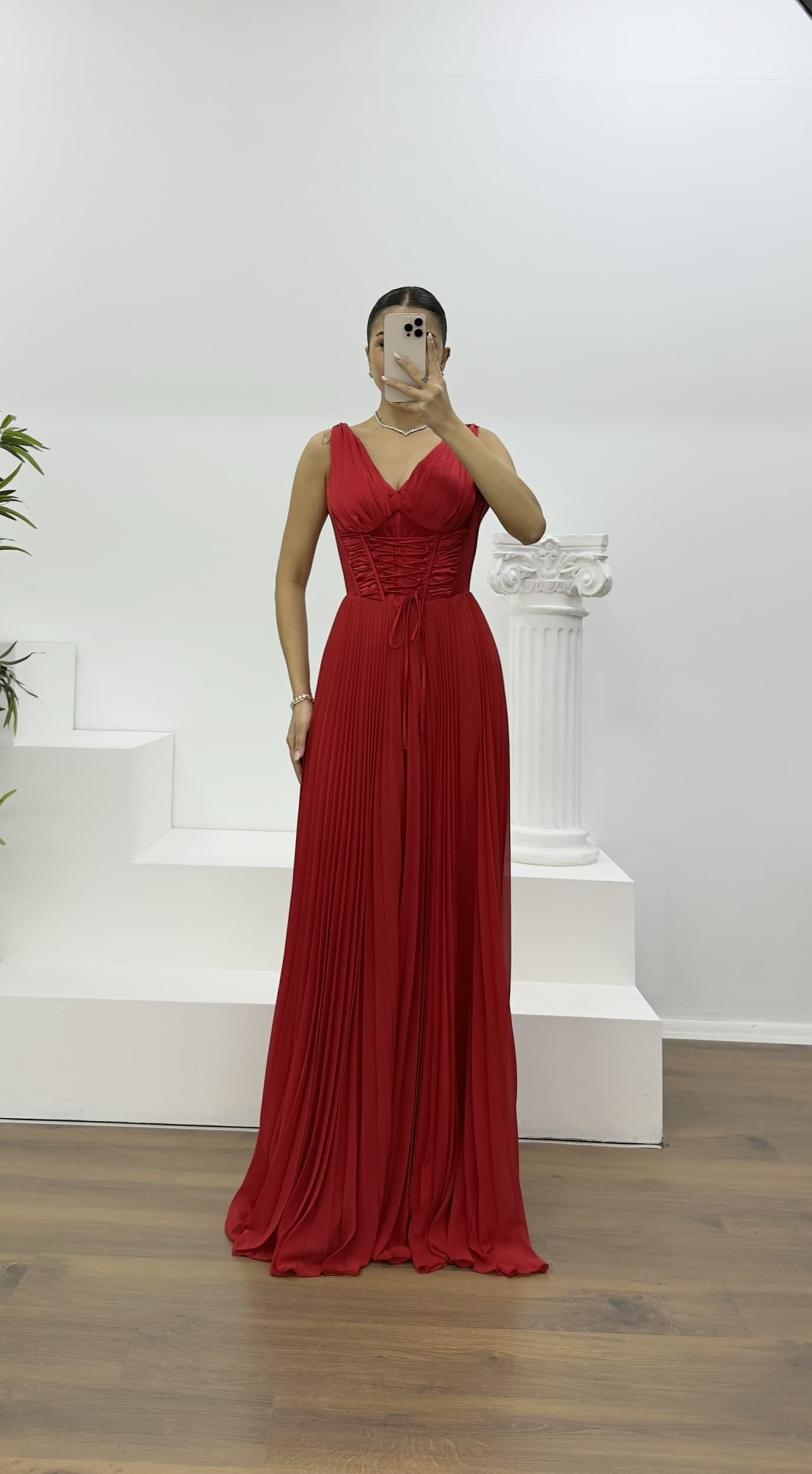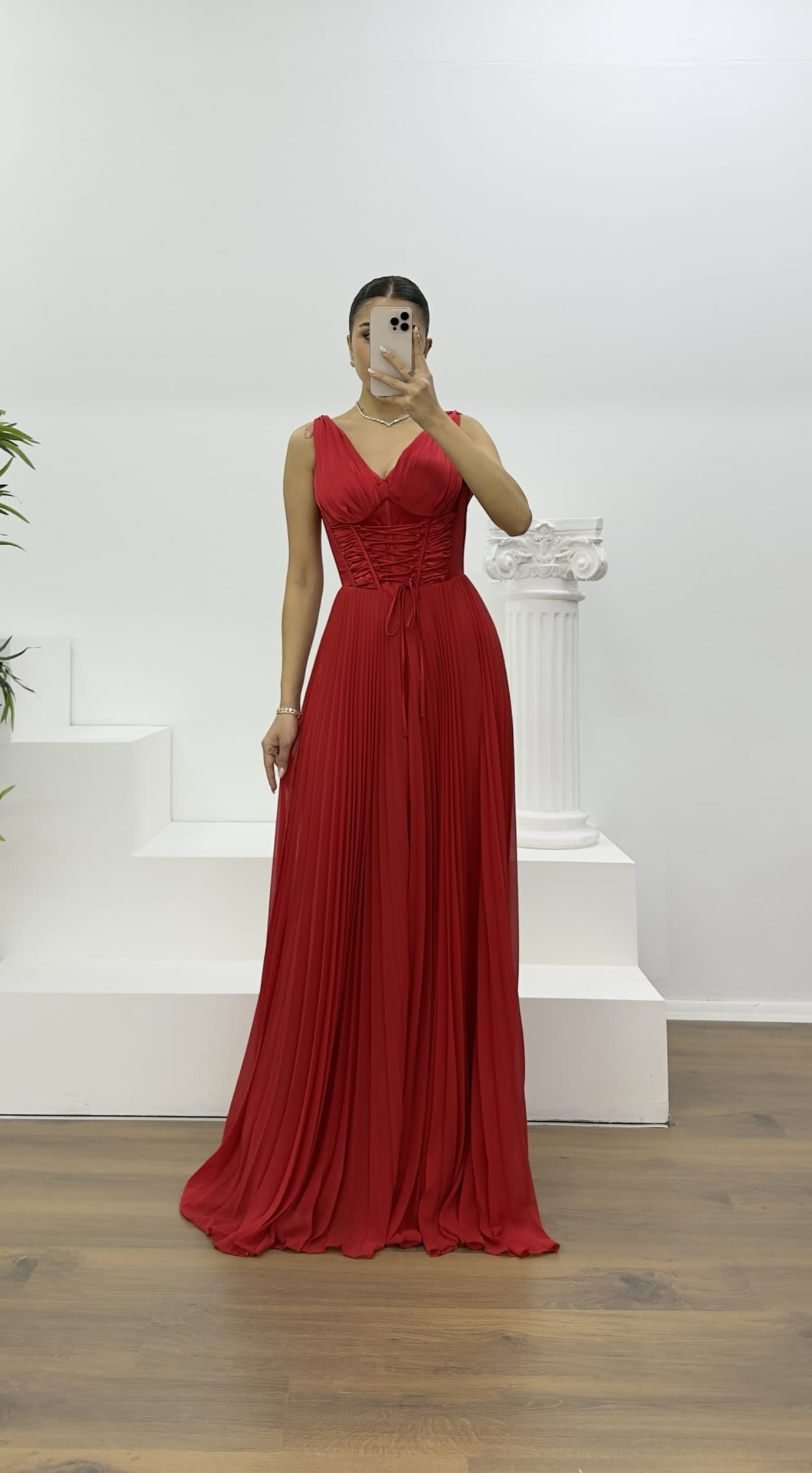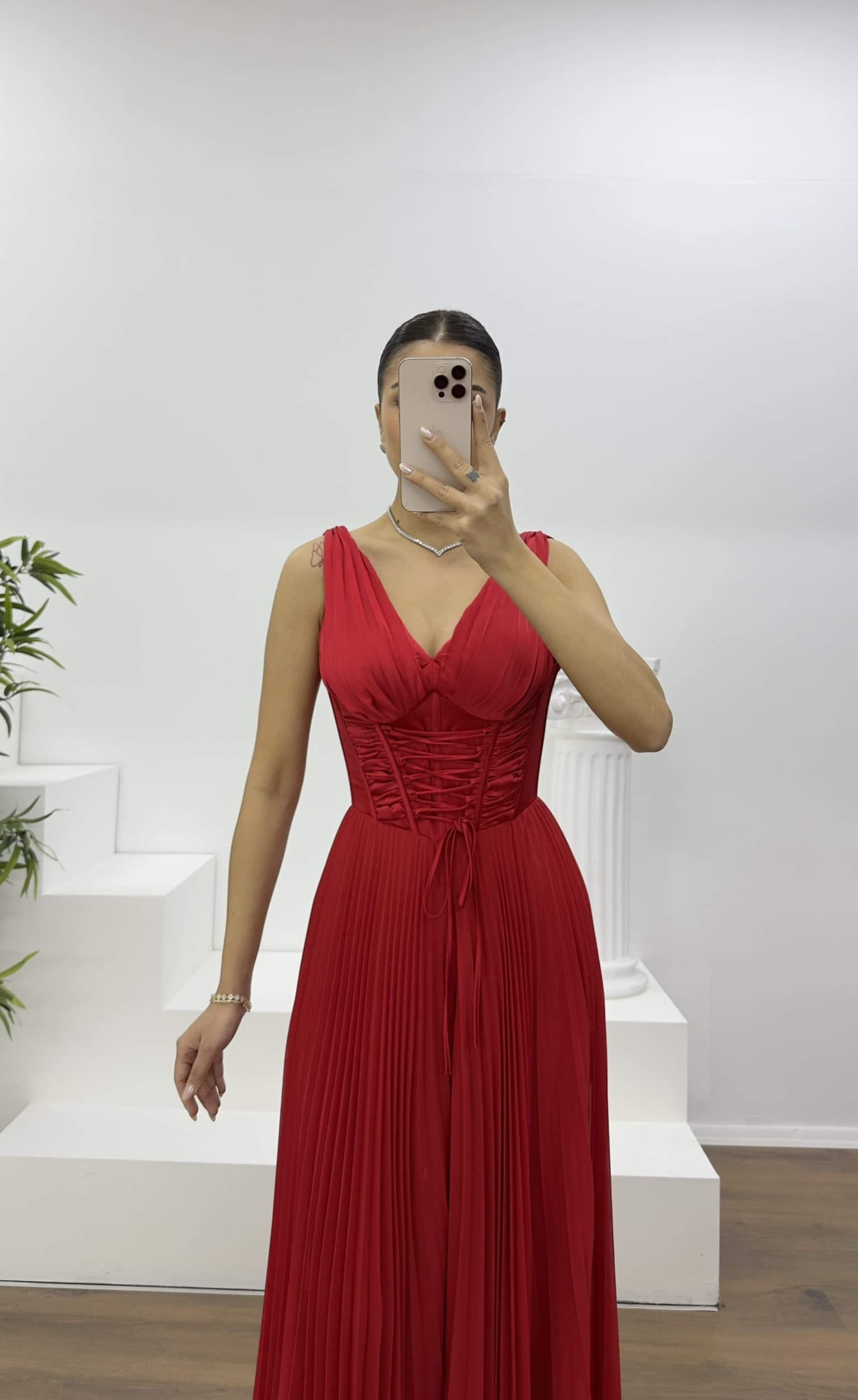• Kırmızı Korse Detay Pliseli Abiye Tulum e