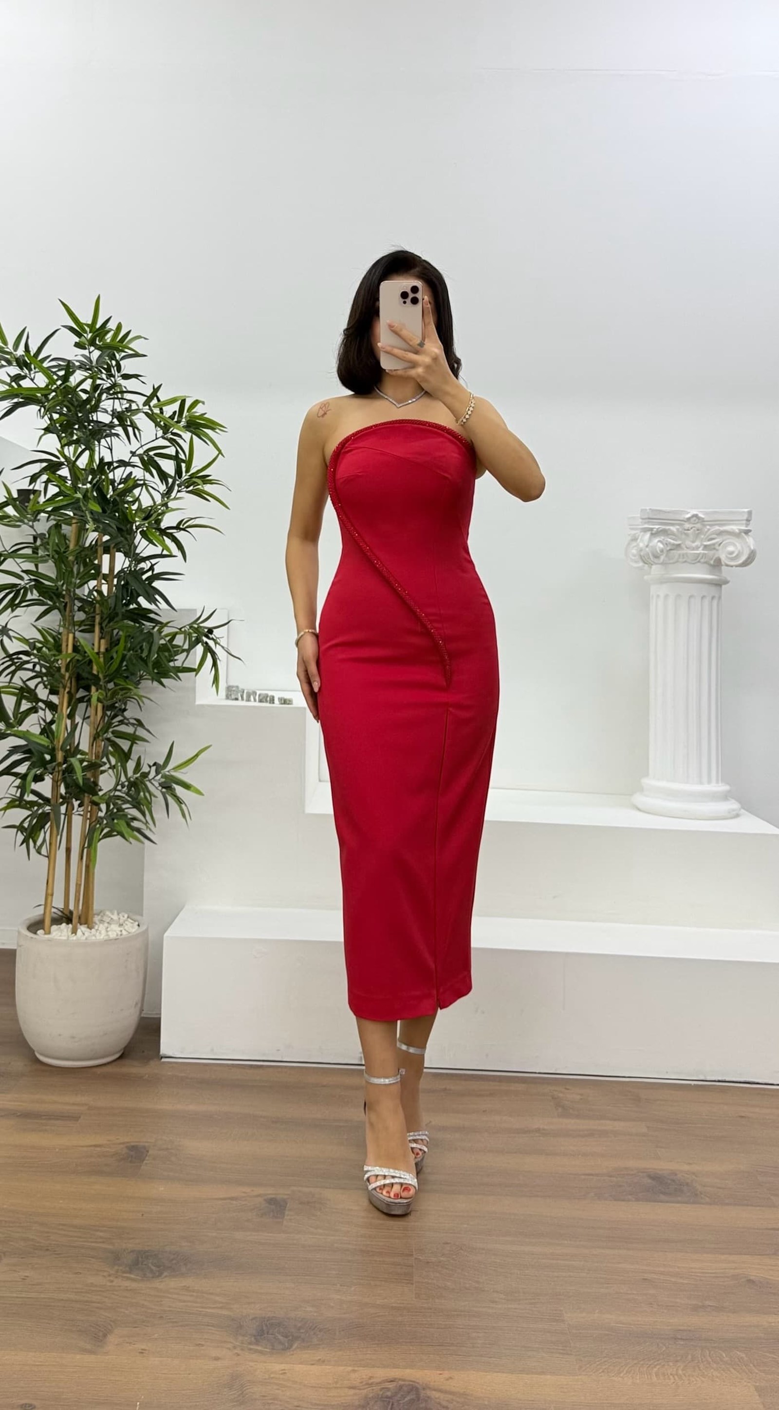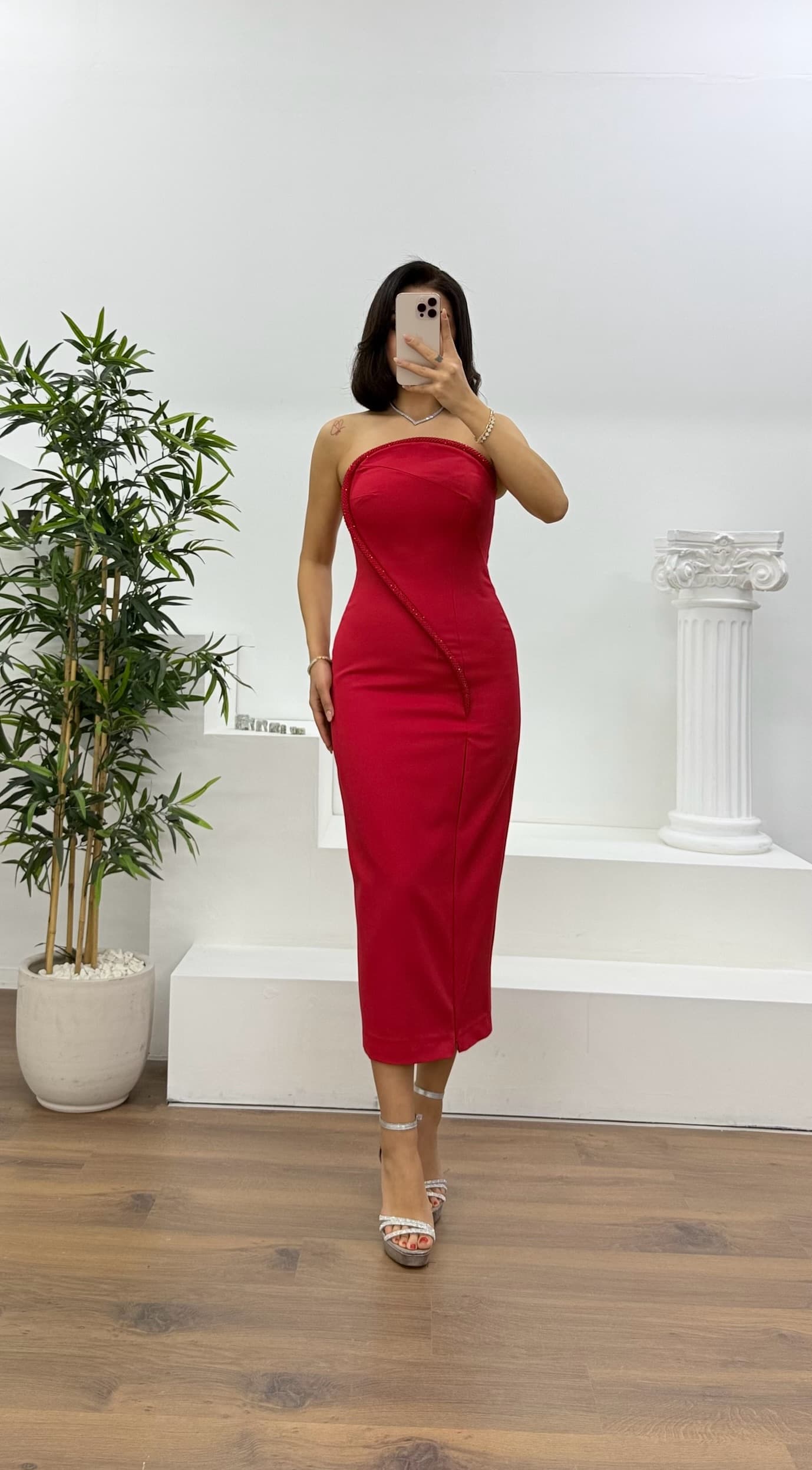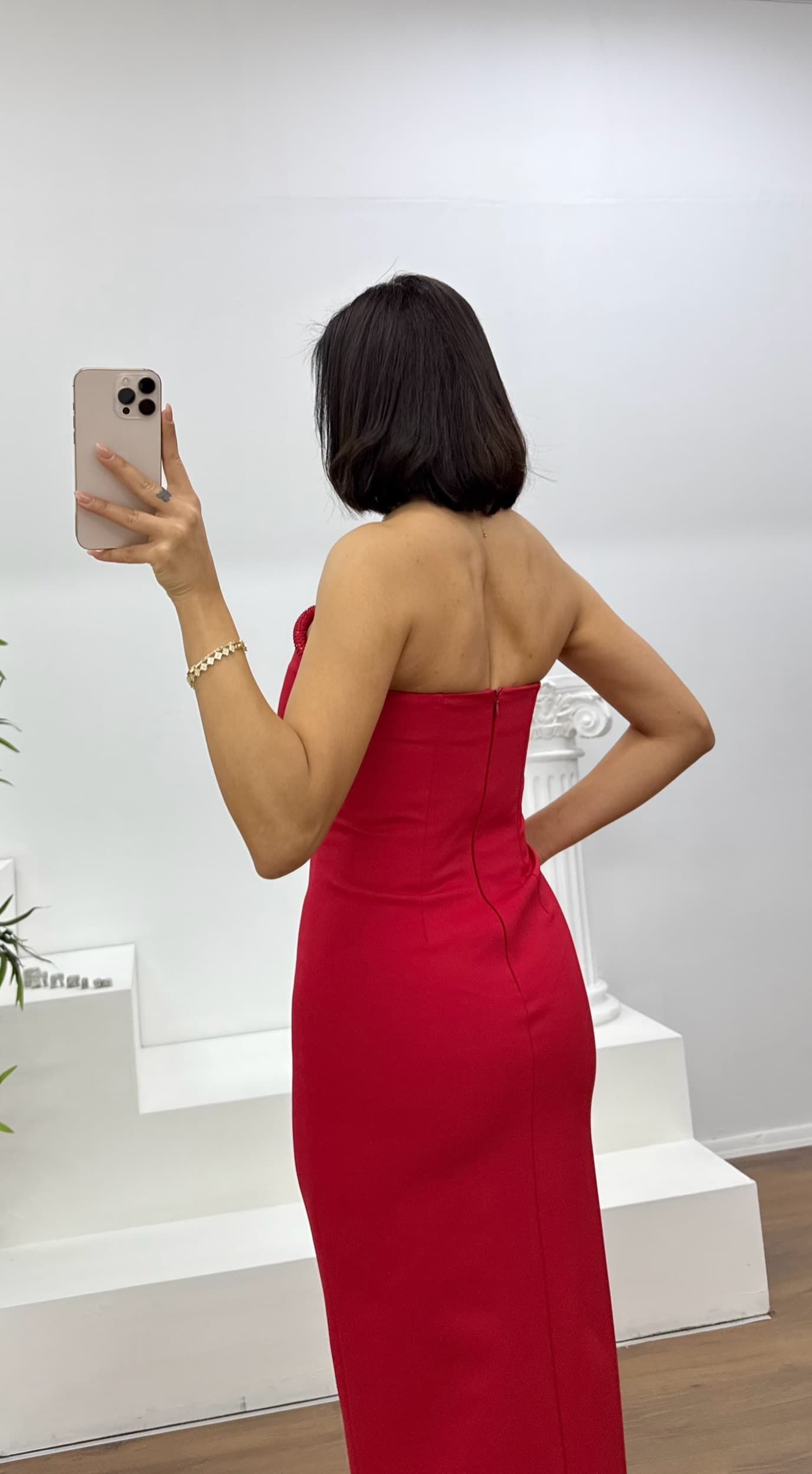 • Kırmızı Kristal Şerit Detaylı Straplez Abiye Elbise