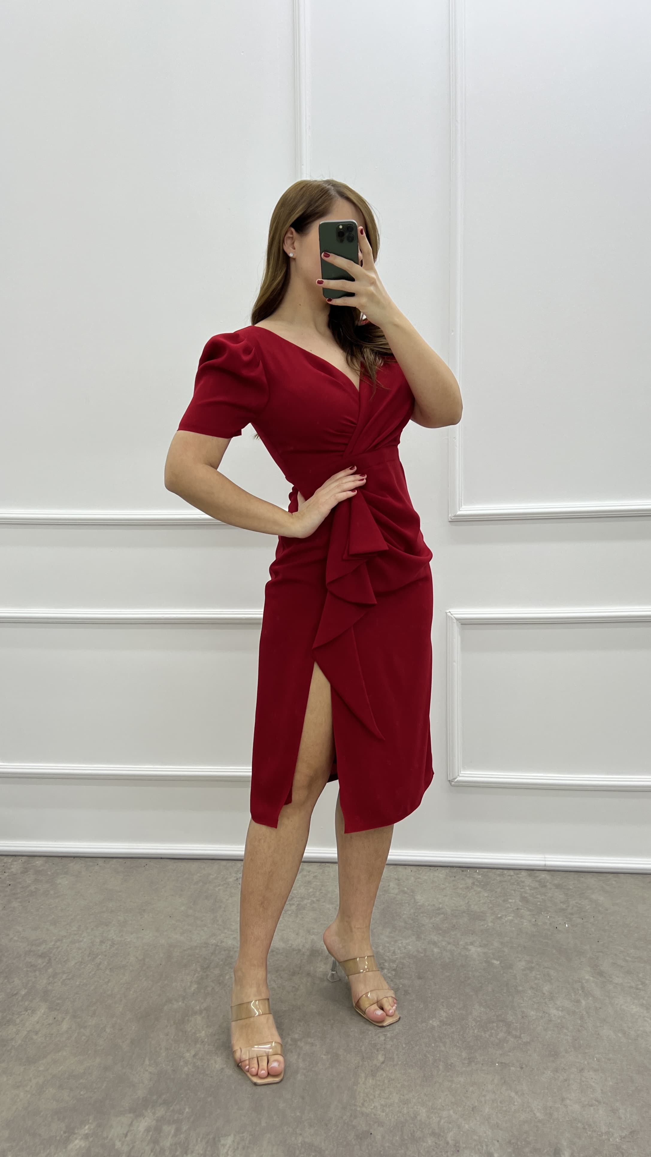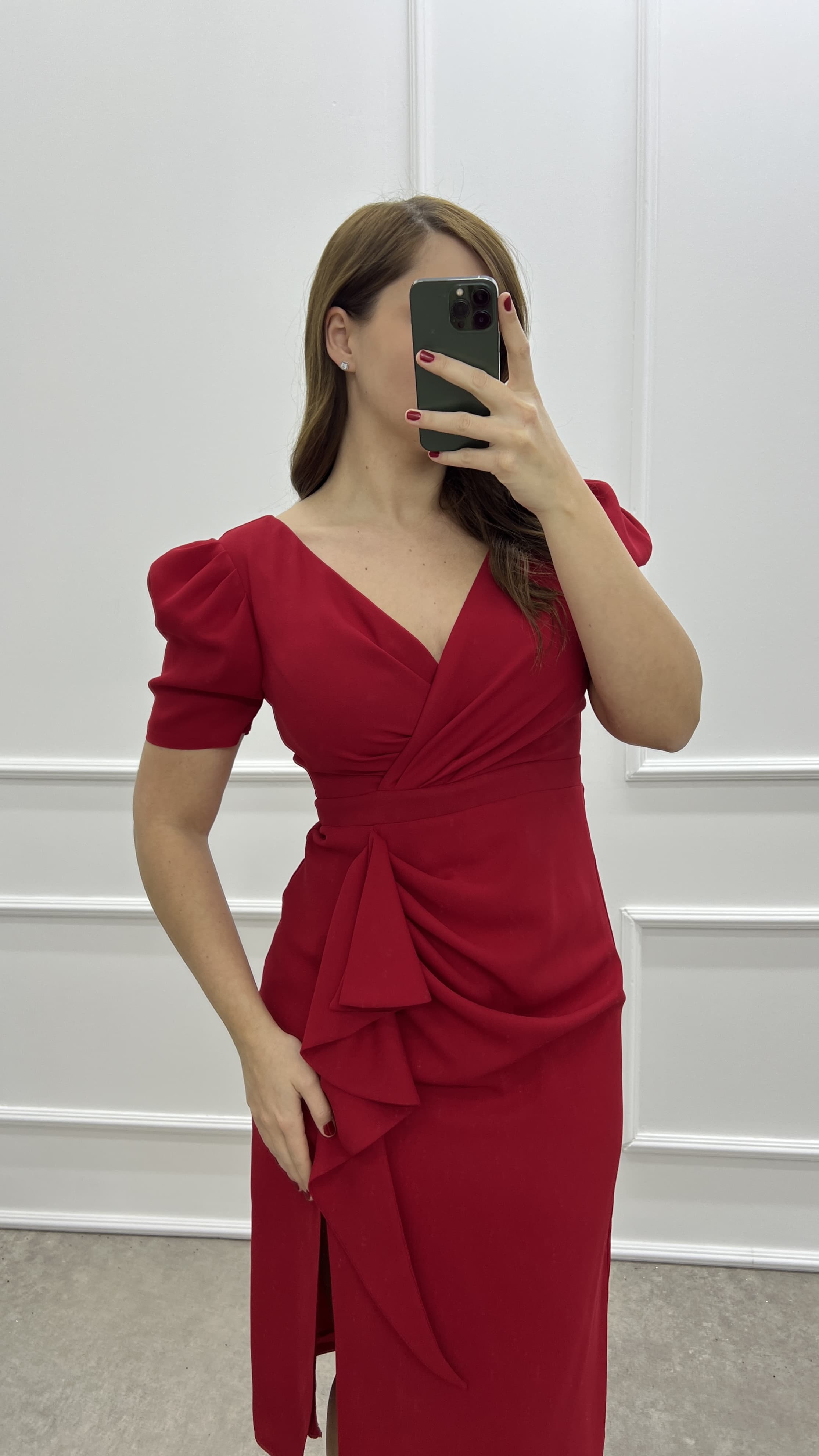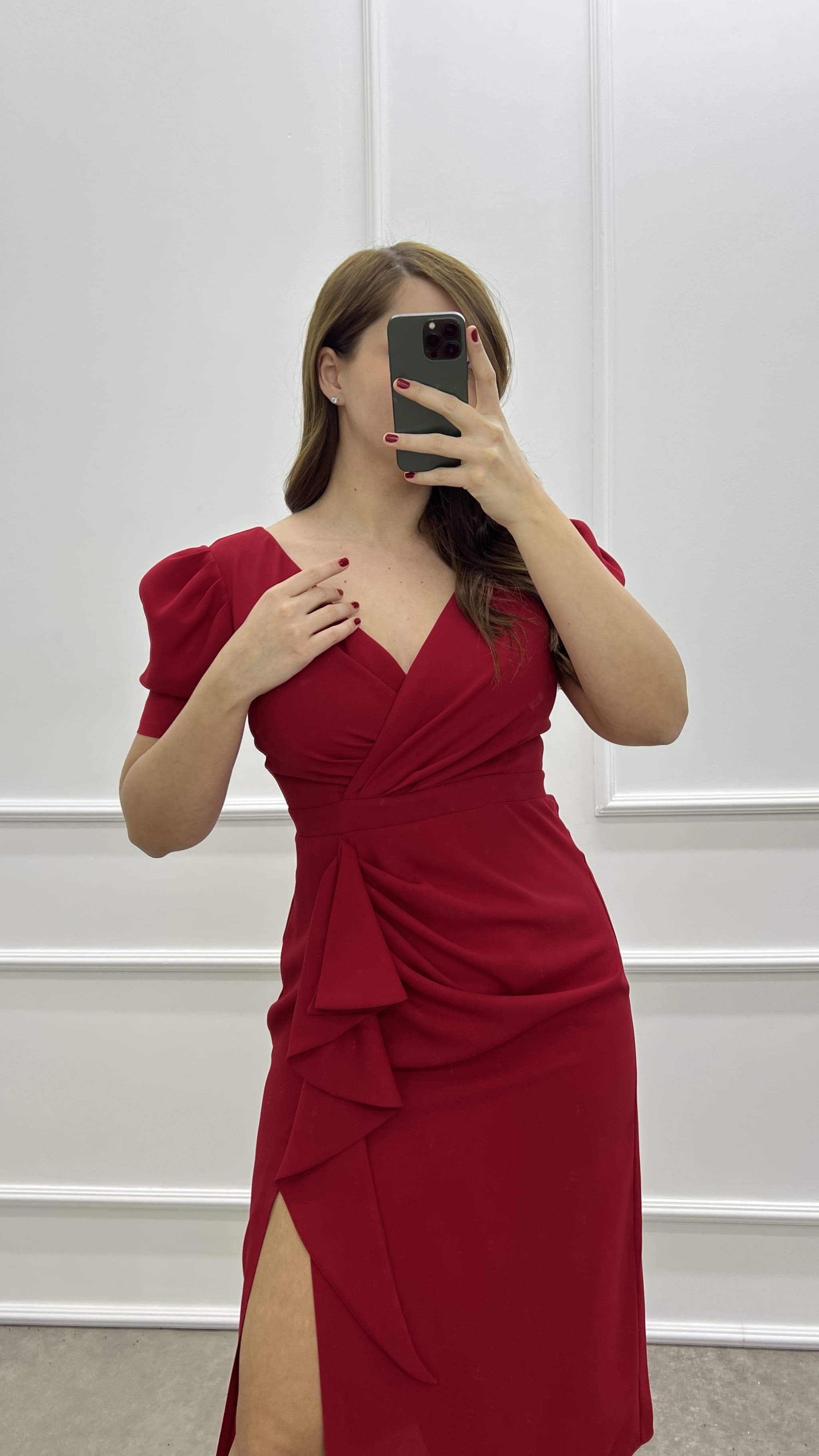 • Kırmızı Kruvaze Yaka Volan Detay Tasarım Büyük Beden Elbise