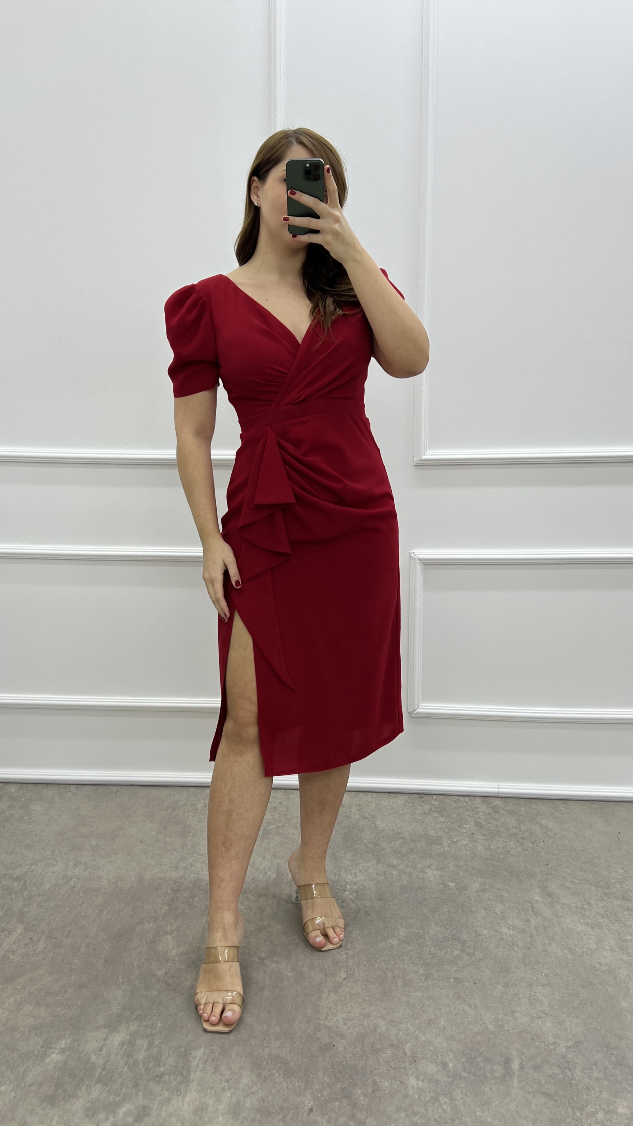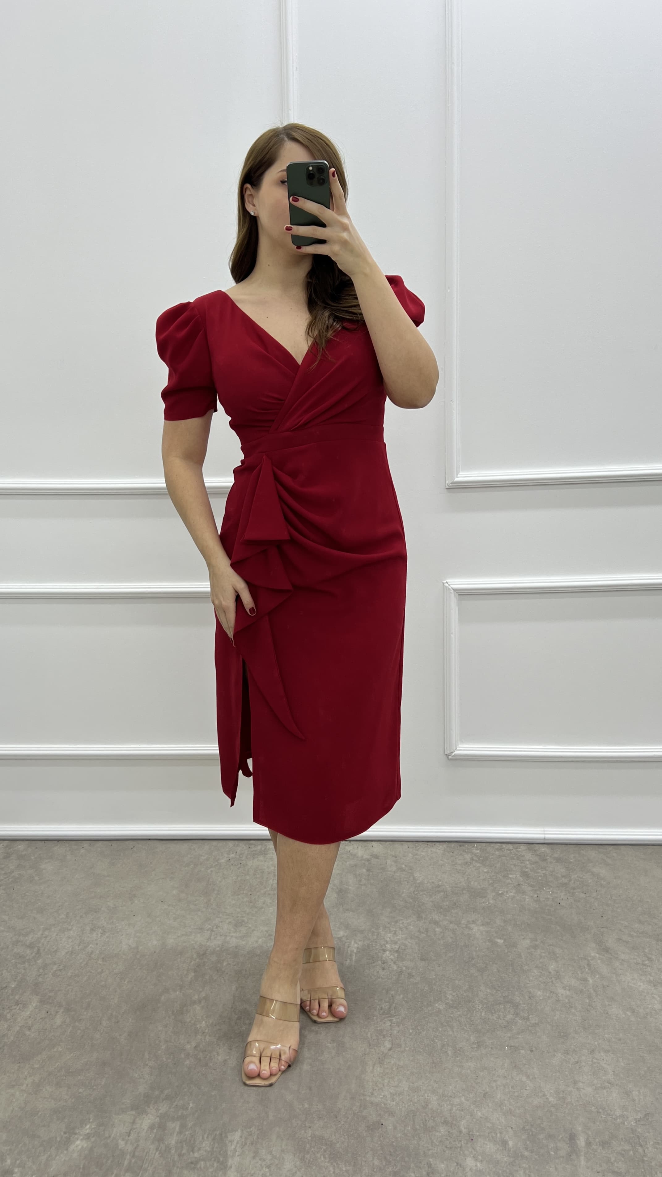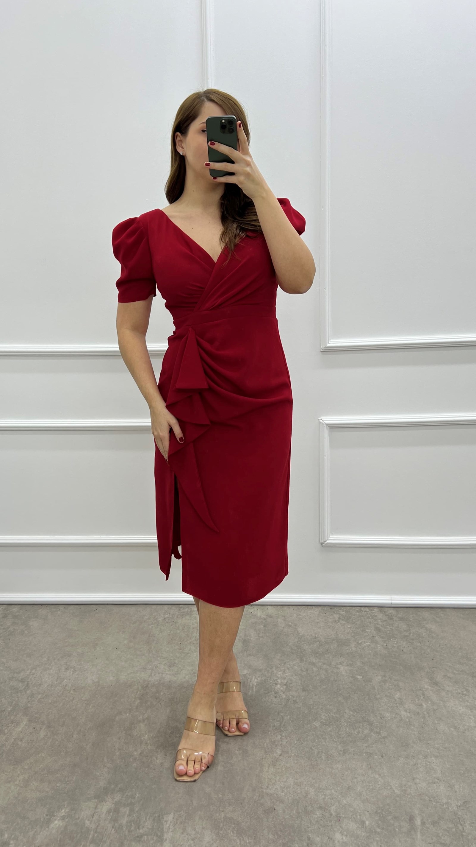 • Kırmızı Kruvaze Yaka Volan Detay Tasarım Büyük Beden Elbise