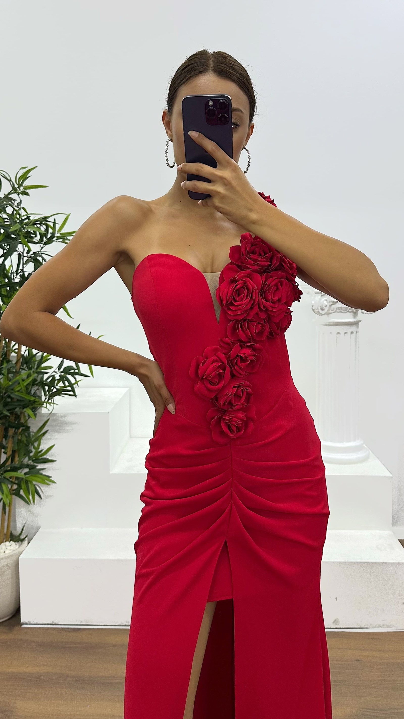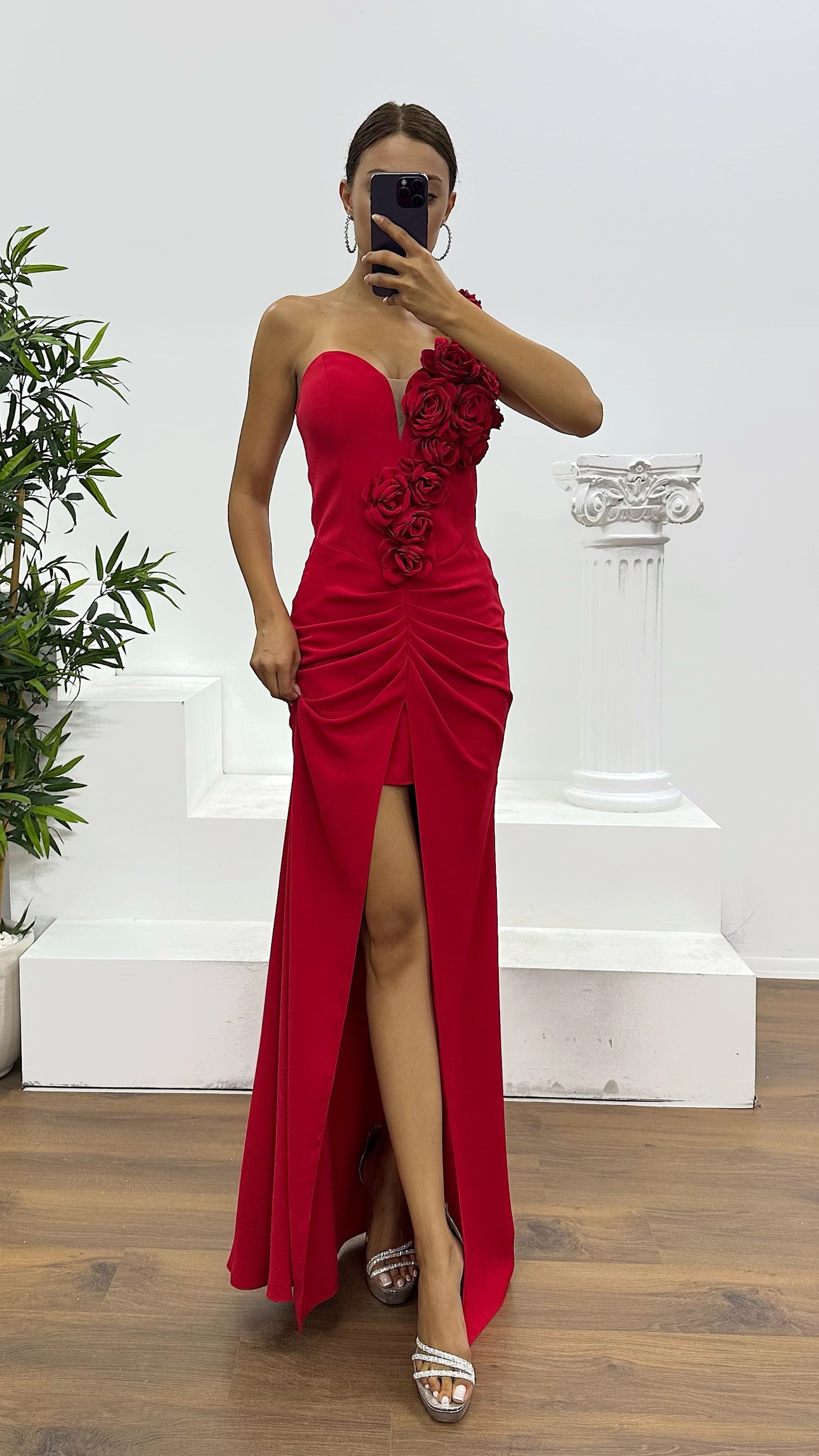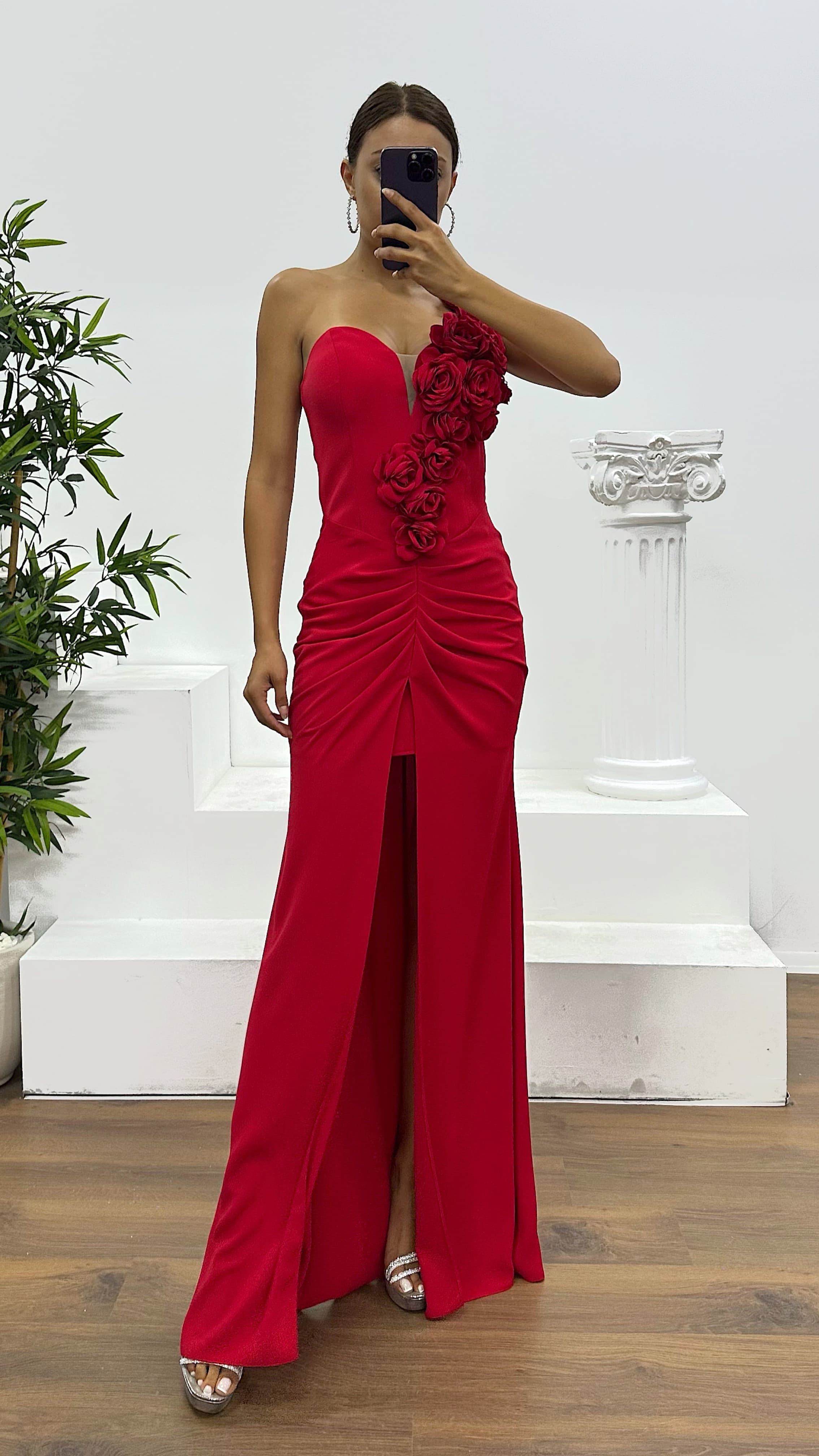 Straplez çiçek detay abiye elbise