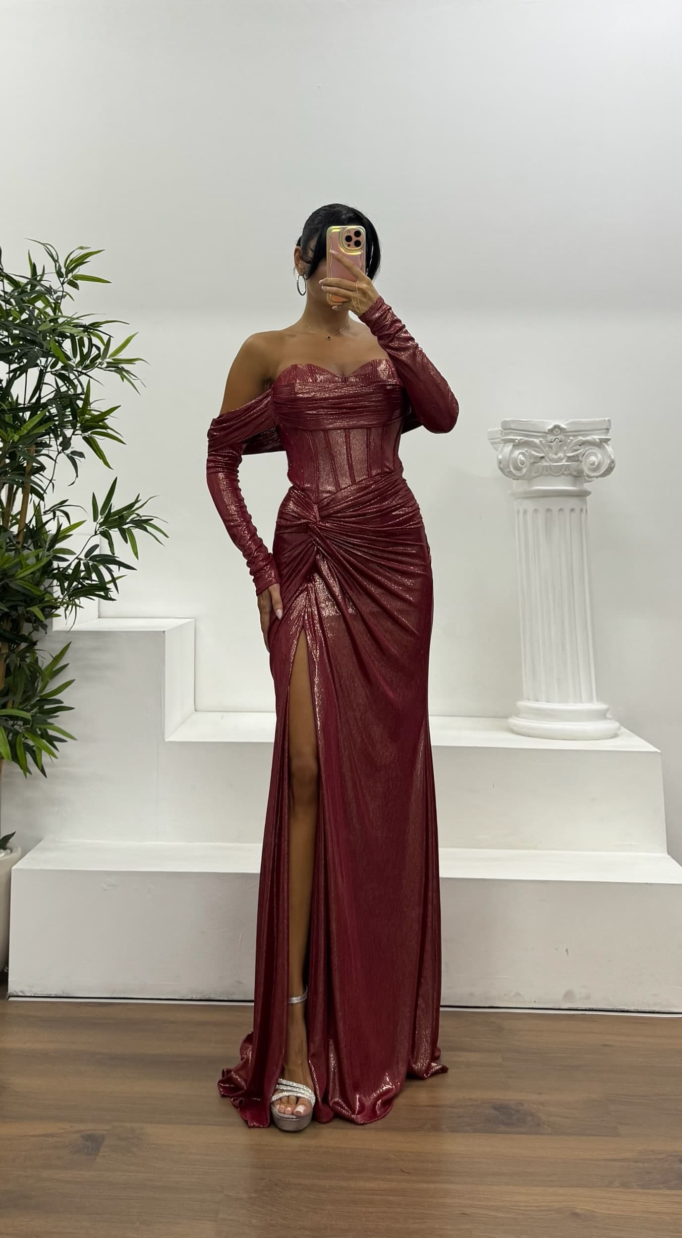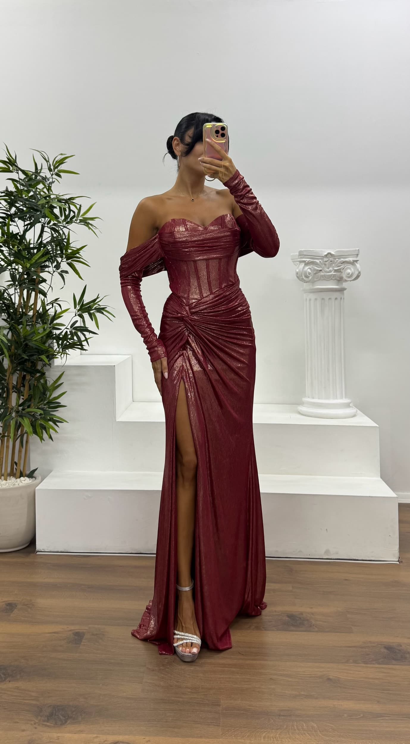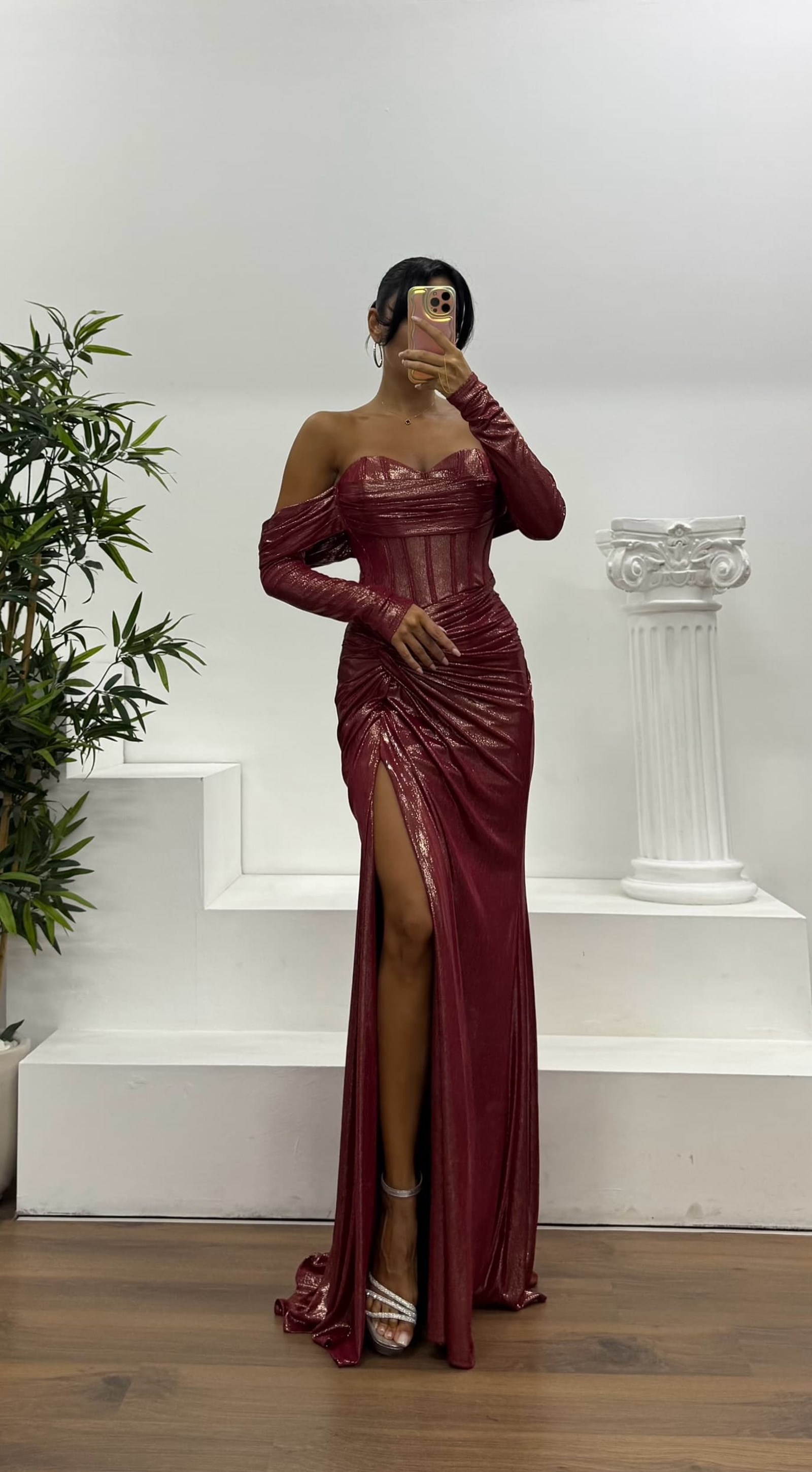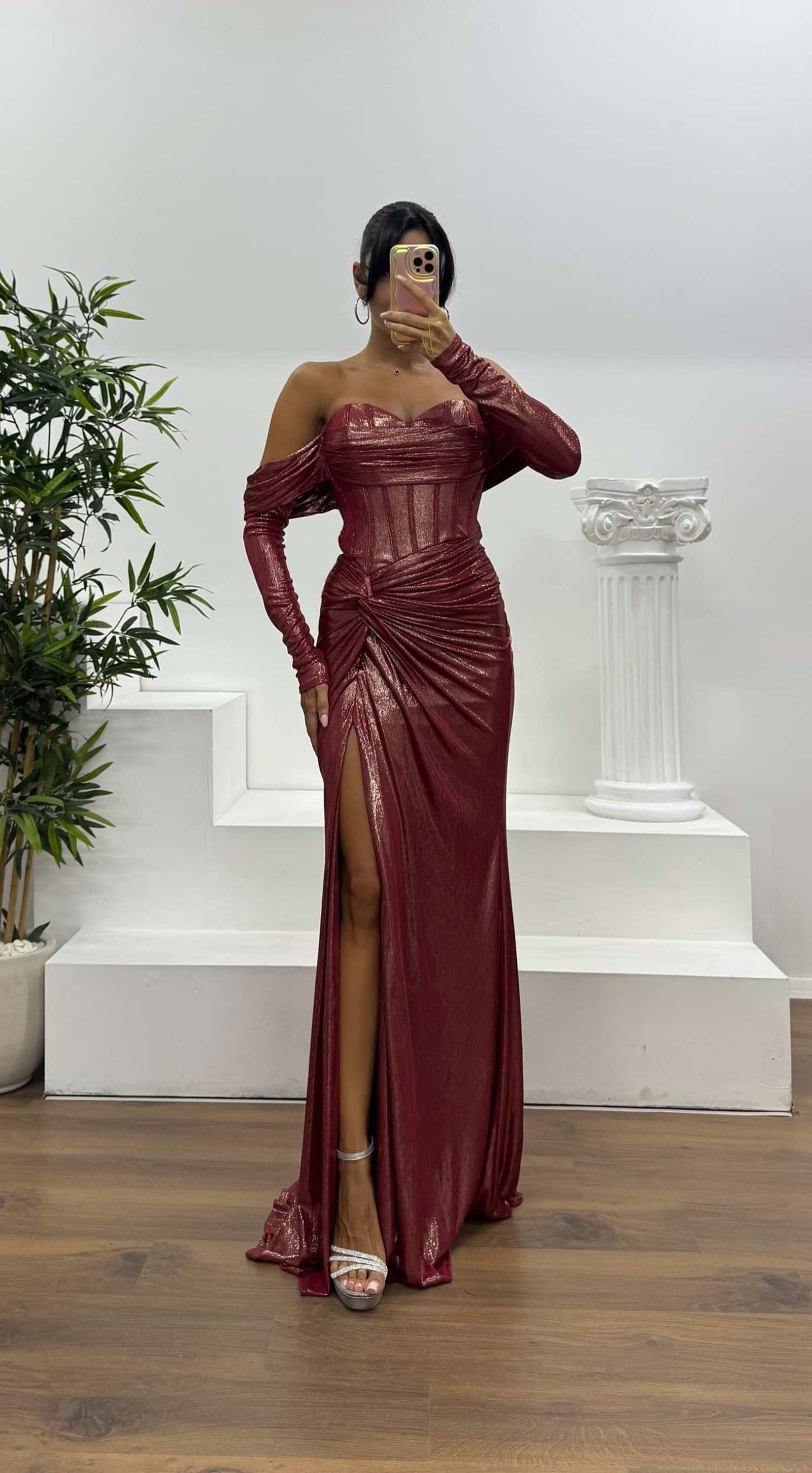 • Kemik Straplez Eldivenli Abiye Elbise