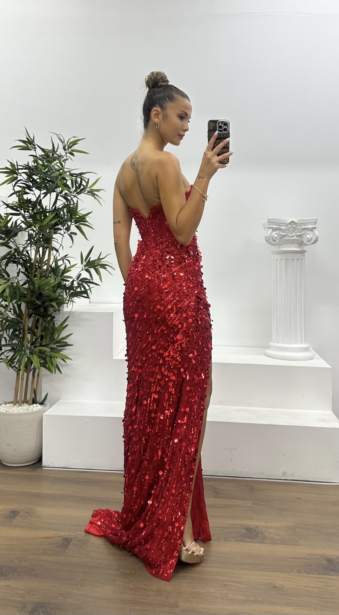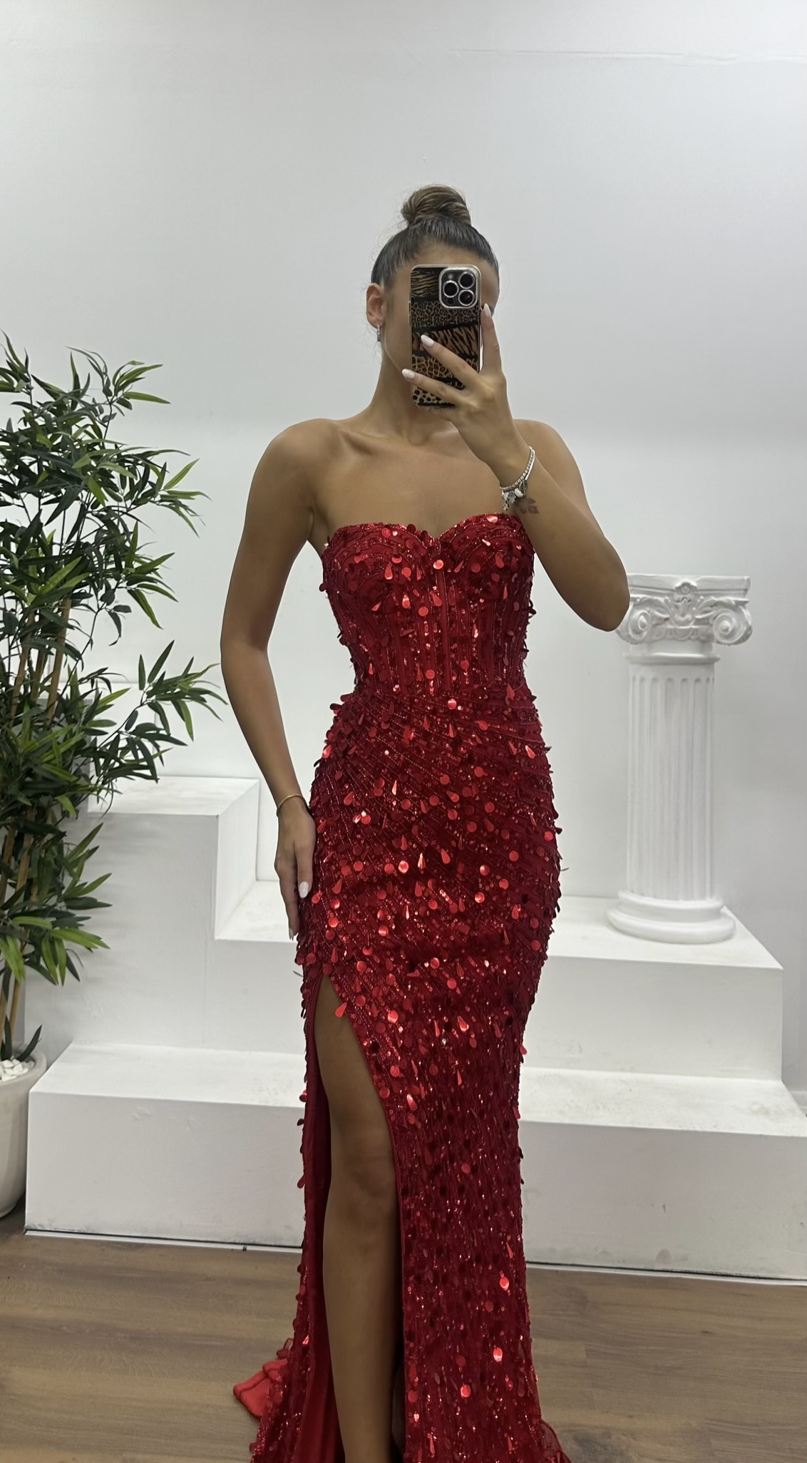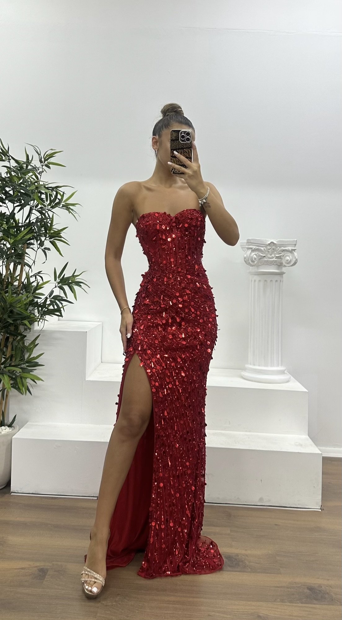 Ürün 36-40 bedene kadar uyumlu, göğüs pedli, astarlı, arka kapama fermuar, yırtmaçlı abiye olarak tasarlanmıştır.