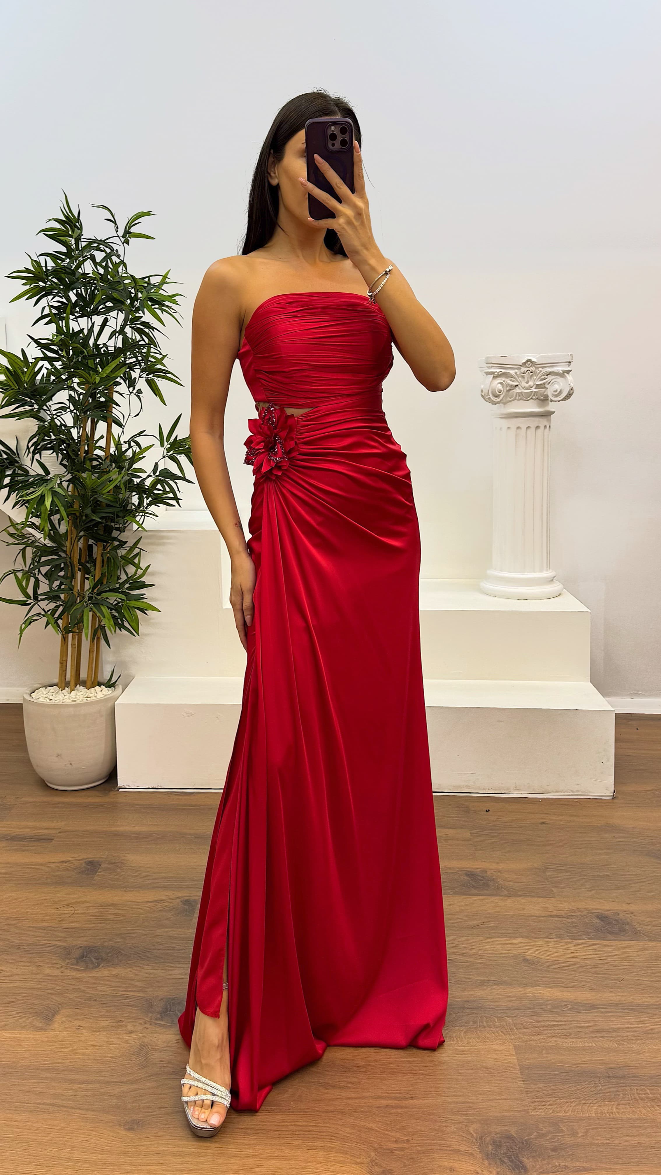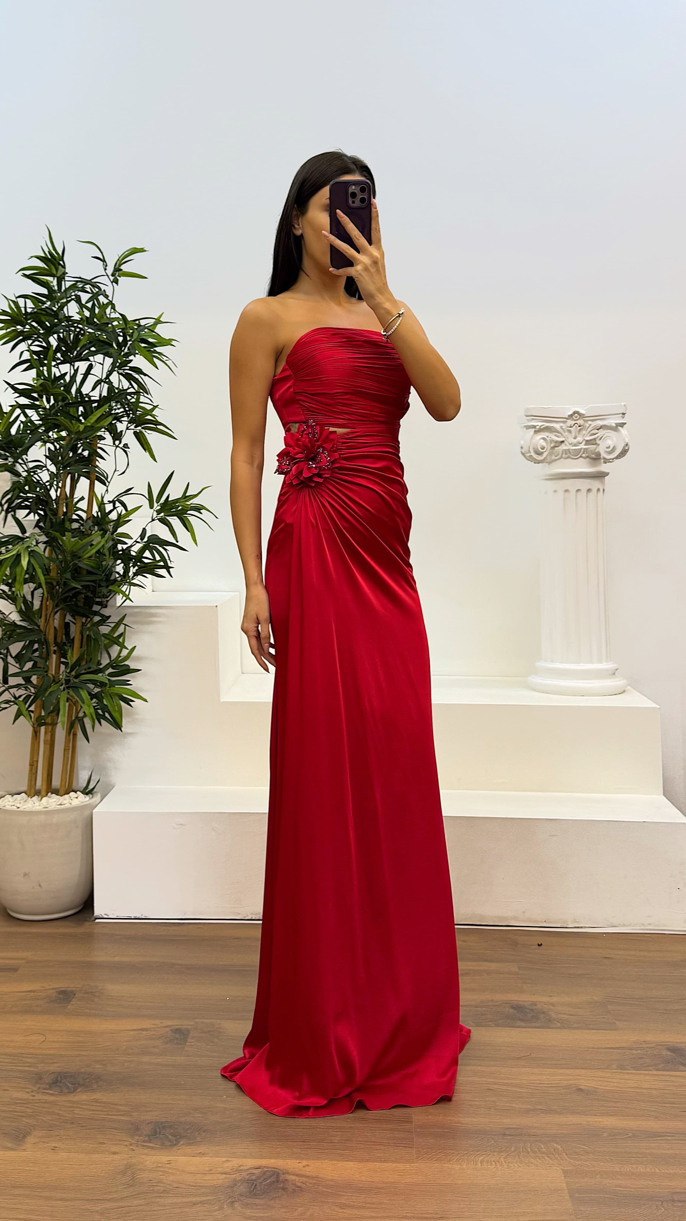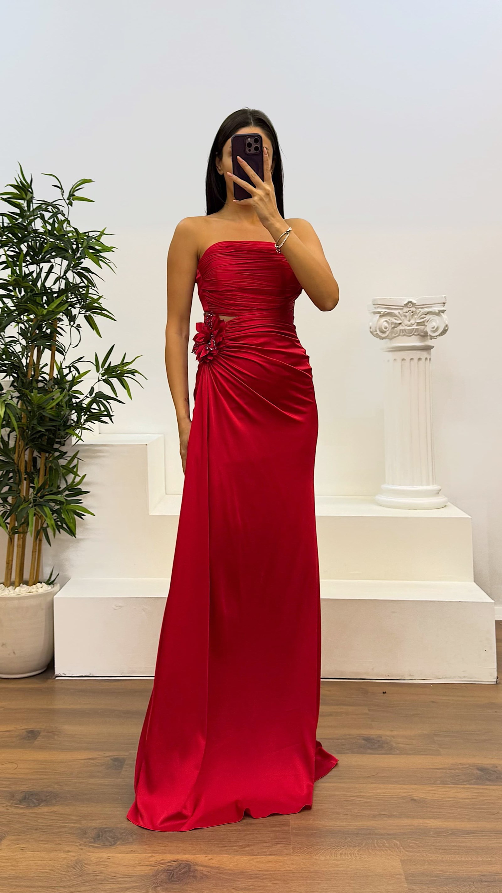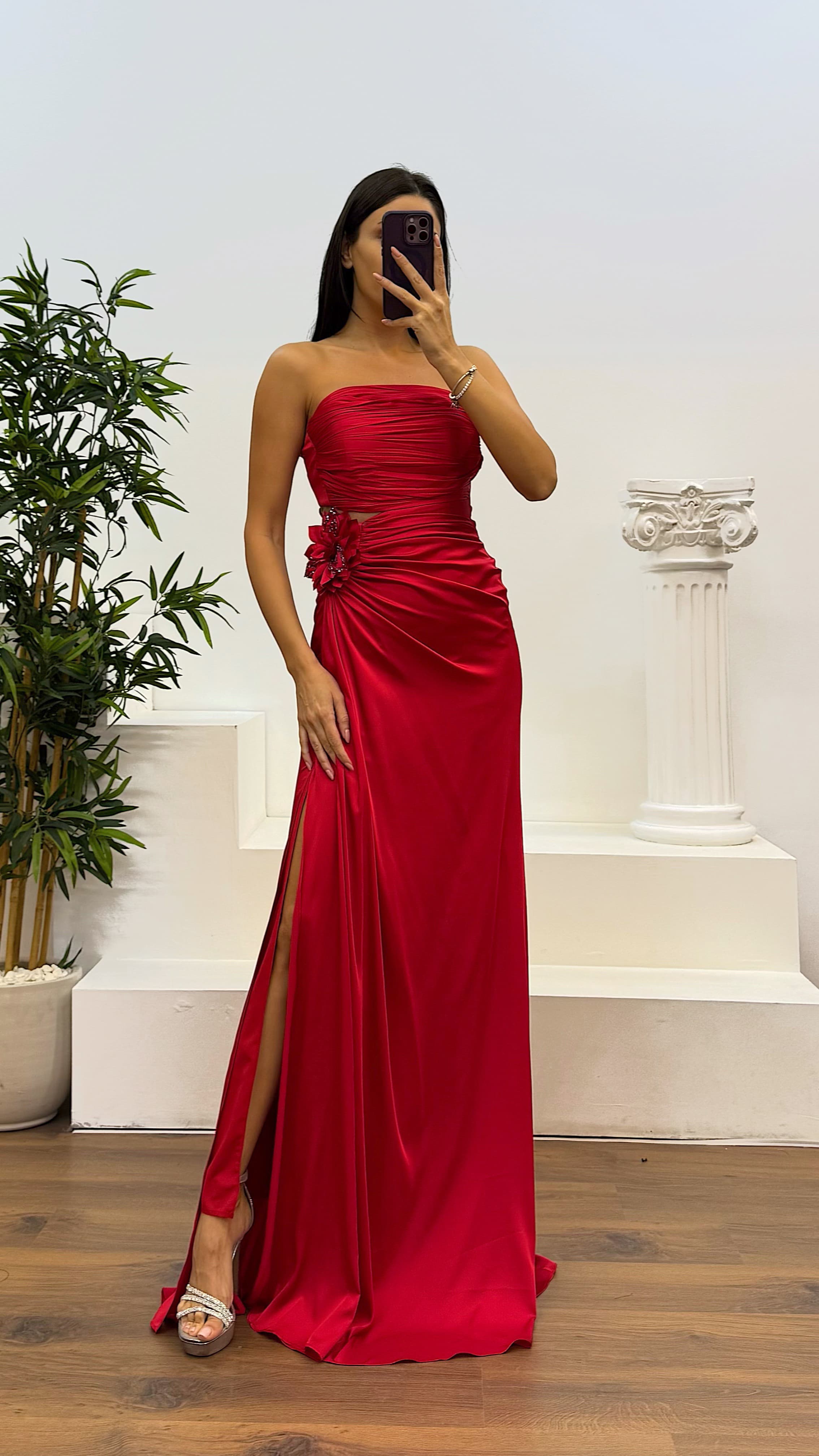 Ürün 36-42 bedene kadar uyumlu, göğüs pedli, astarlı, arka kapama fermuar, yırtmaçlı, çiçek detay abiye olarak tasarlanmıştır.