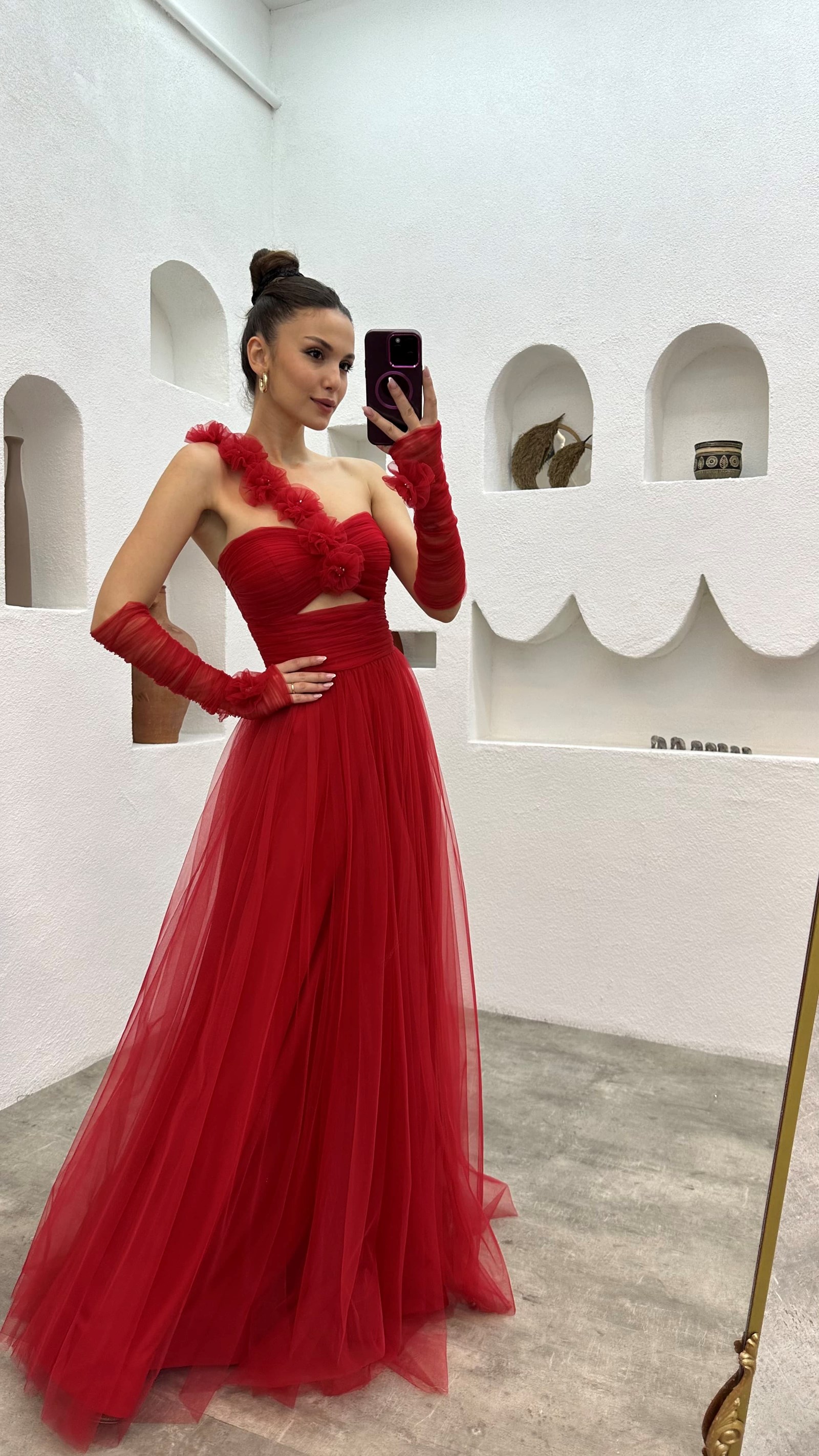 • Kırmızı Tek Kol Çiçekli Tül Abiye