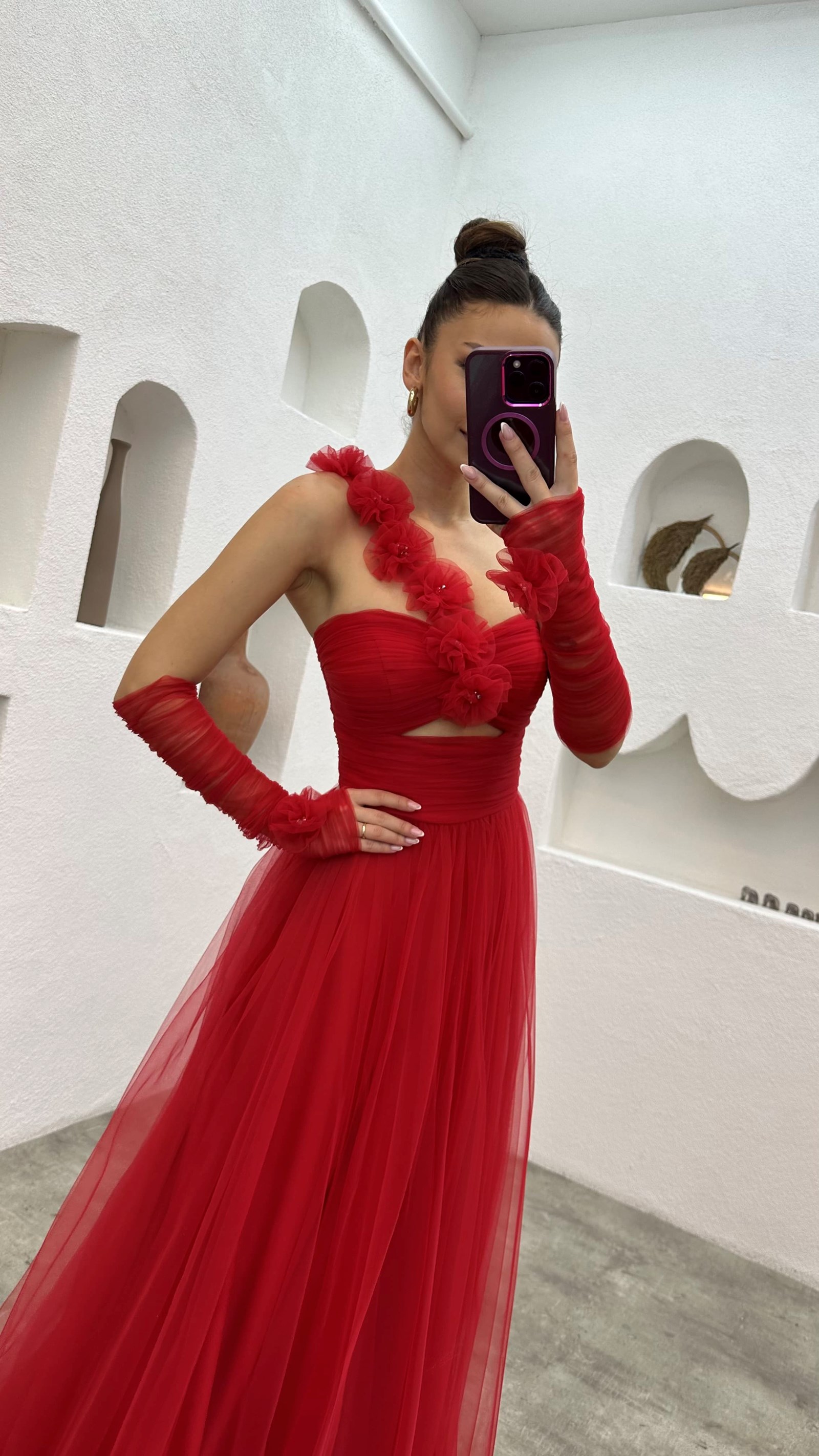 Kırmızı Tek Kol Çiçekli Tül Abiye