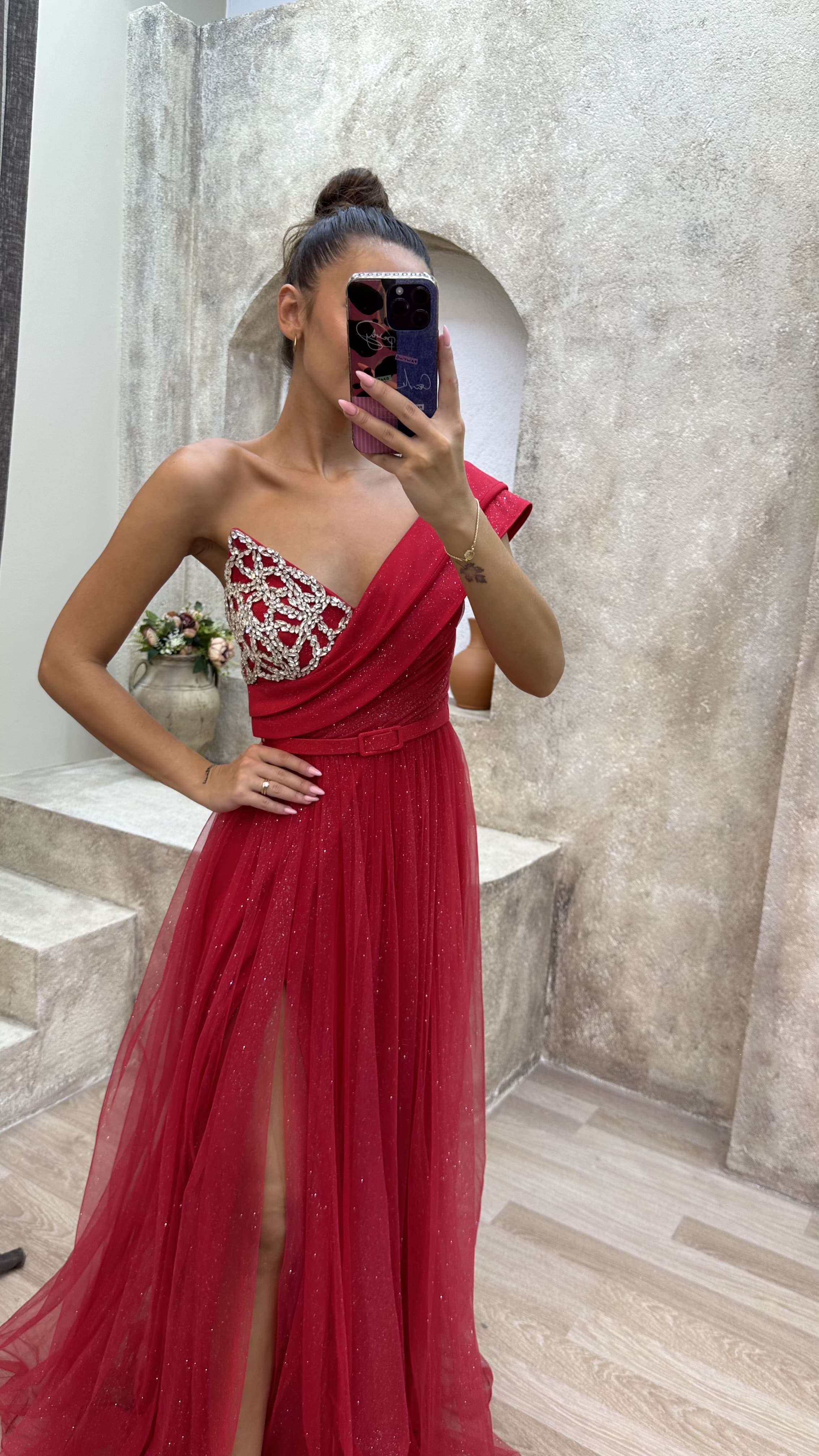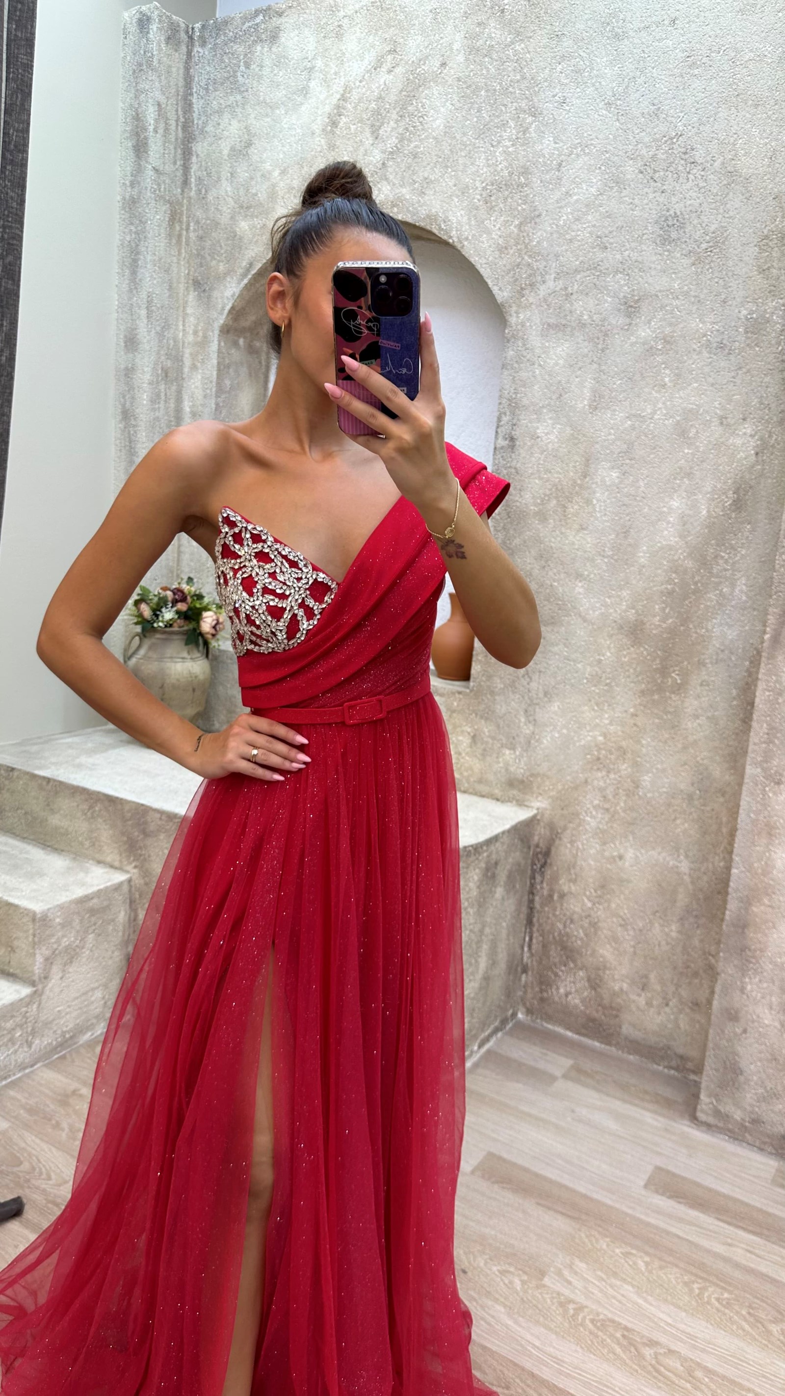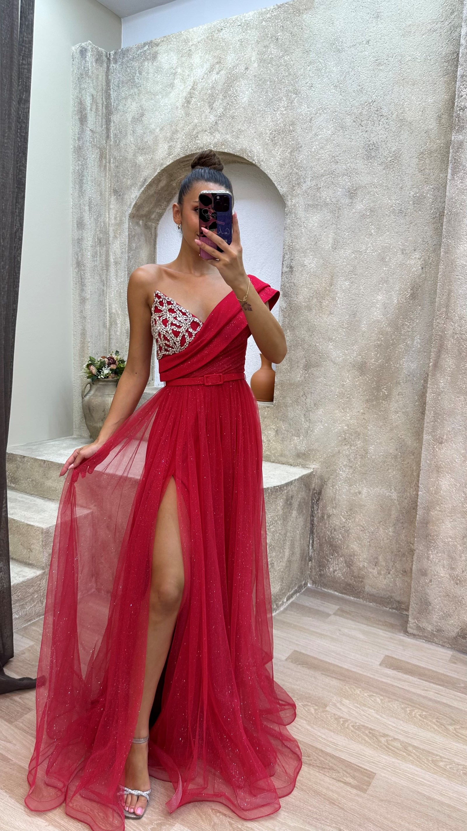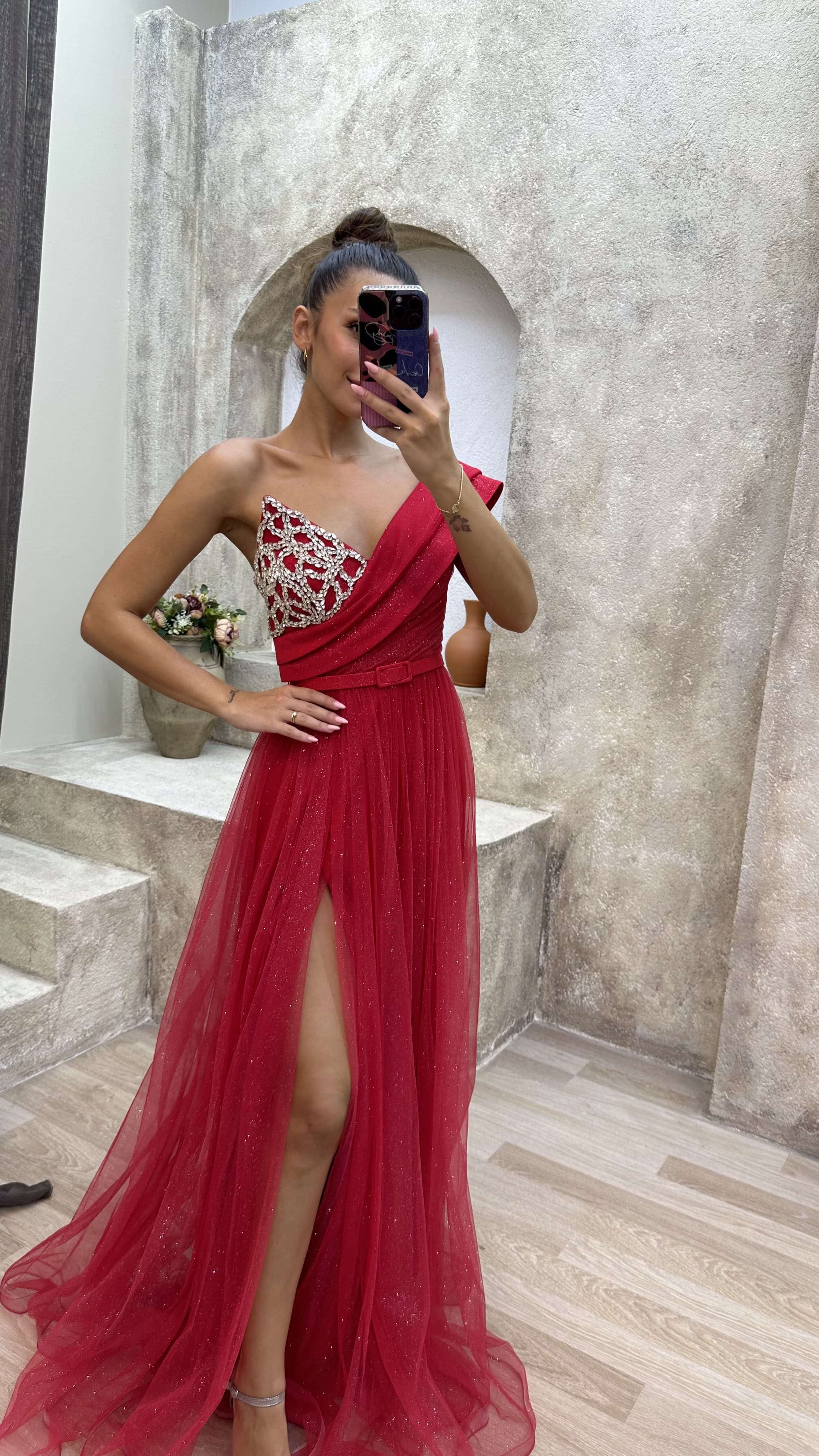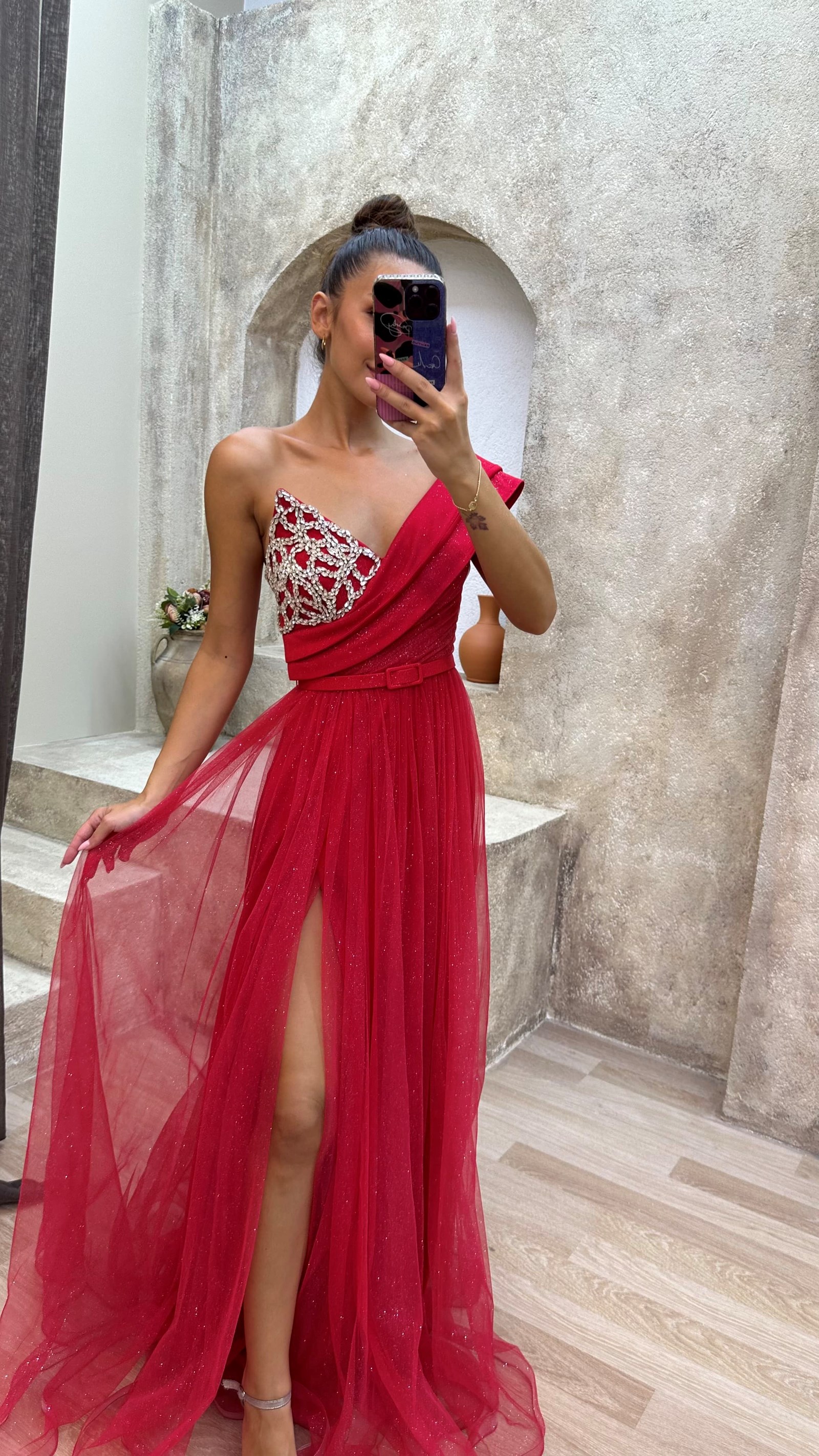 • Kırmızı Tek Omuz Yırtmaçlı İşlemeli Tül Abiye Elbise