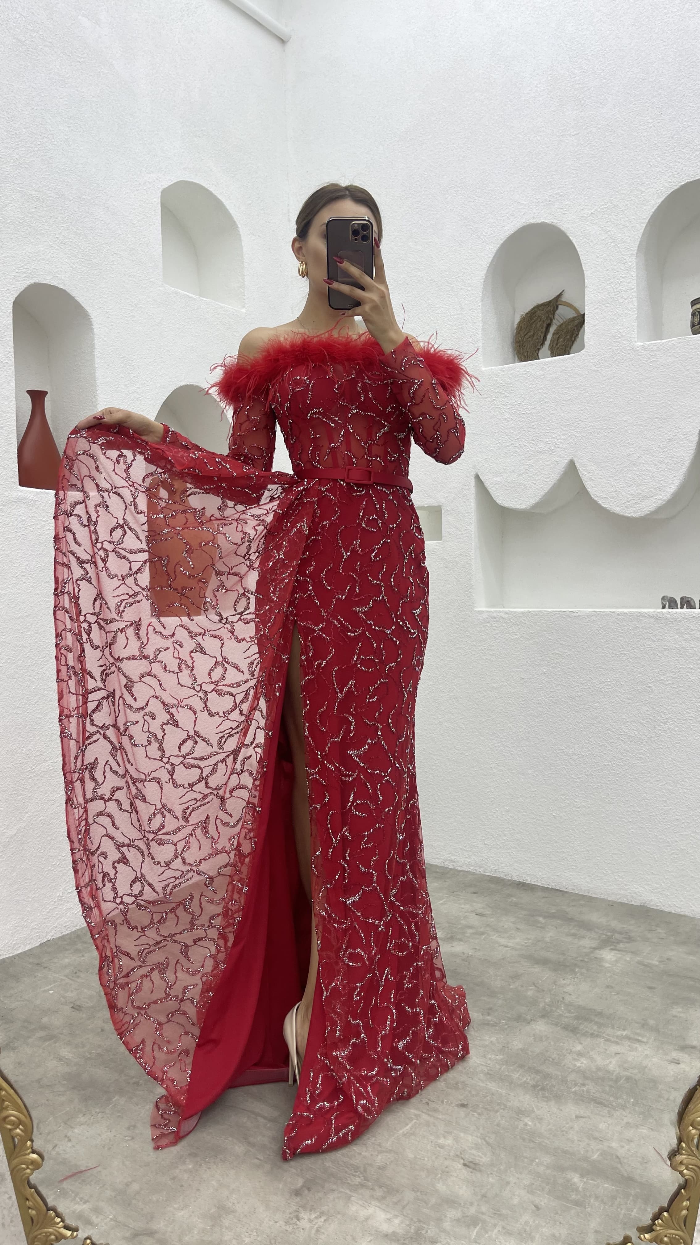 • Kırmızı Tüy Detay Simli Volanlı Abiye Elbise