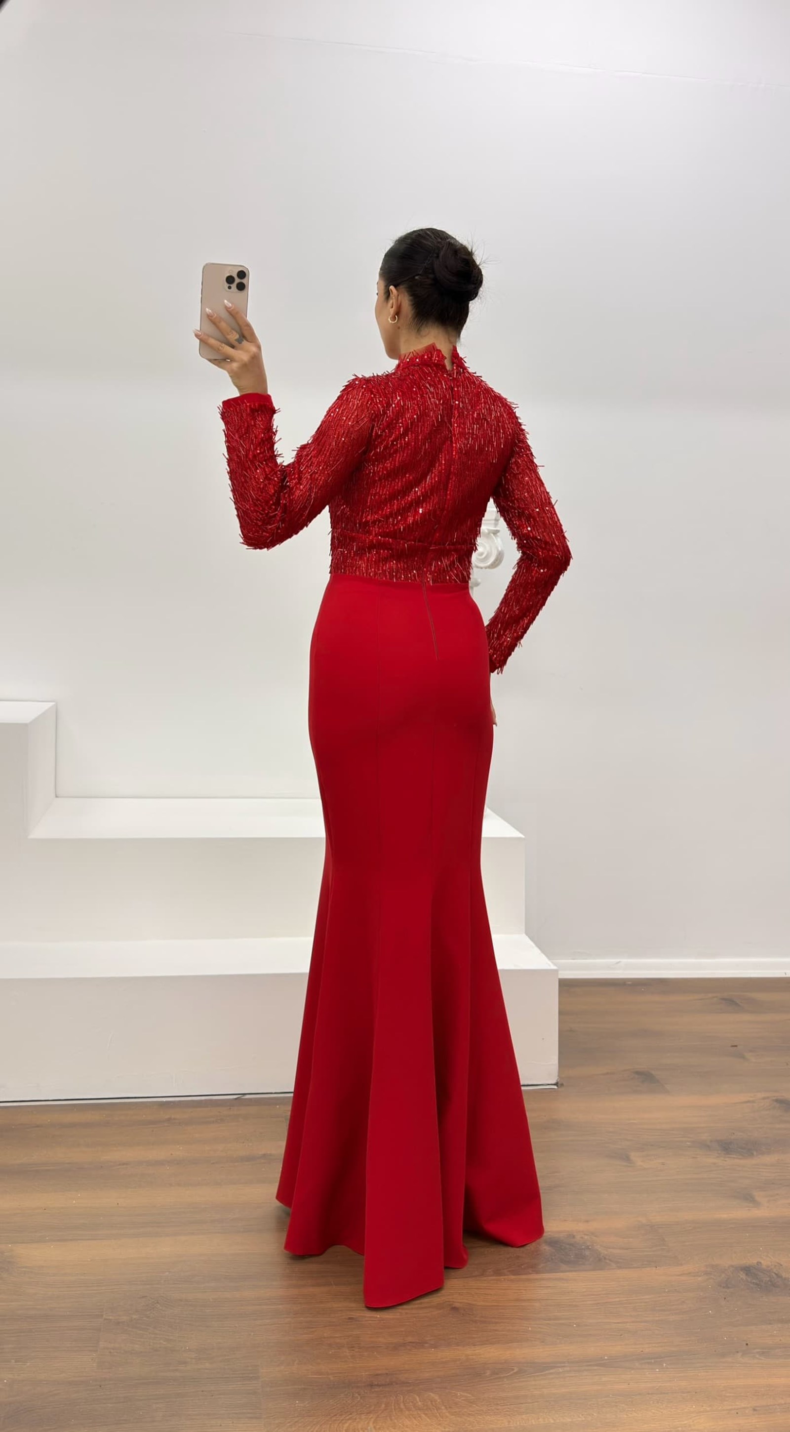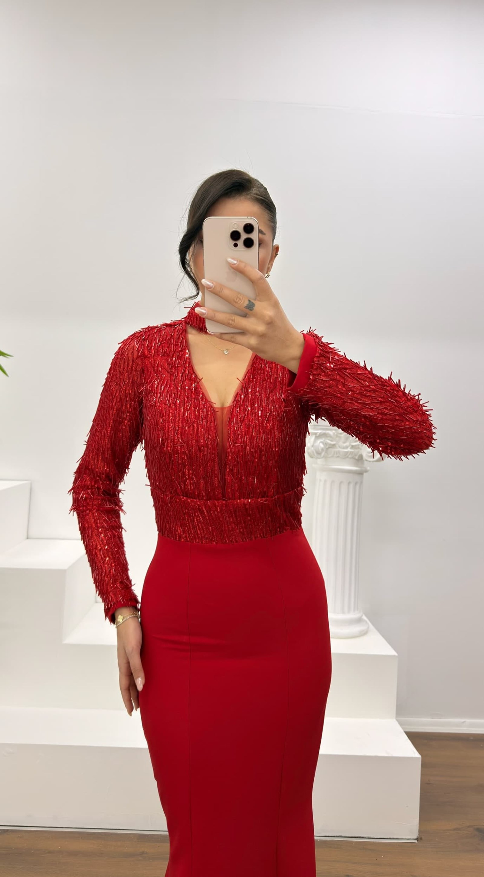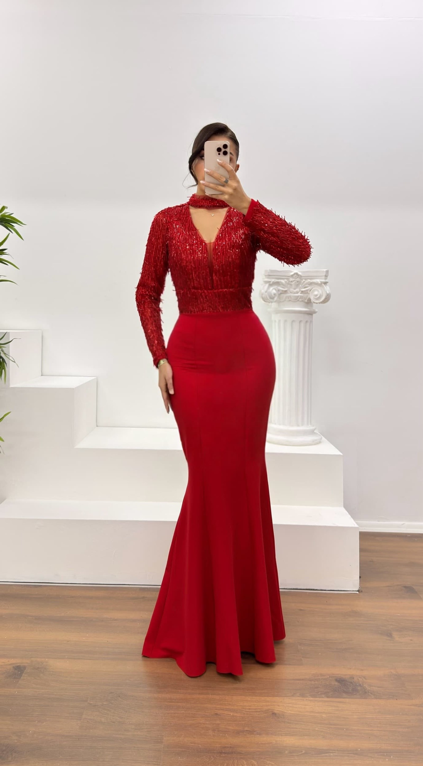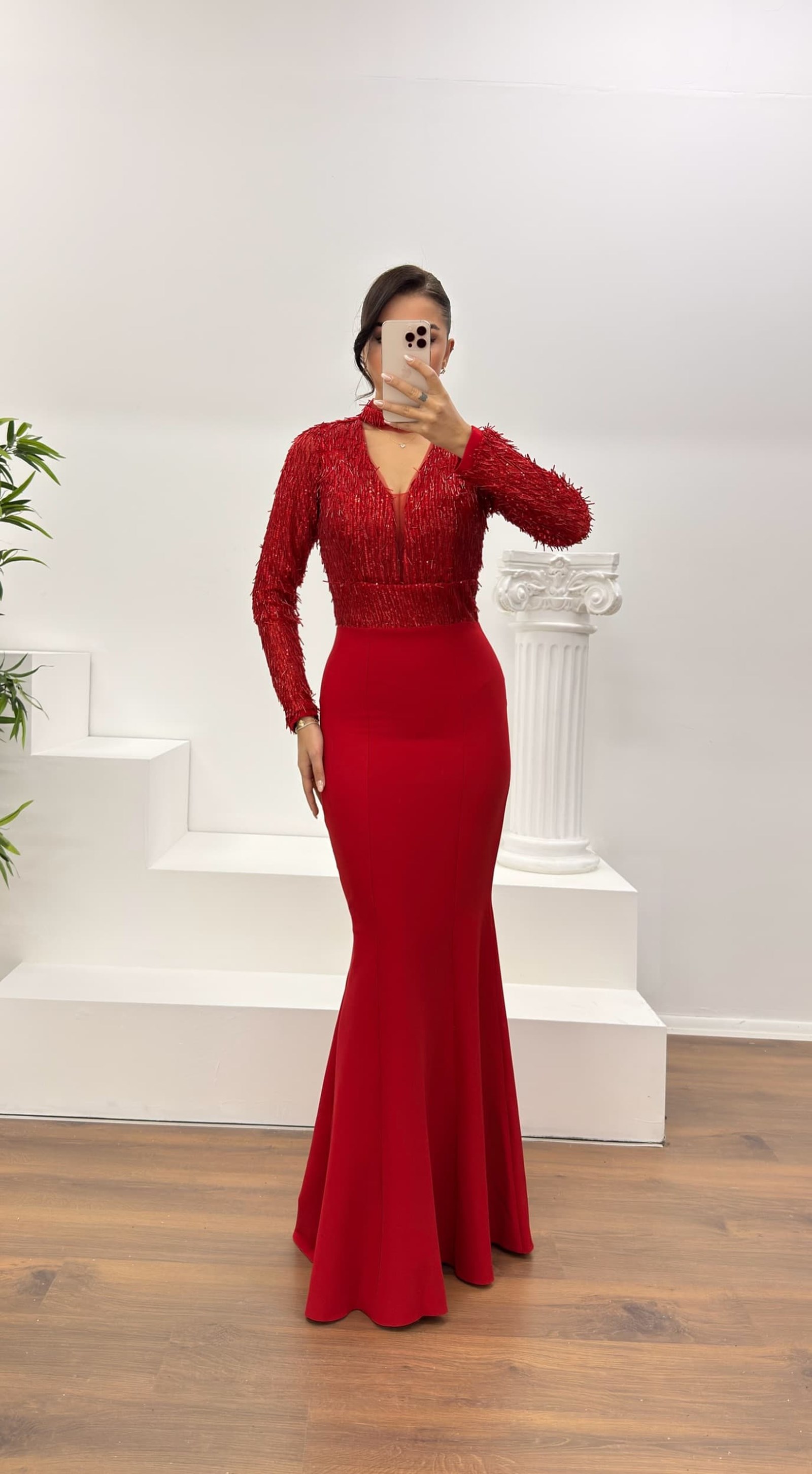 • Kırmızı Uzun Kollu İşleme Detaylı Abiye Elbise