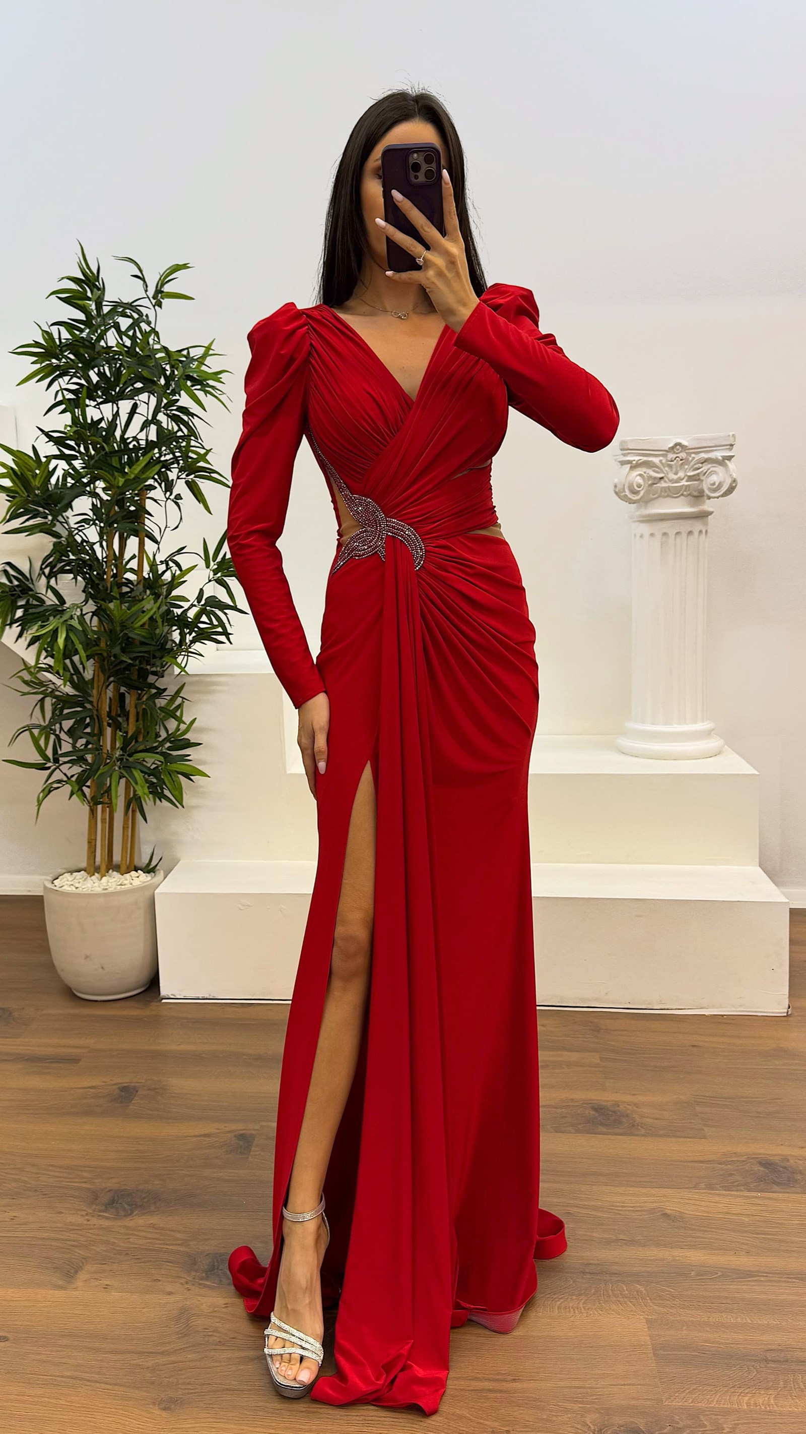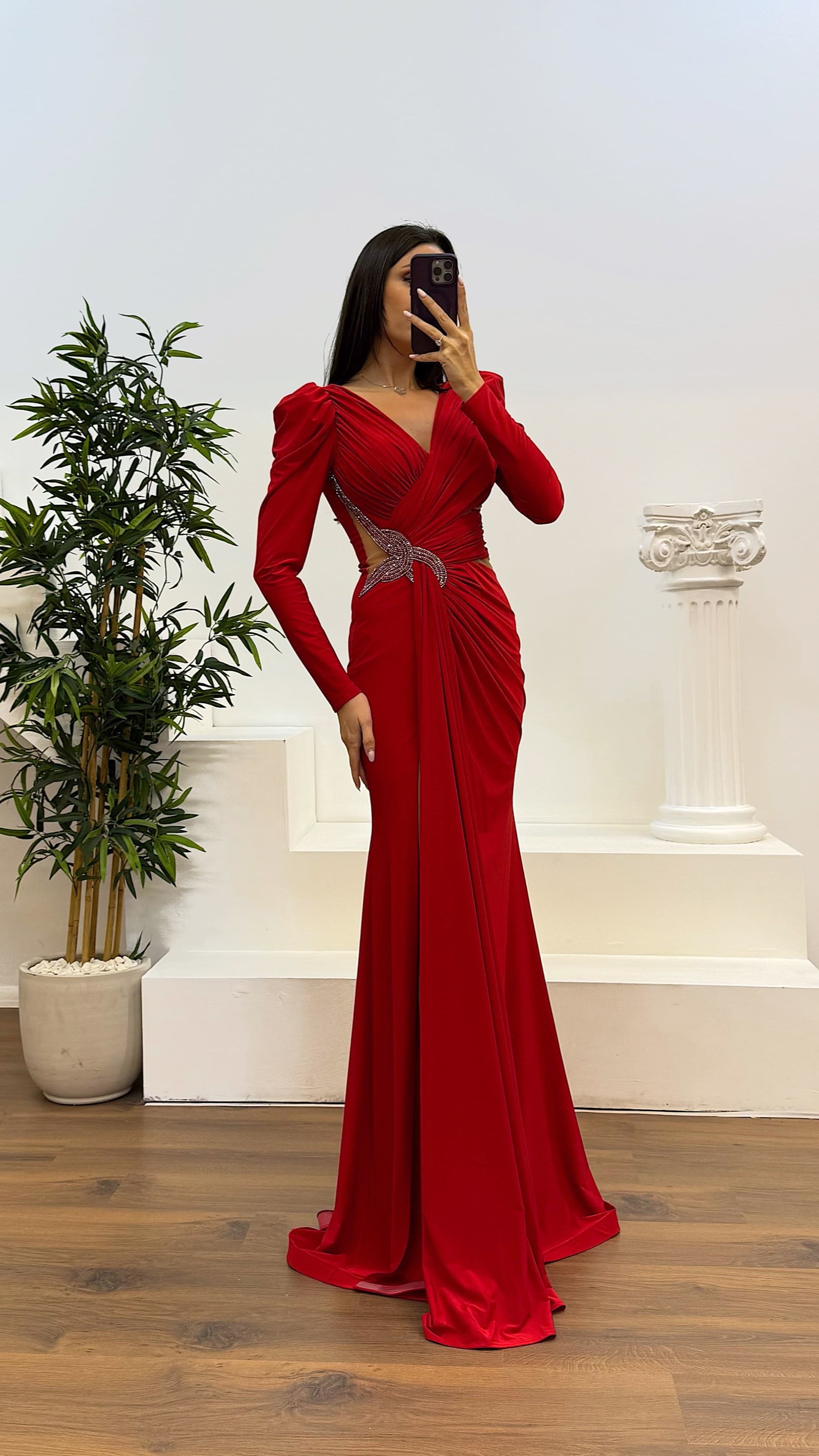 • Kırmızı V Yaka Bel Detay Abiye Elbise