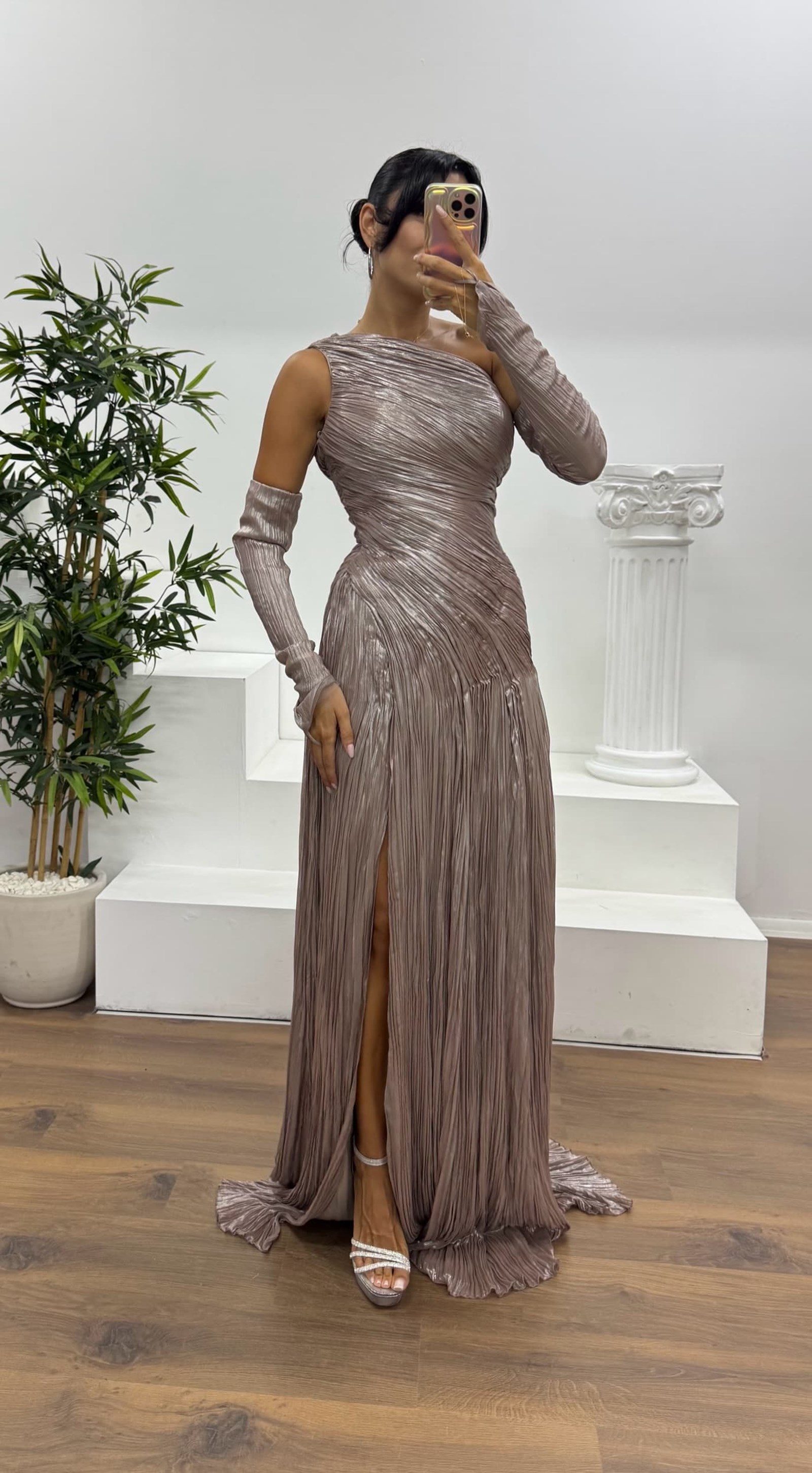 Tek omuz eldivenli abiye elbise