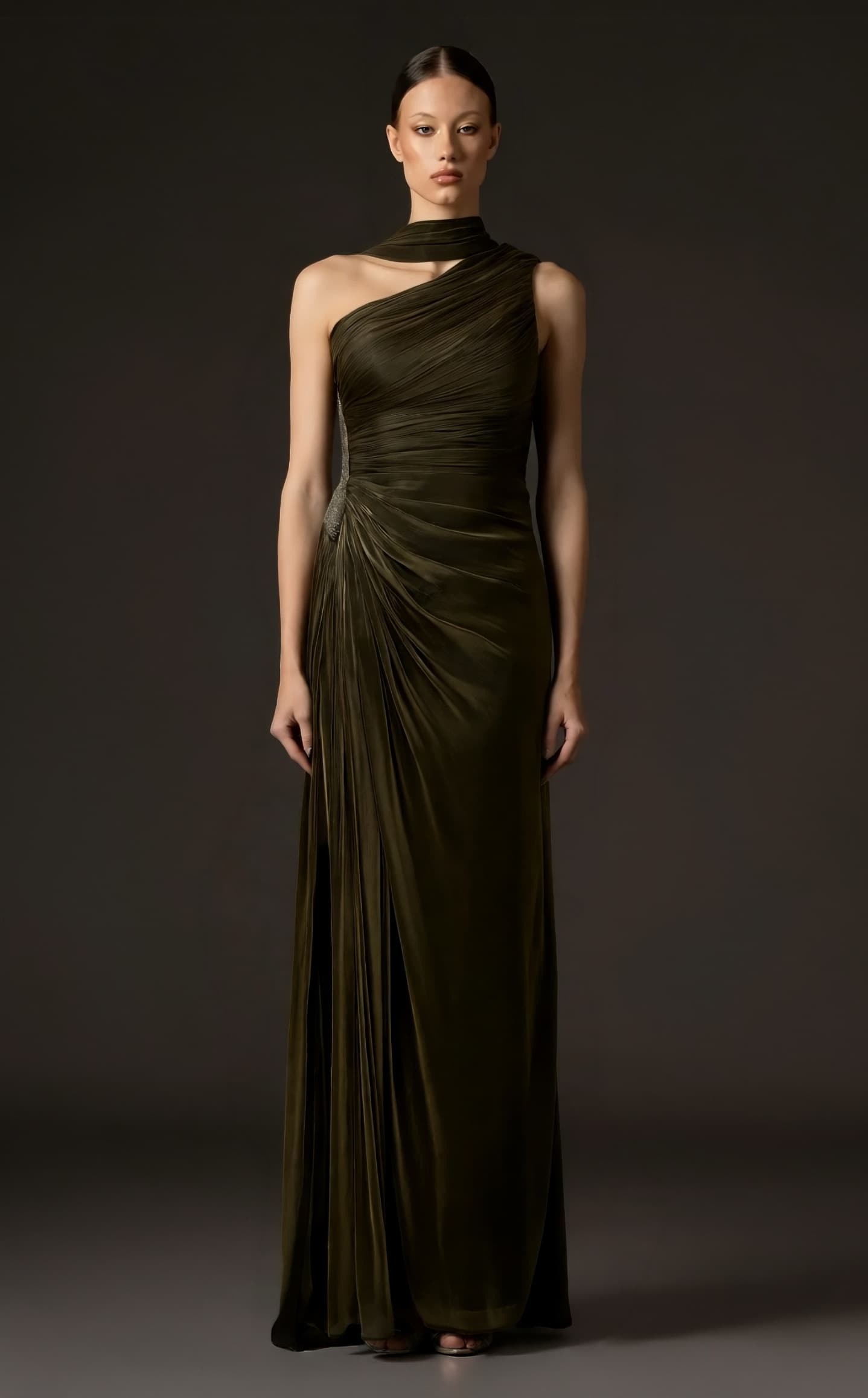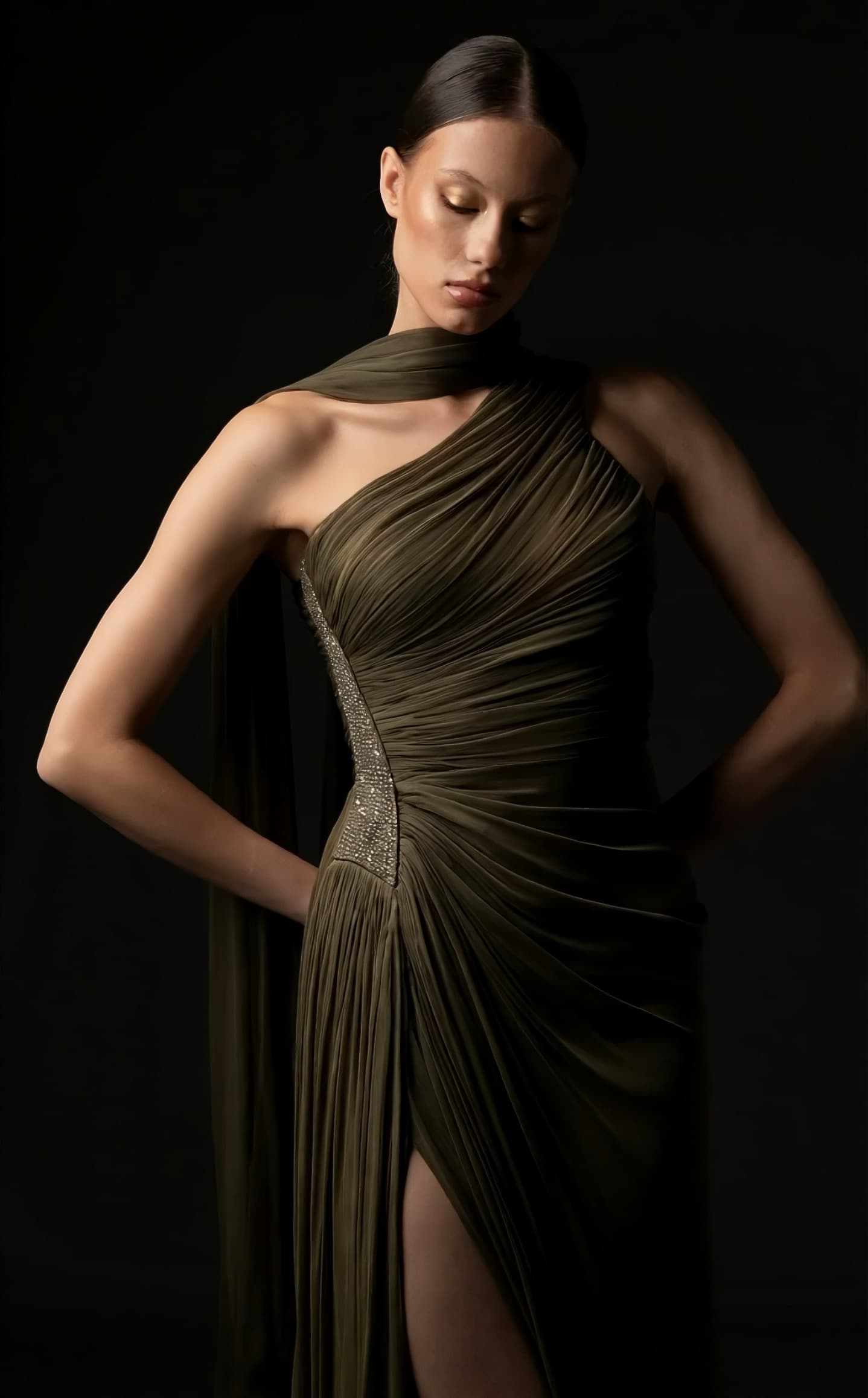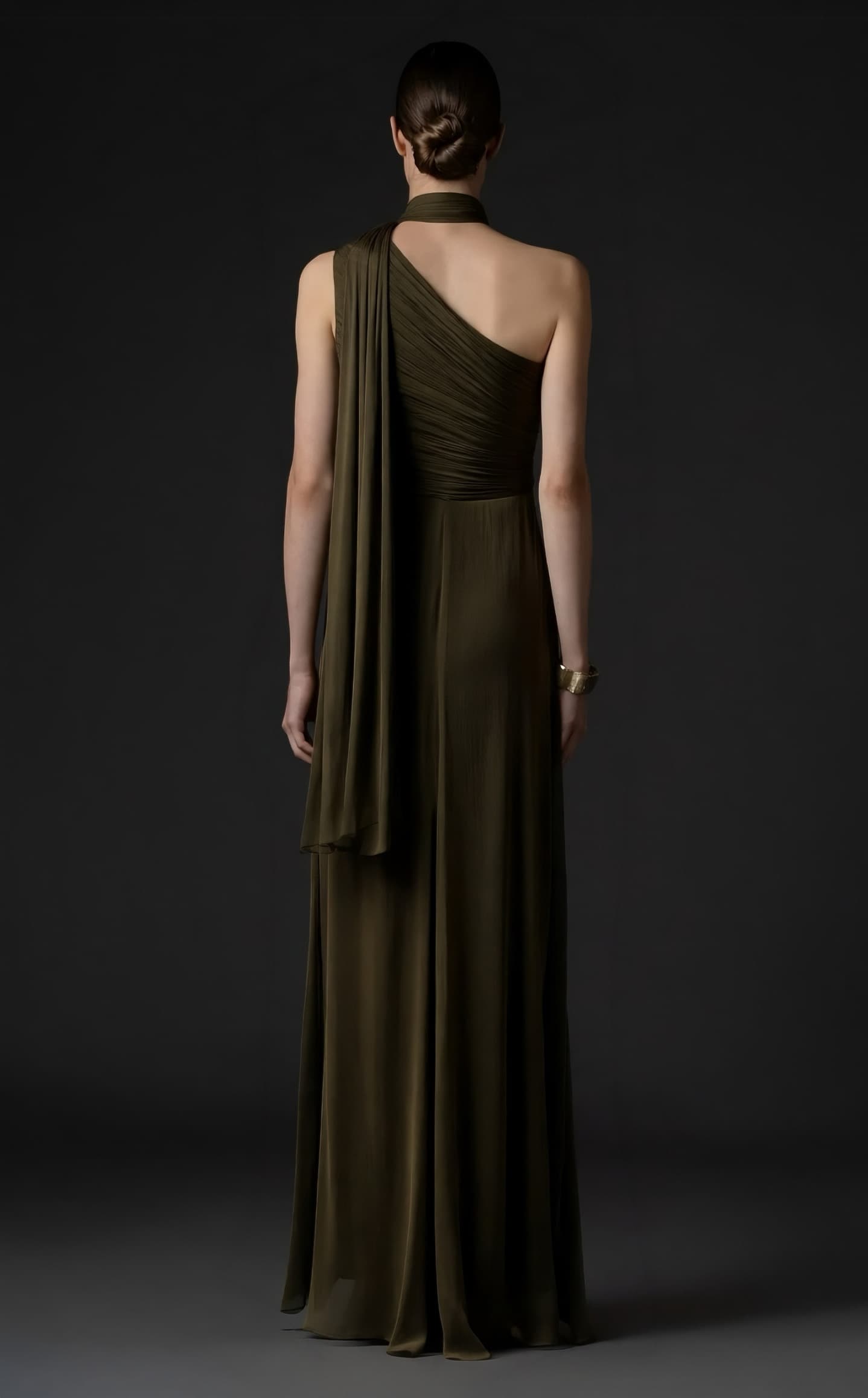 • Koyu Kahve Belden Taş Detaylı Abiye Elbise