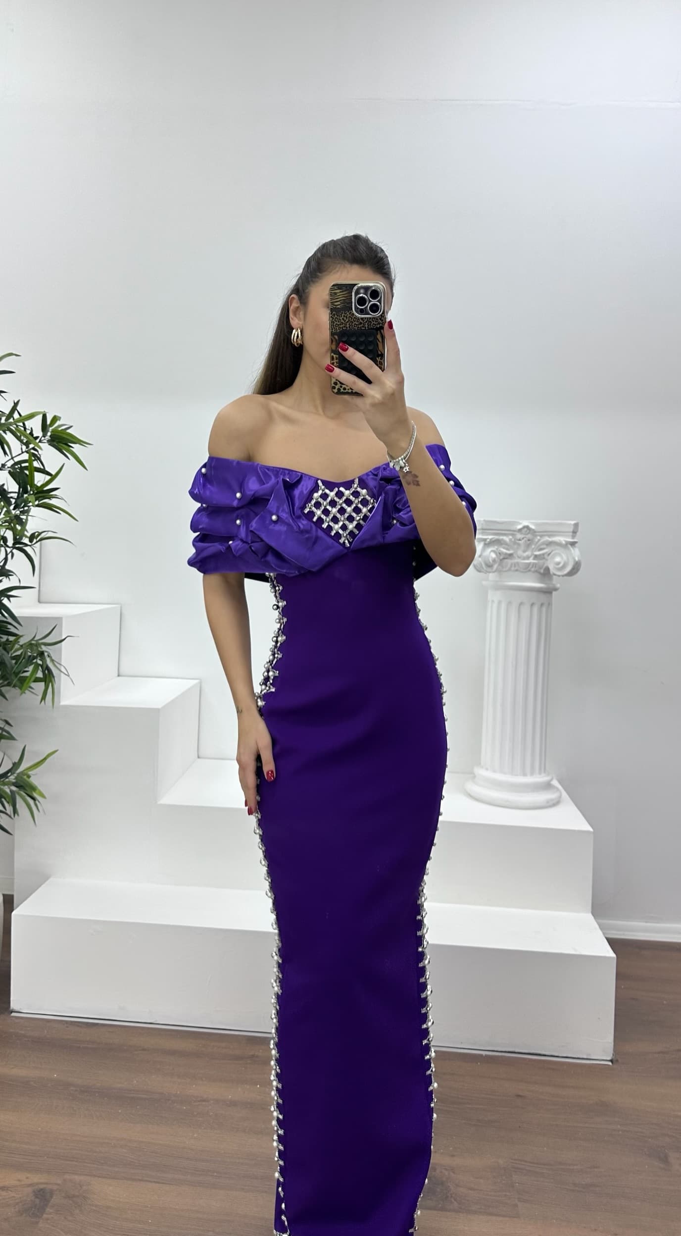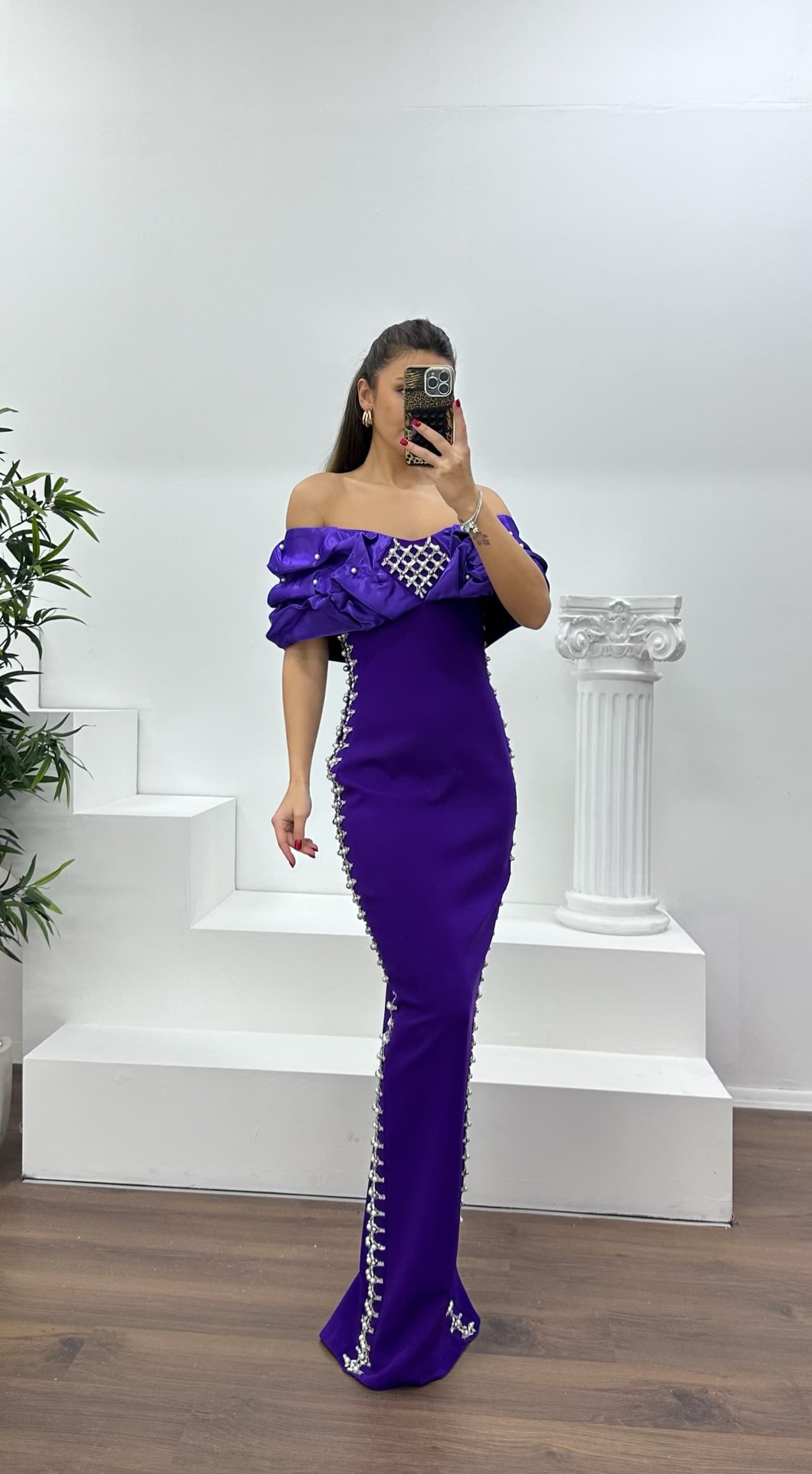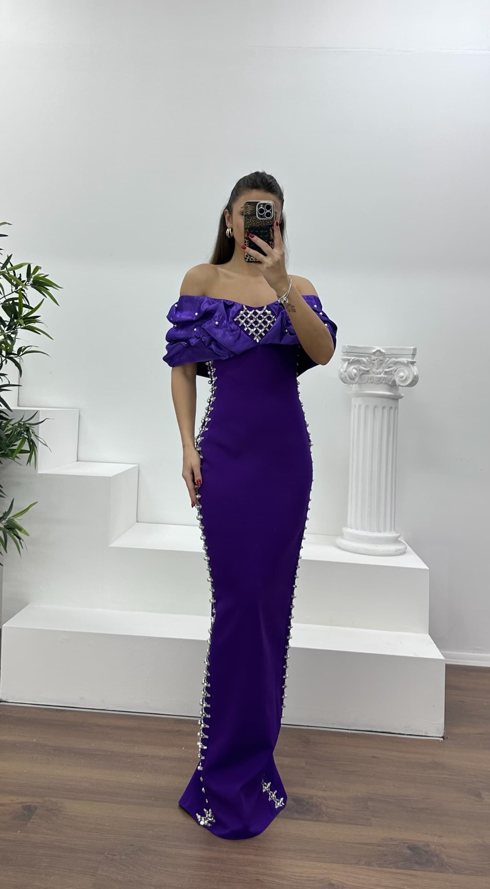 • Koyu Mor Kayık Yaka Taşlı Abiye Elbise