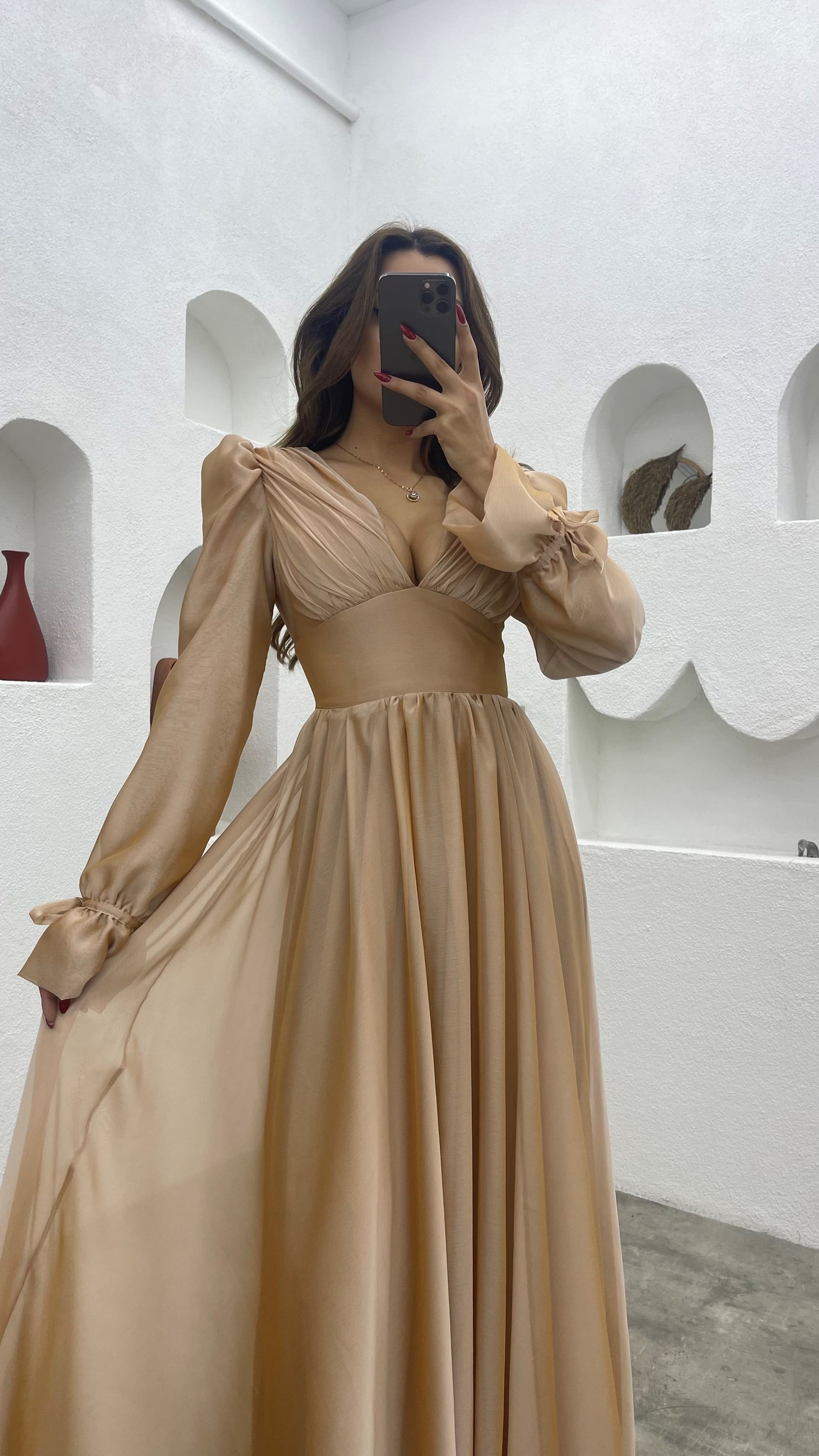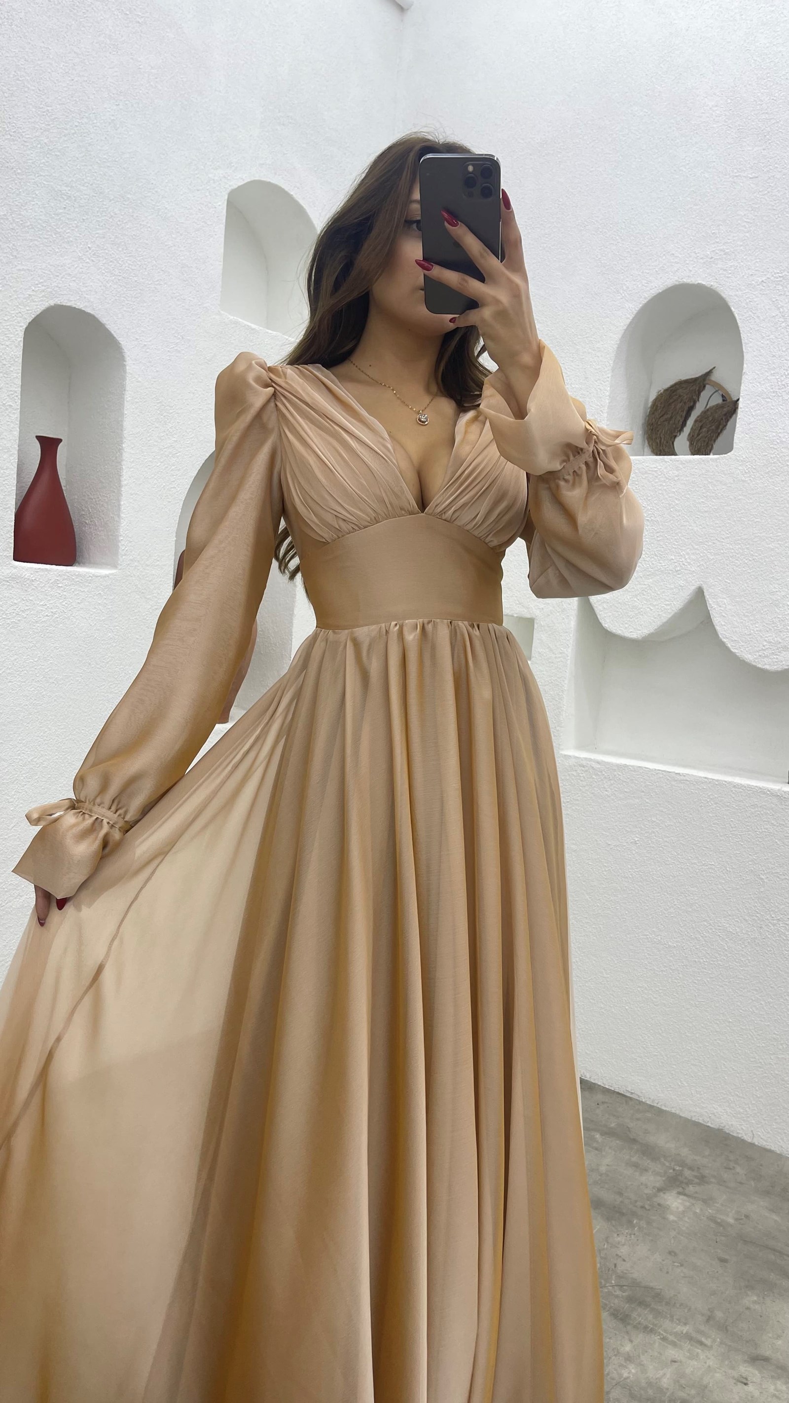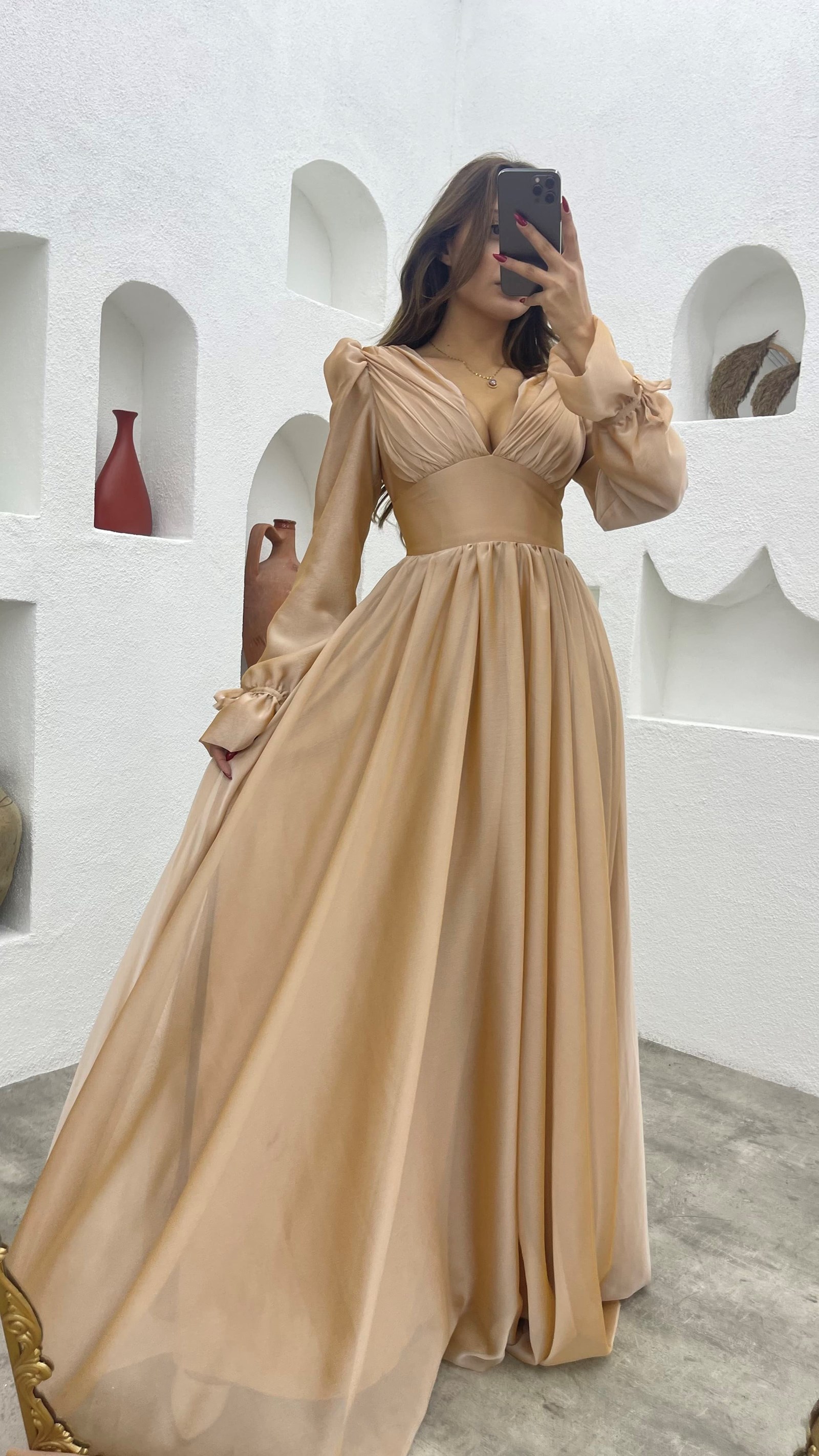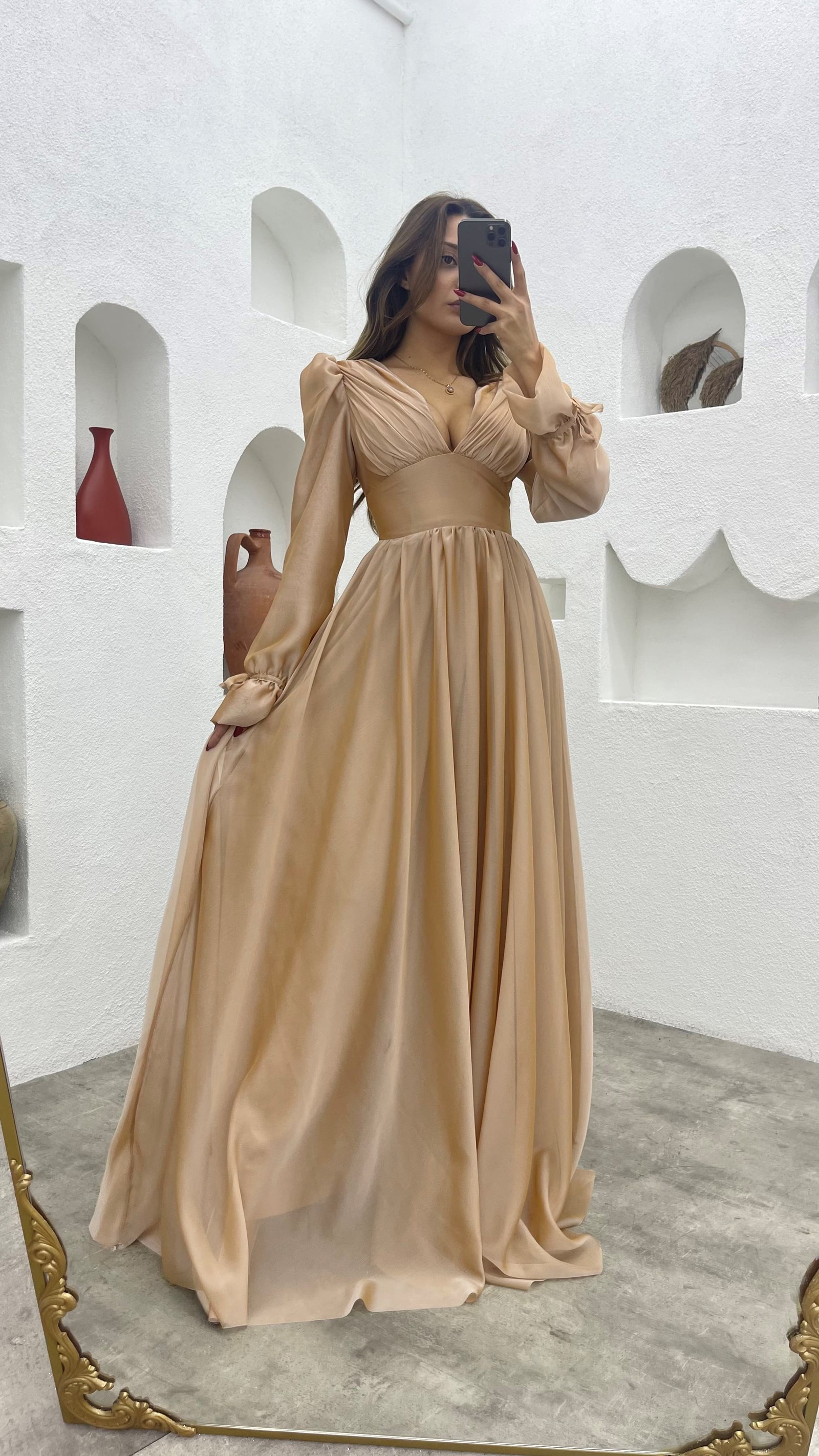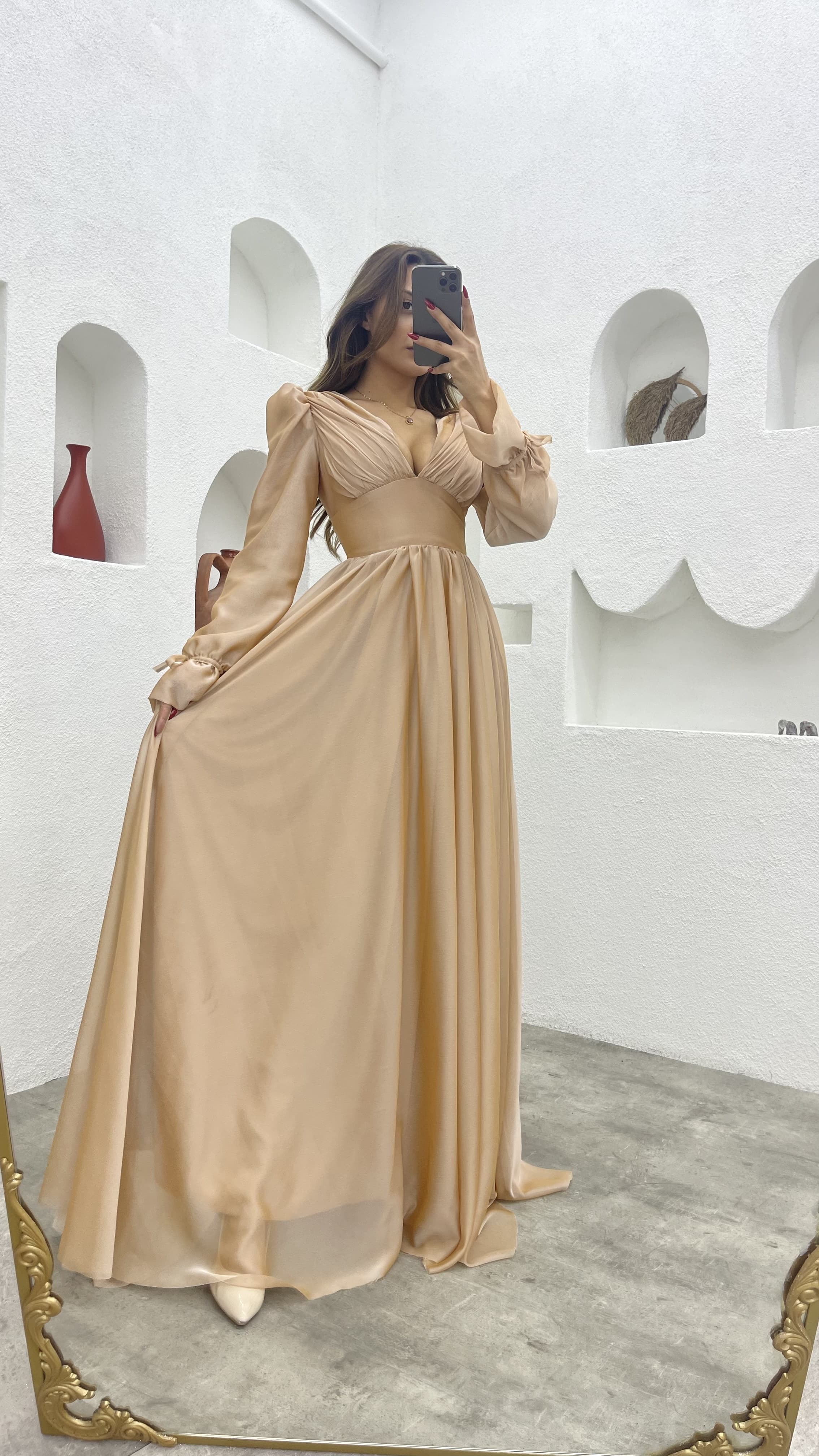 Krem V Yaka Balon Kol Şifon Abiye Elbise