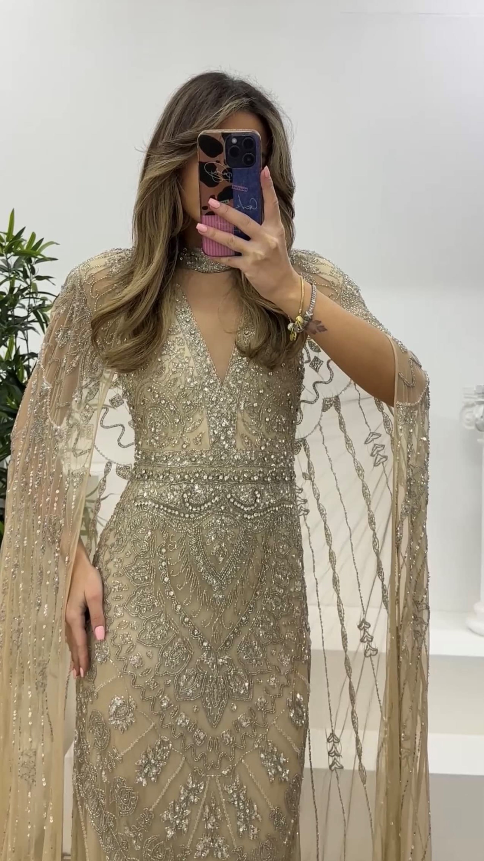 • Krem V Yaka Kısa Kollu, Pelerinli Abiye Elbise