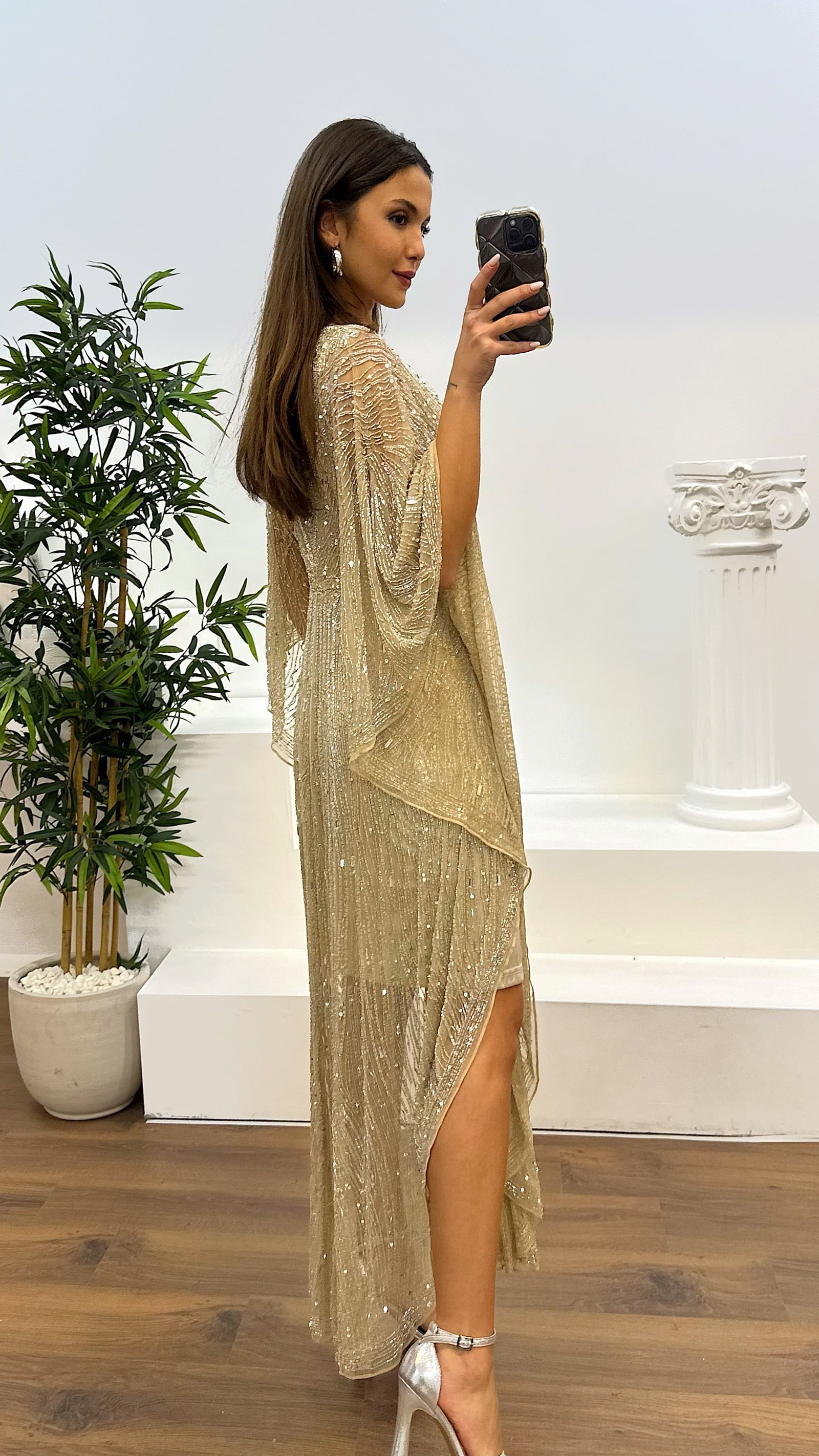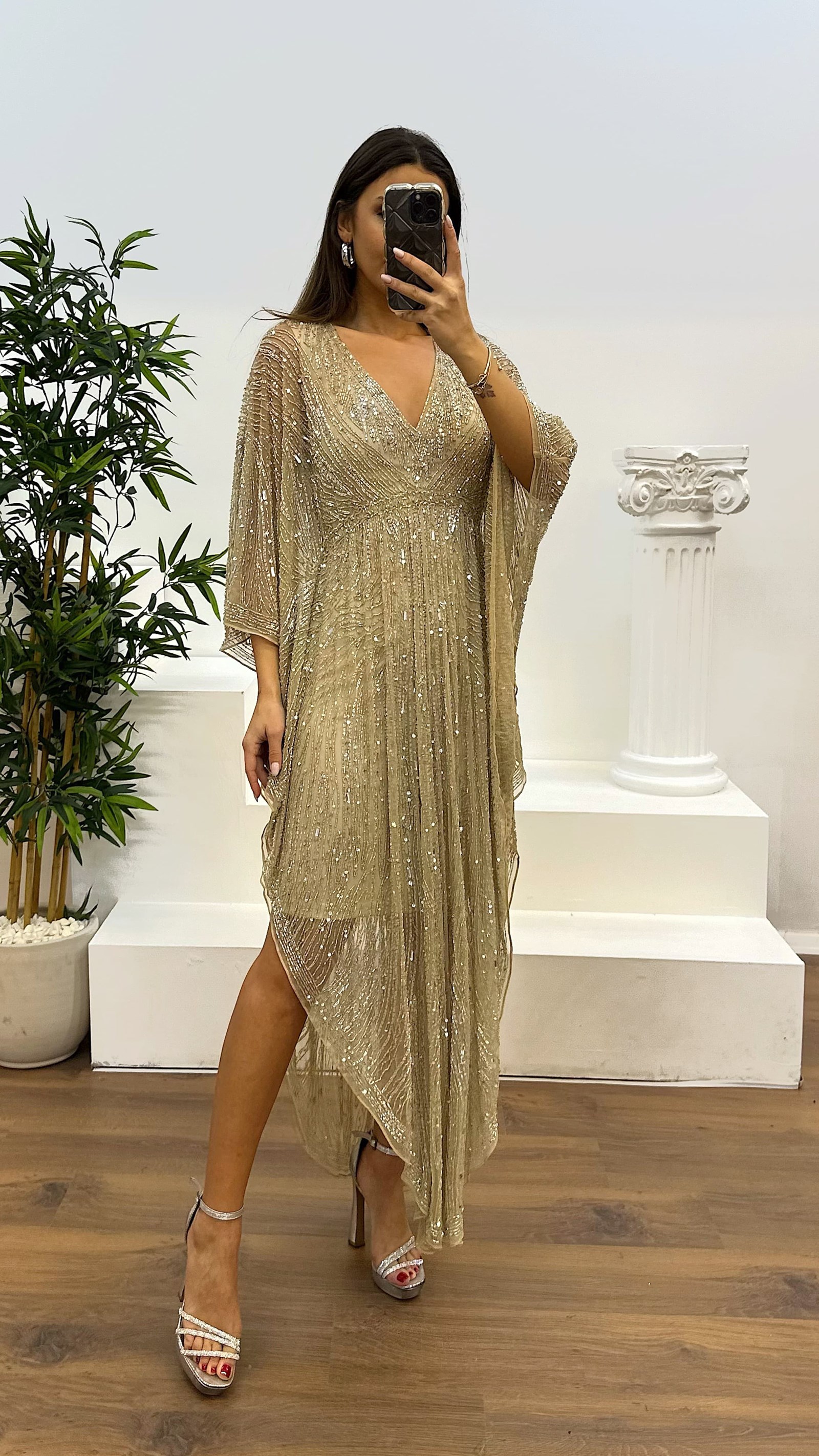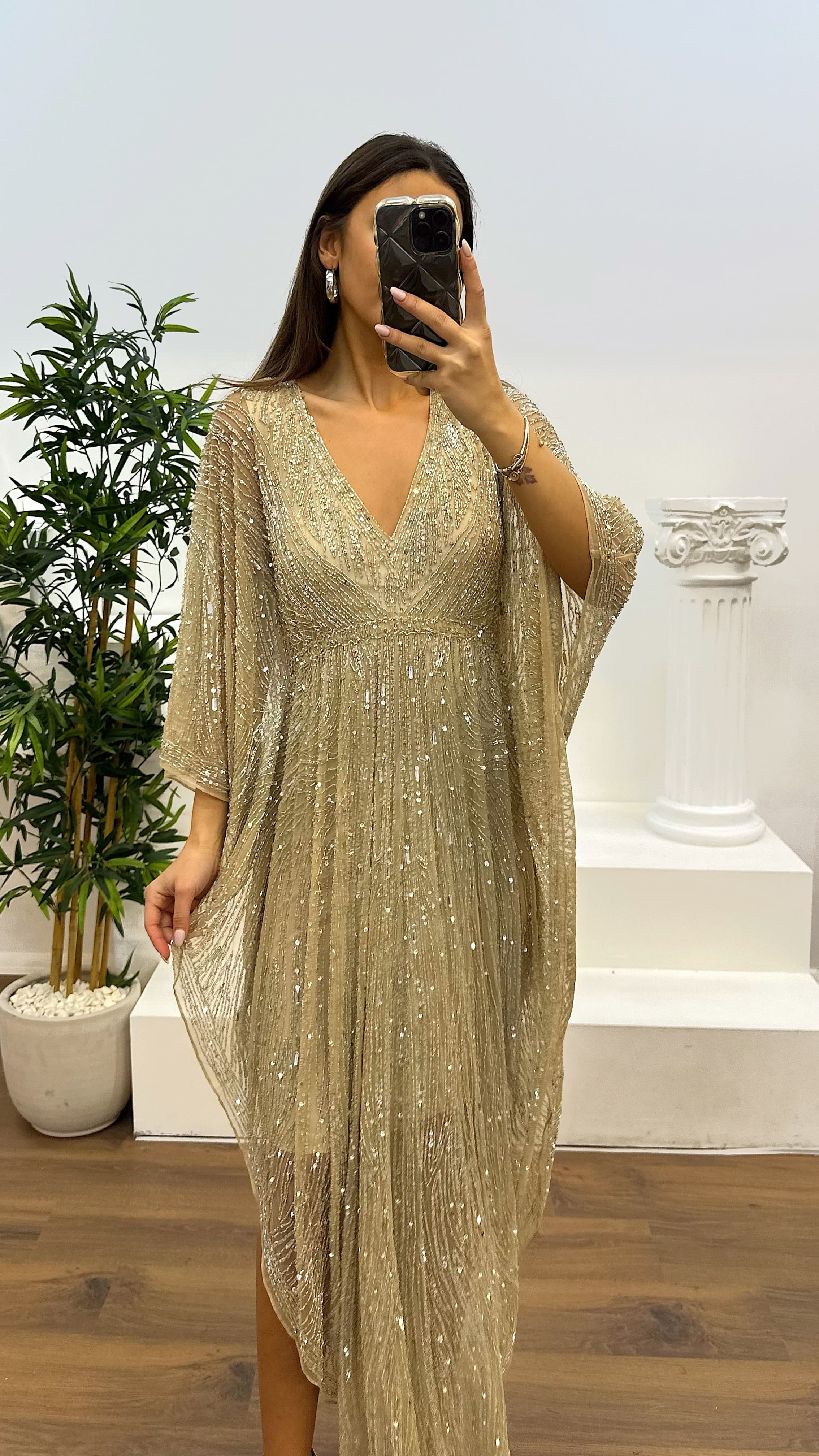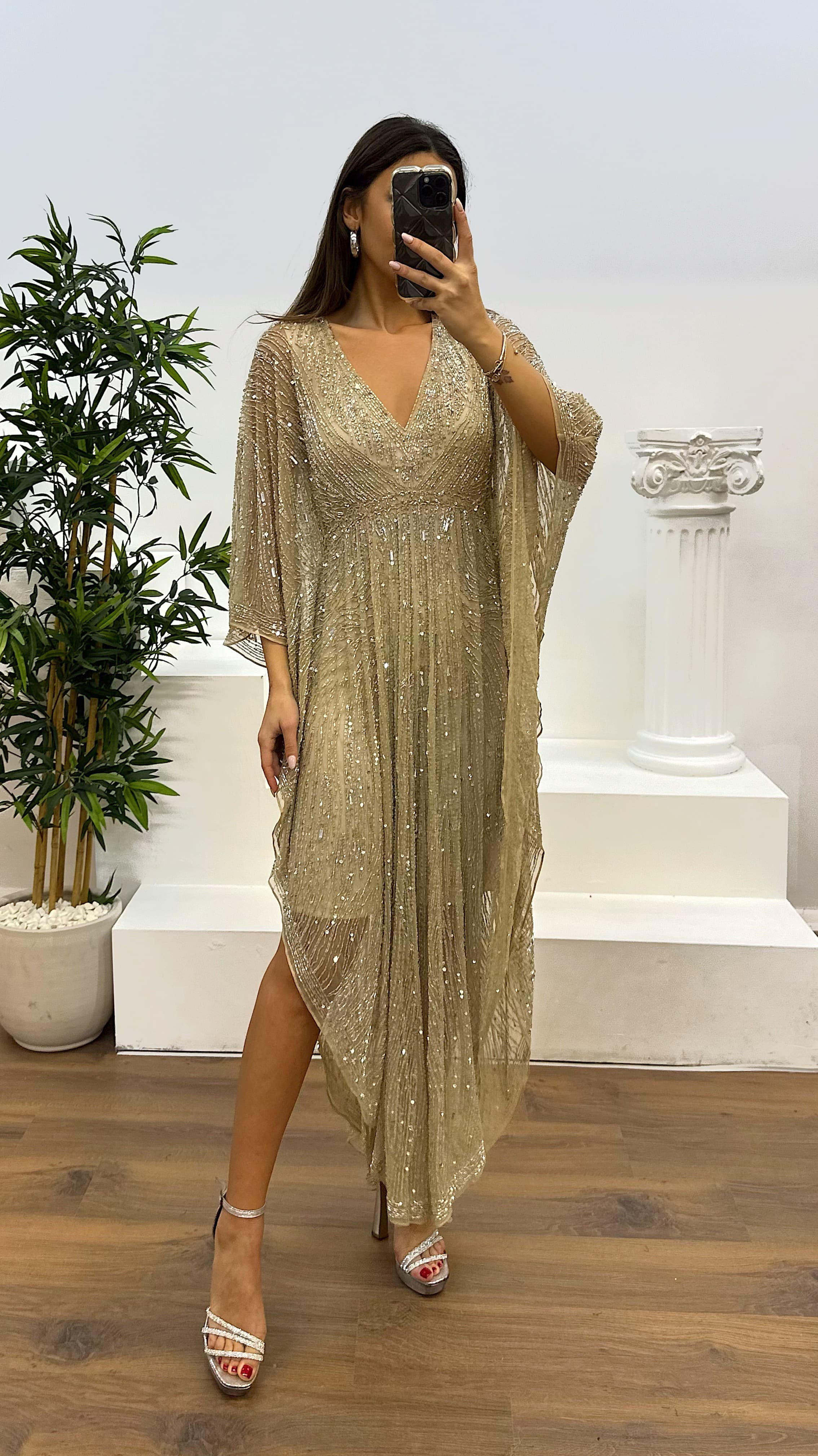 Ürün standart beden, göğüs pedli, astarlı, yarasa kol el işlemeli abiye olarak tasarlanmıştır.