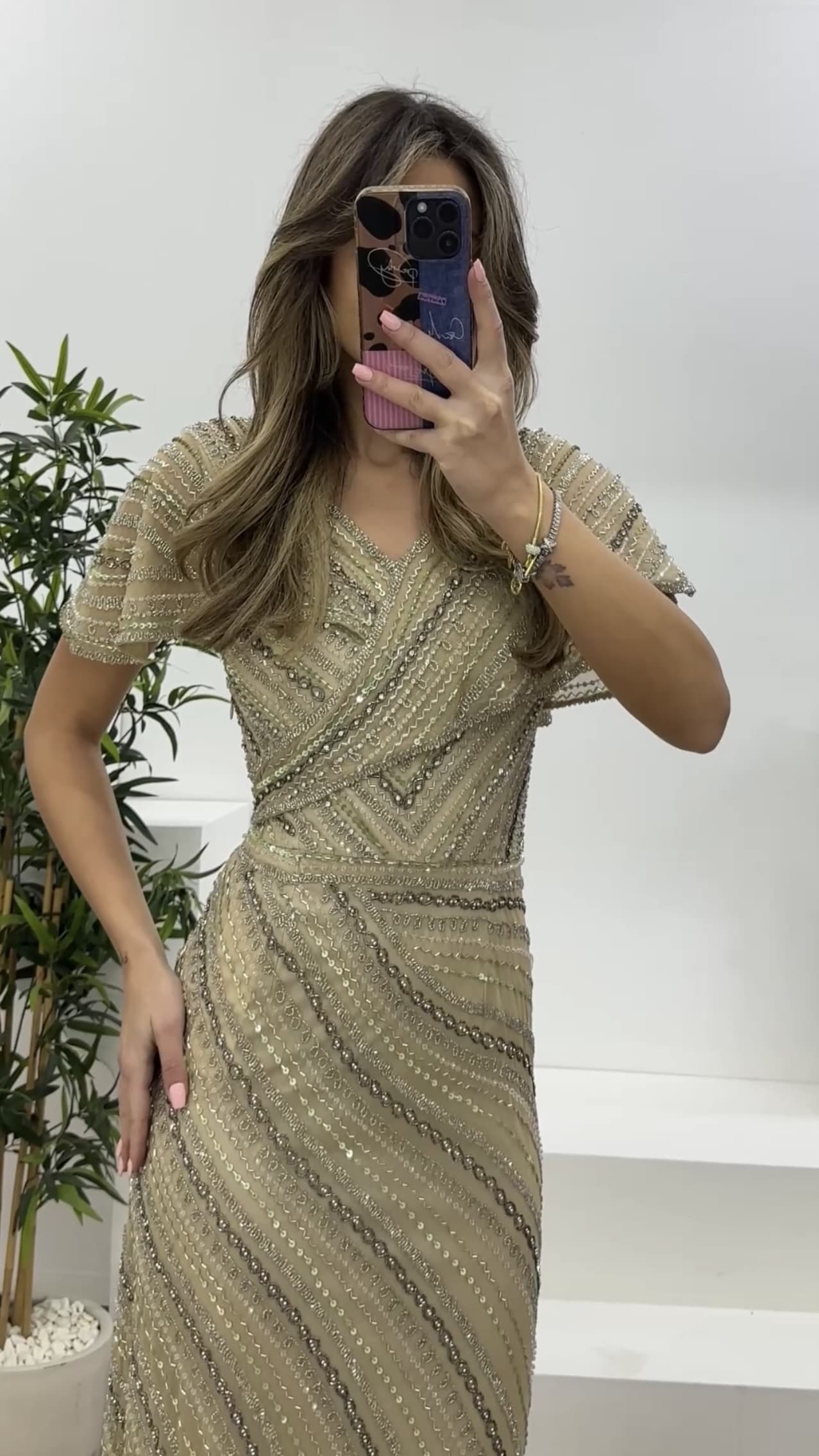 V yaka kruvaze detaylı payet işlemeli abiye elbise