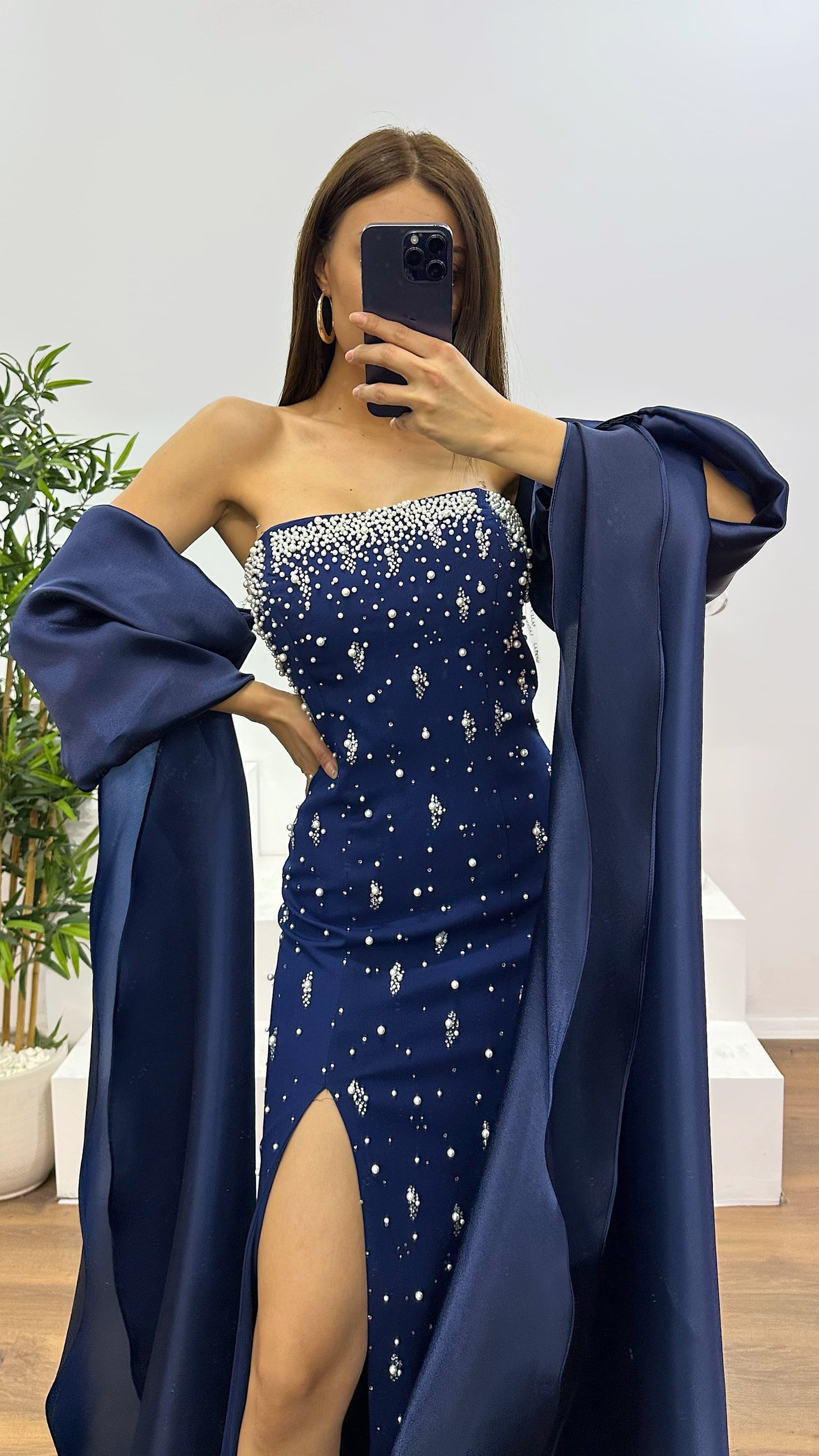 Ürün 36-42 bedene kadar uyumlu, göğüs pedli, astarlı, sırt capraz ip ve fermuar kapamalı, balon kol, inci detay abiye olarak tasarlanmıştır.