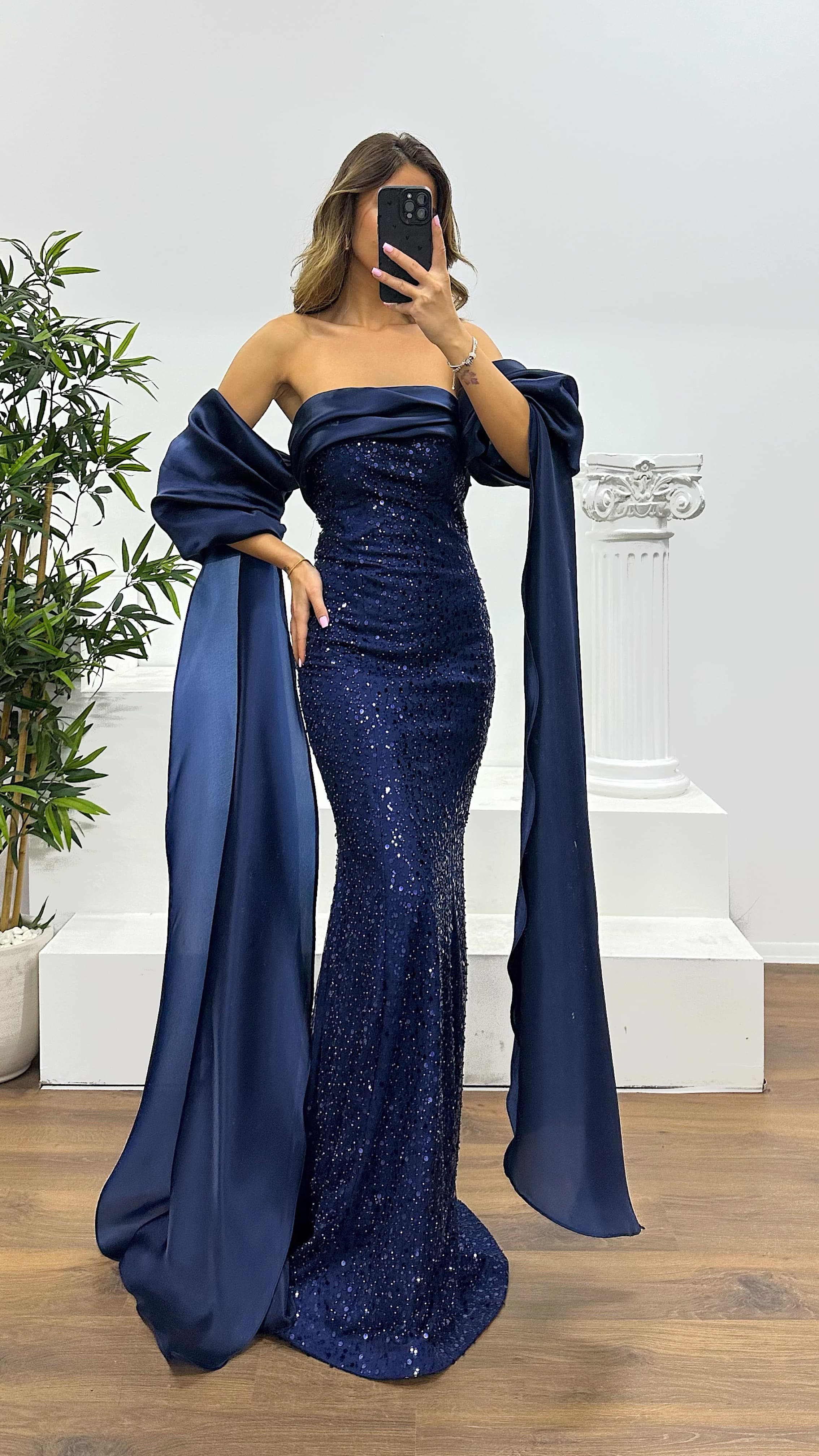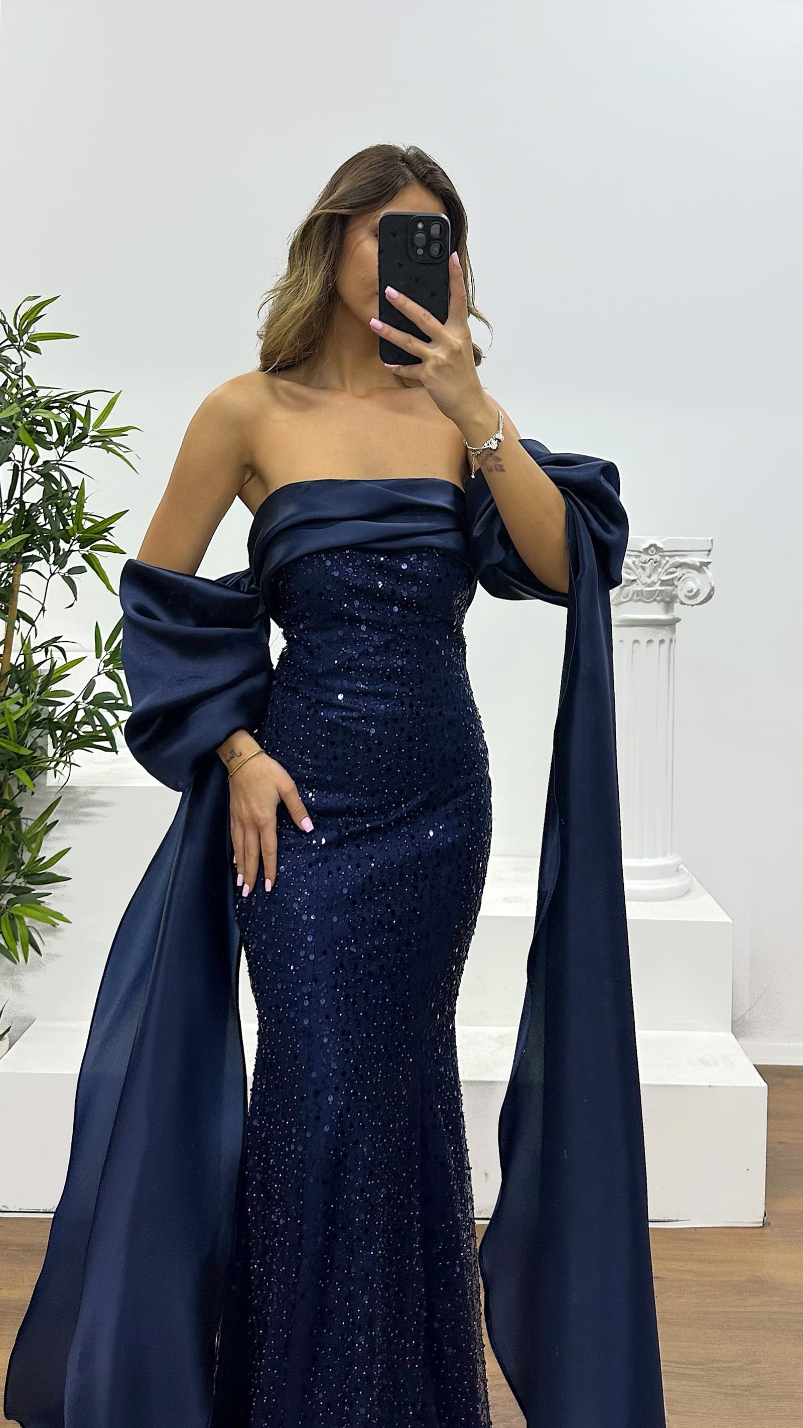 Lacivert Balon Kol İşlemeli Abiye Elbise
