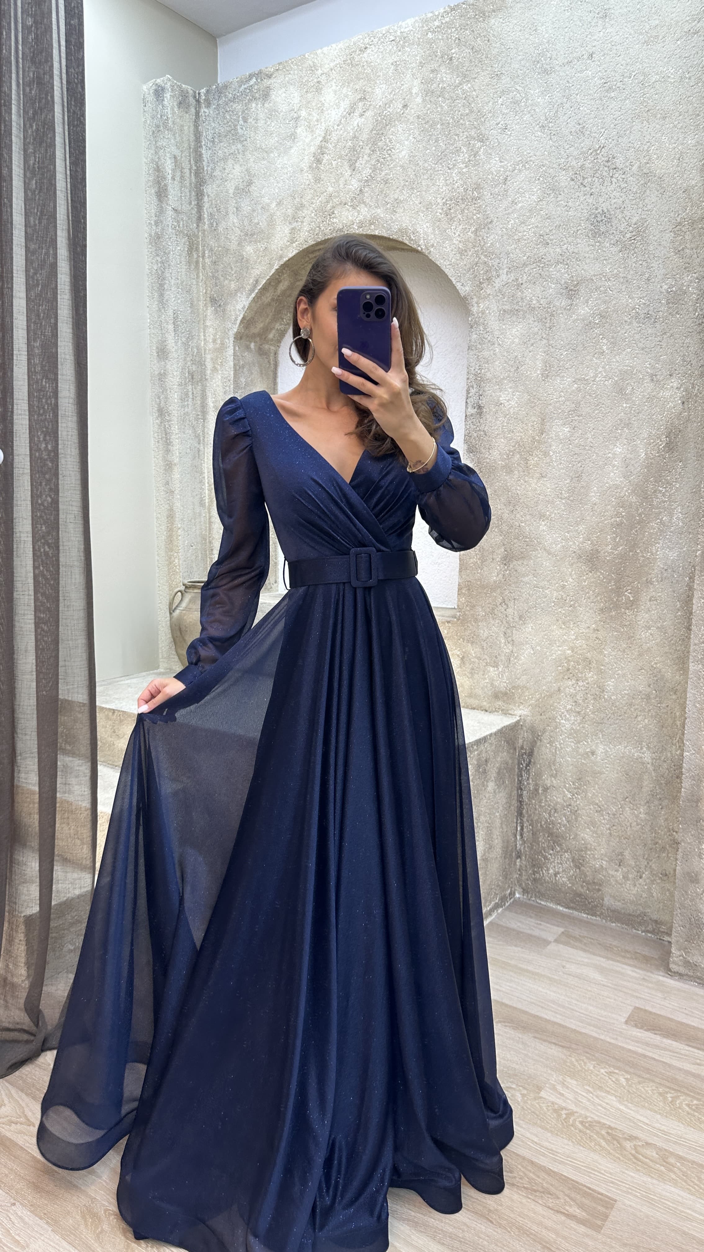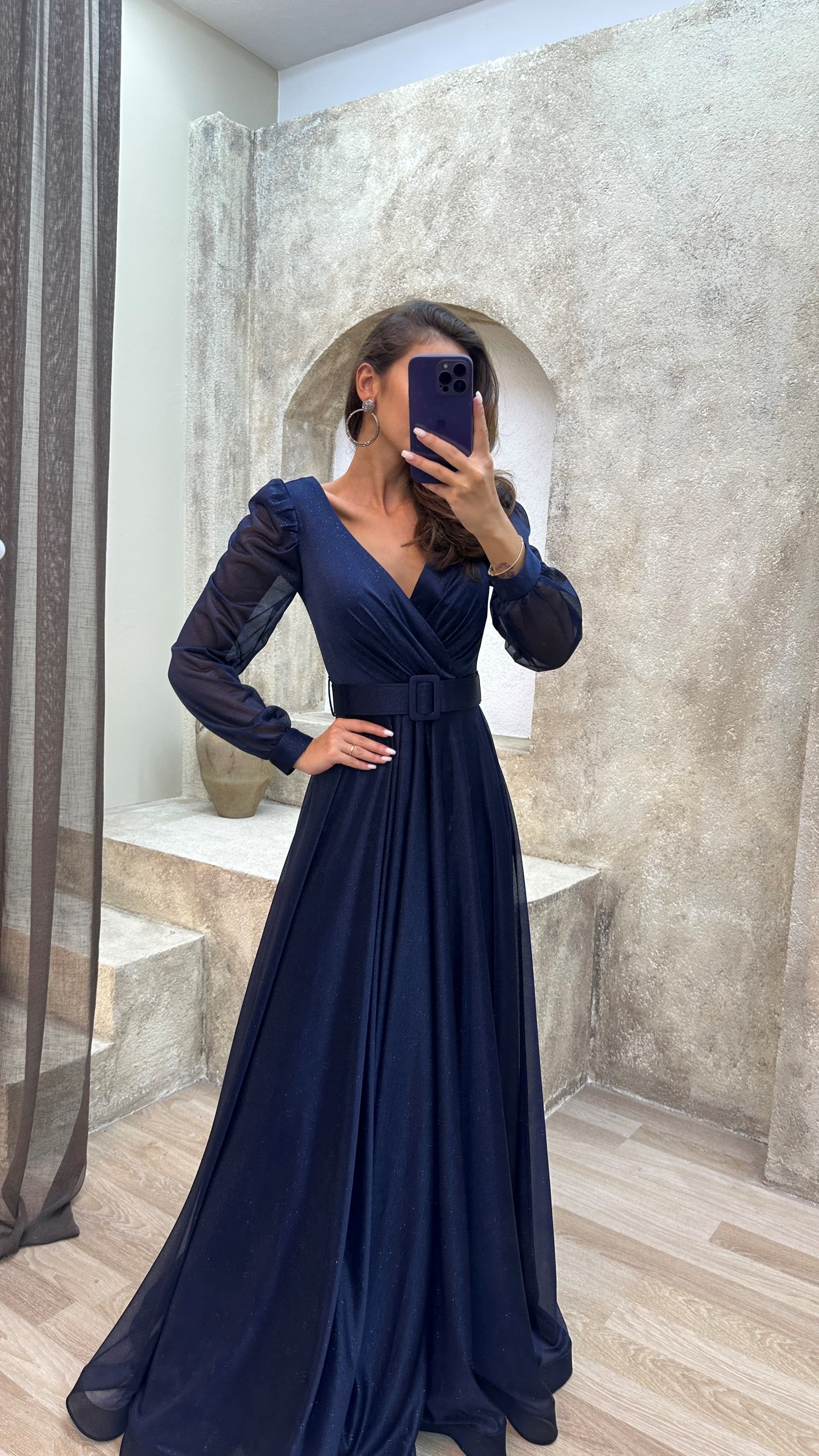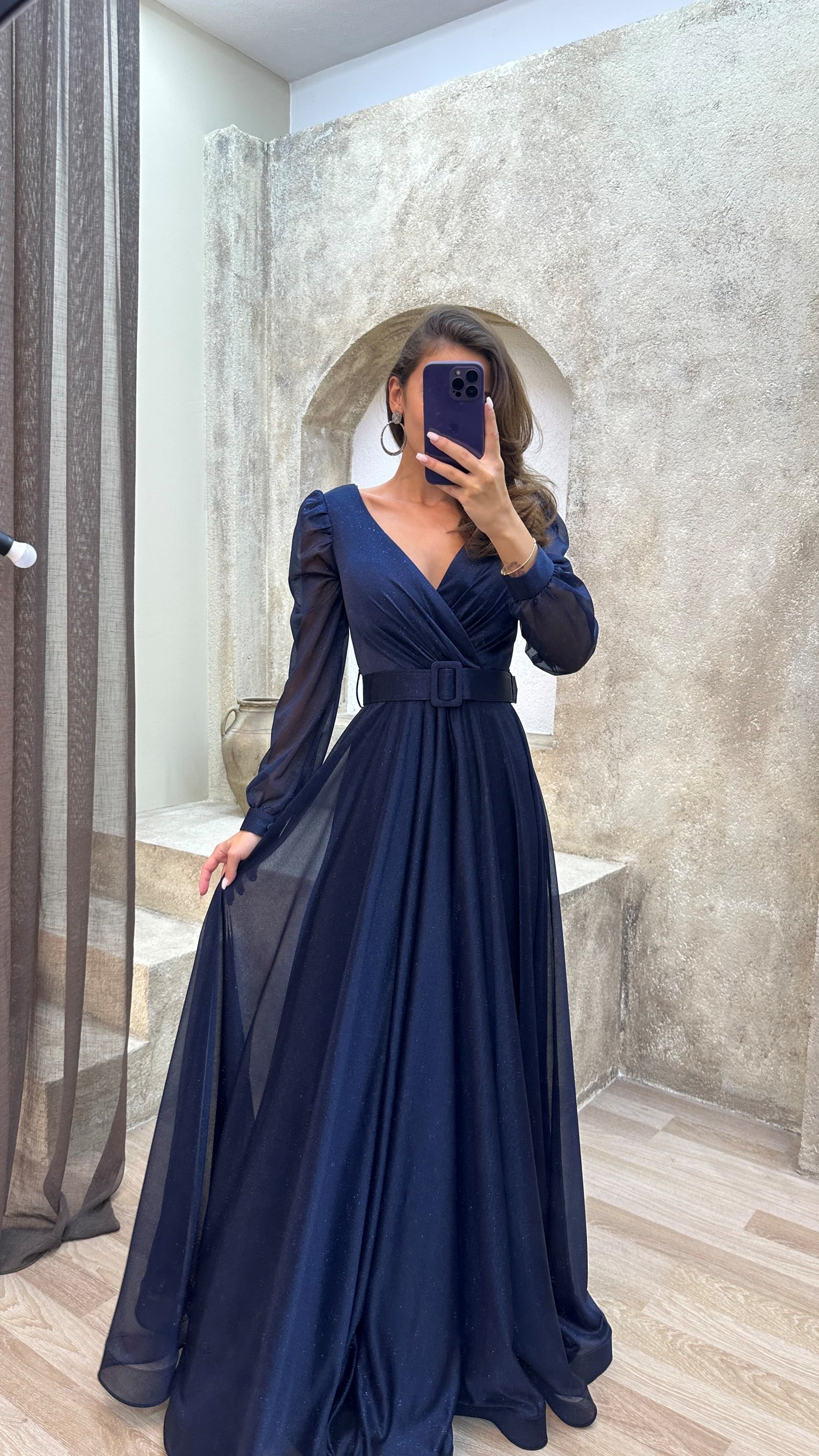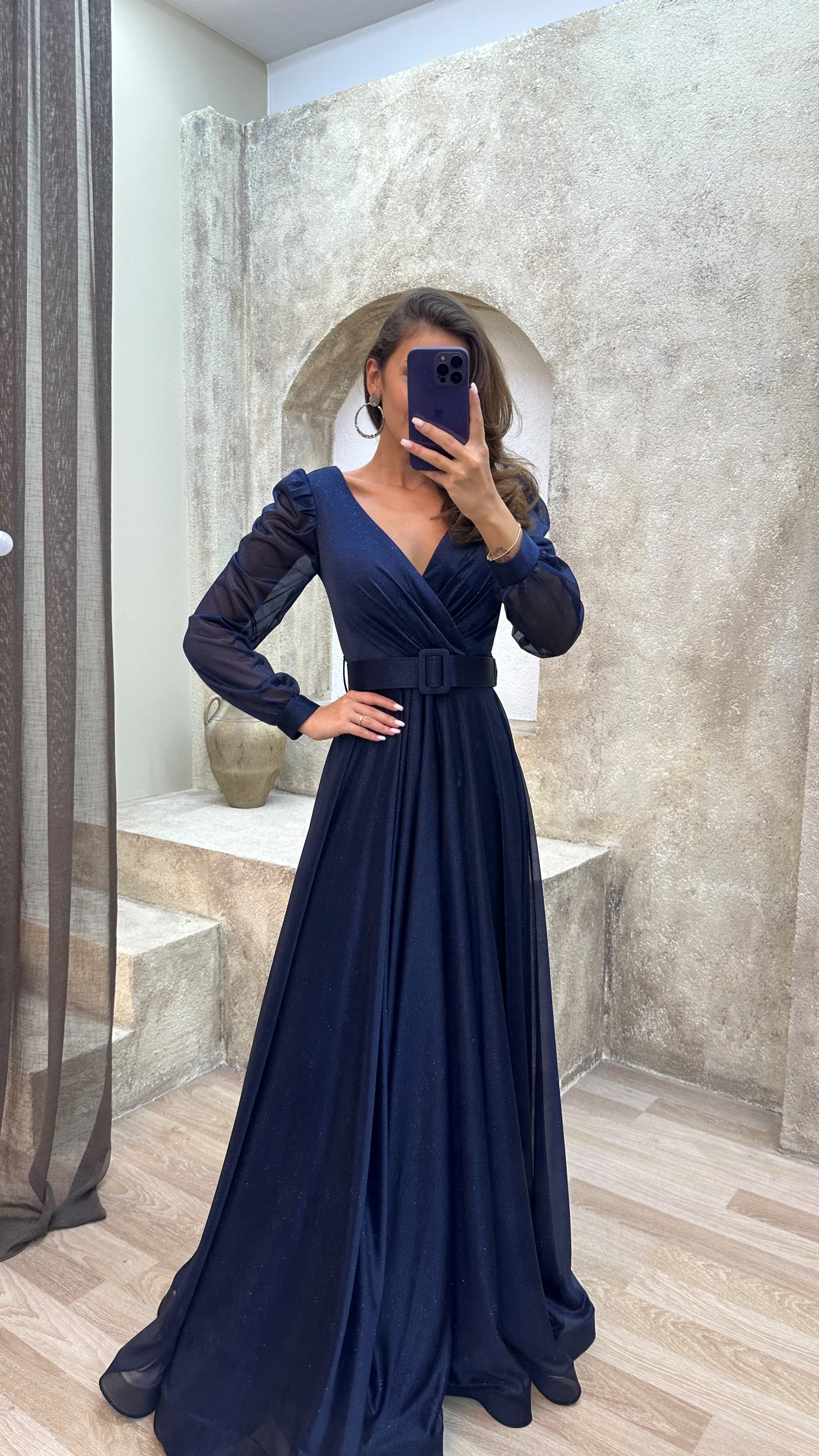 Lacivert Balon Kol V Yaka Abiye Elbise