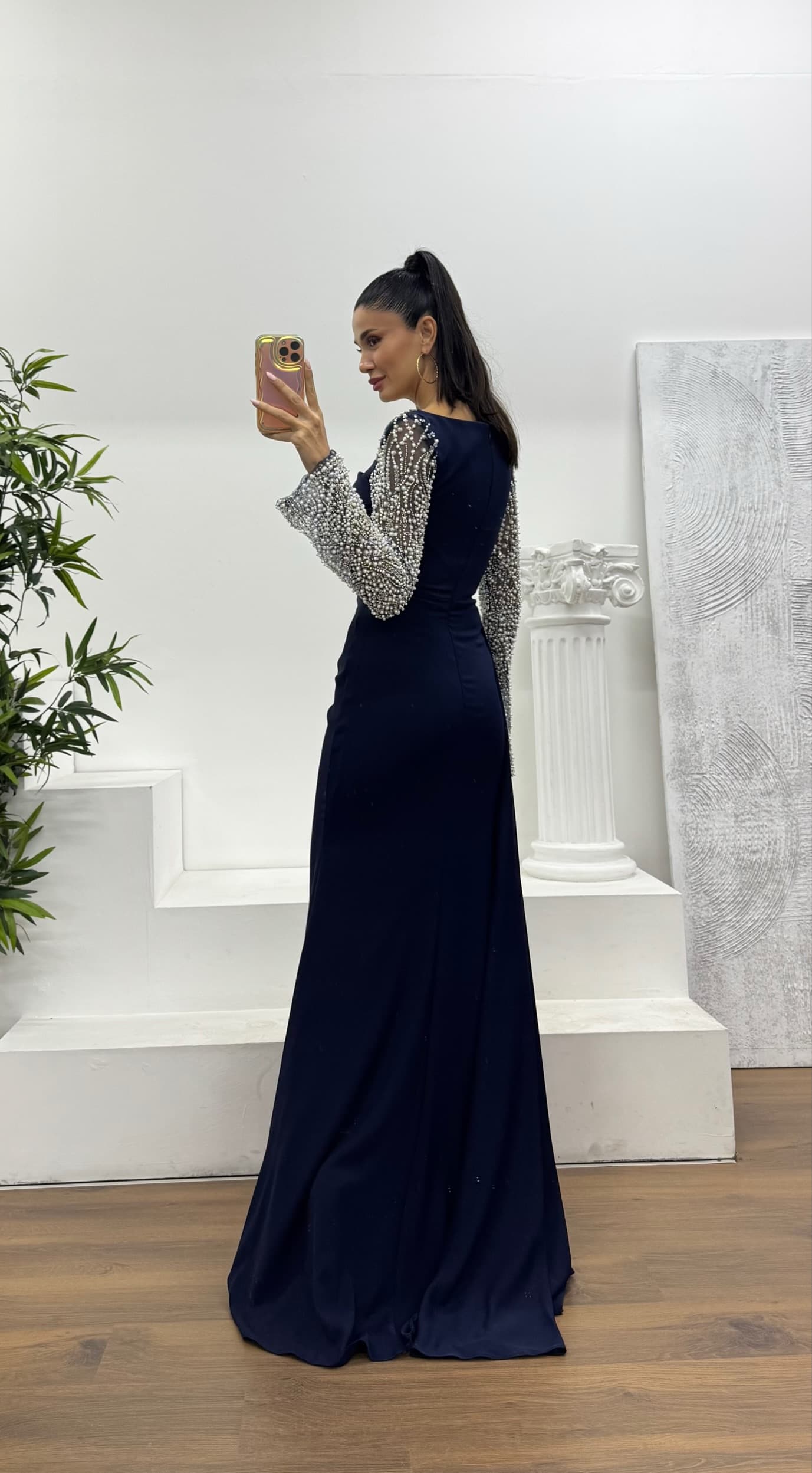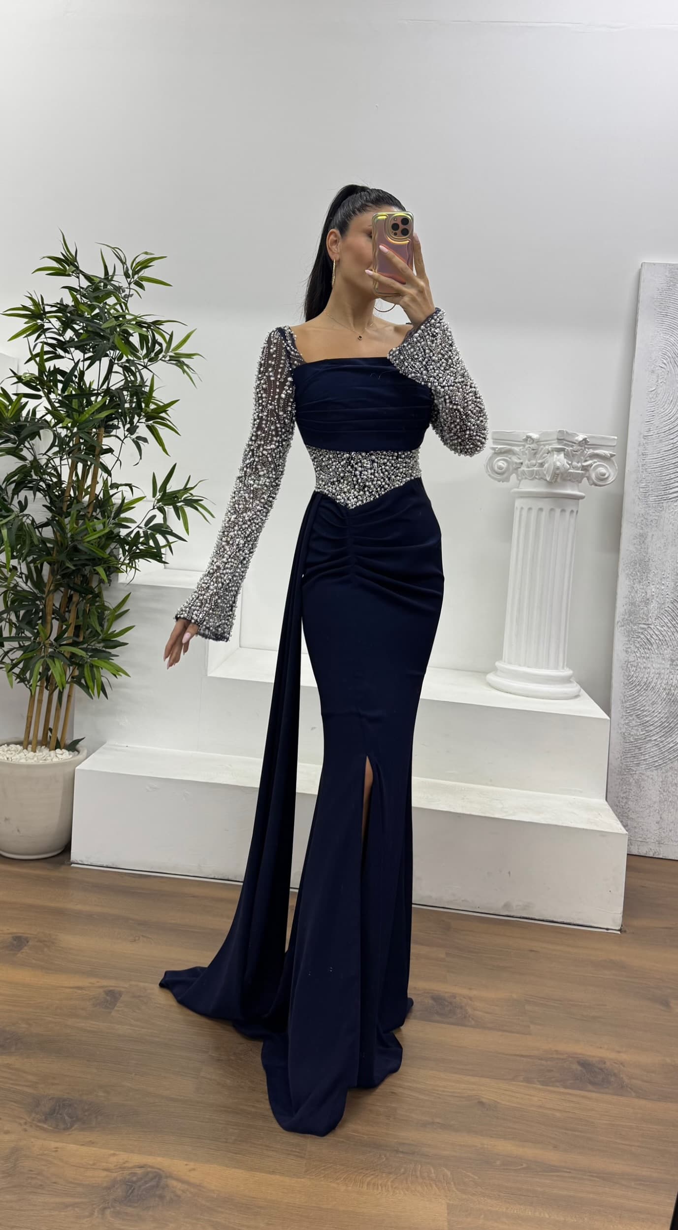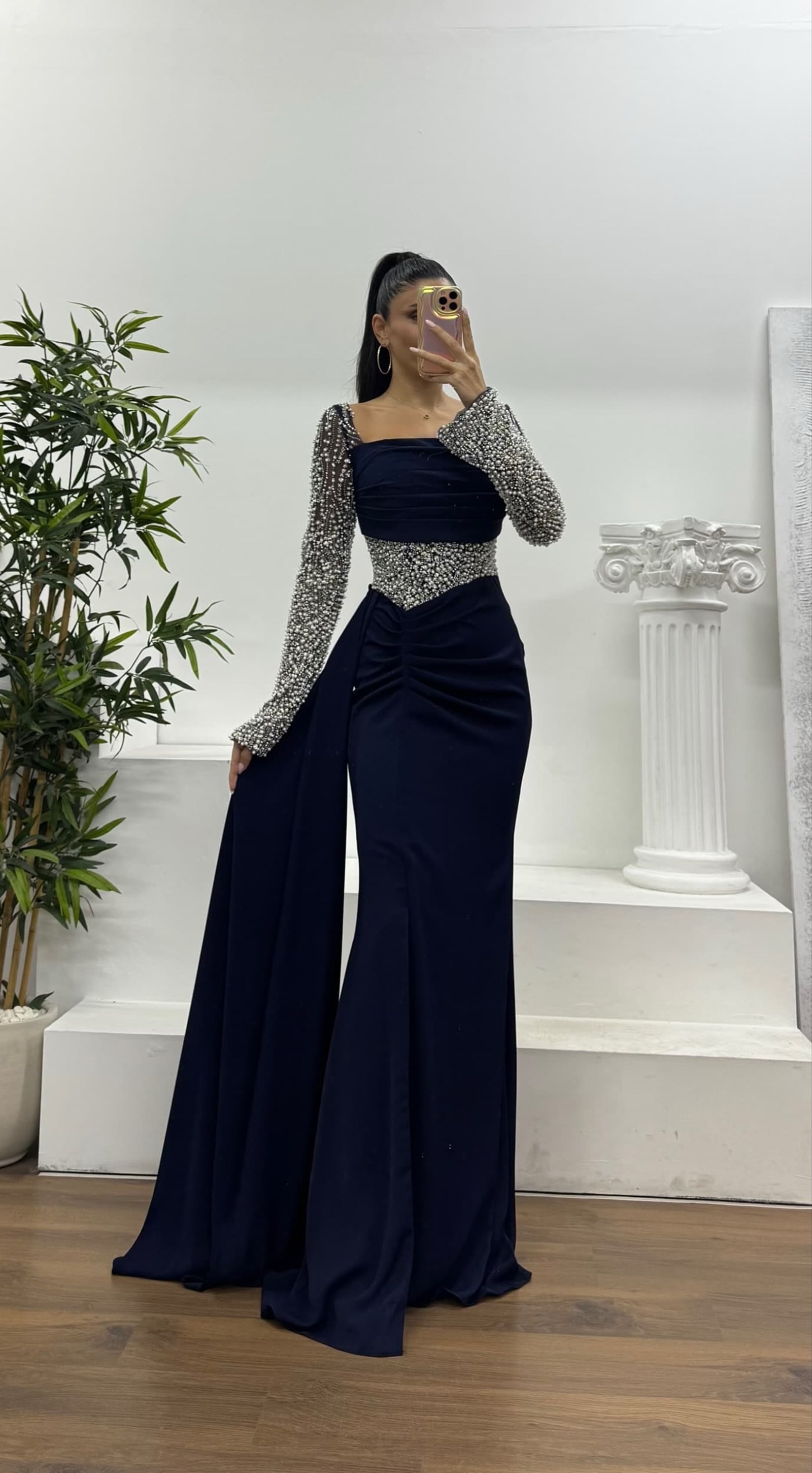 • Lacivert Bel Detay Abiye Elbise