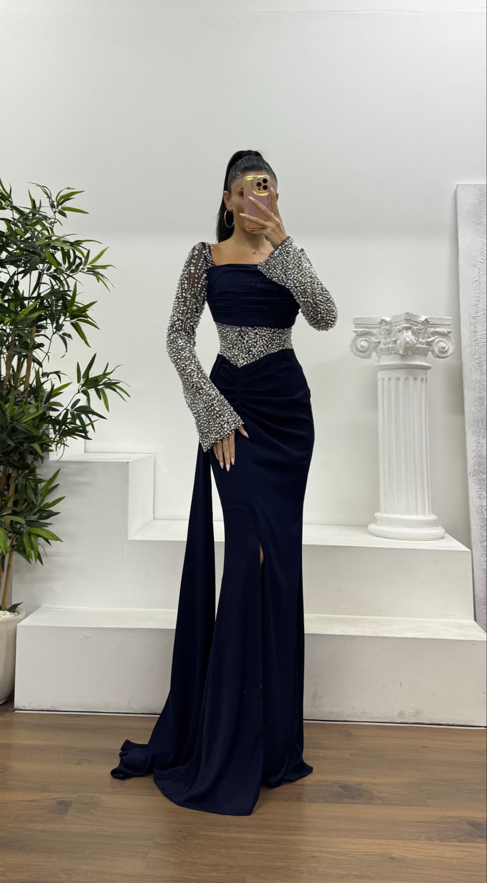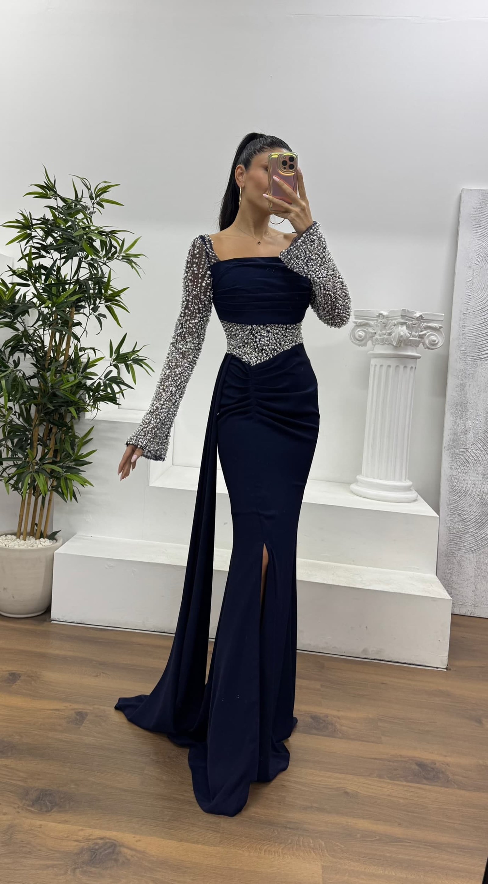 Lacivert Bel Detay Abiye Elbise