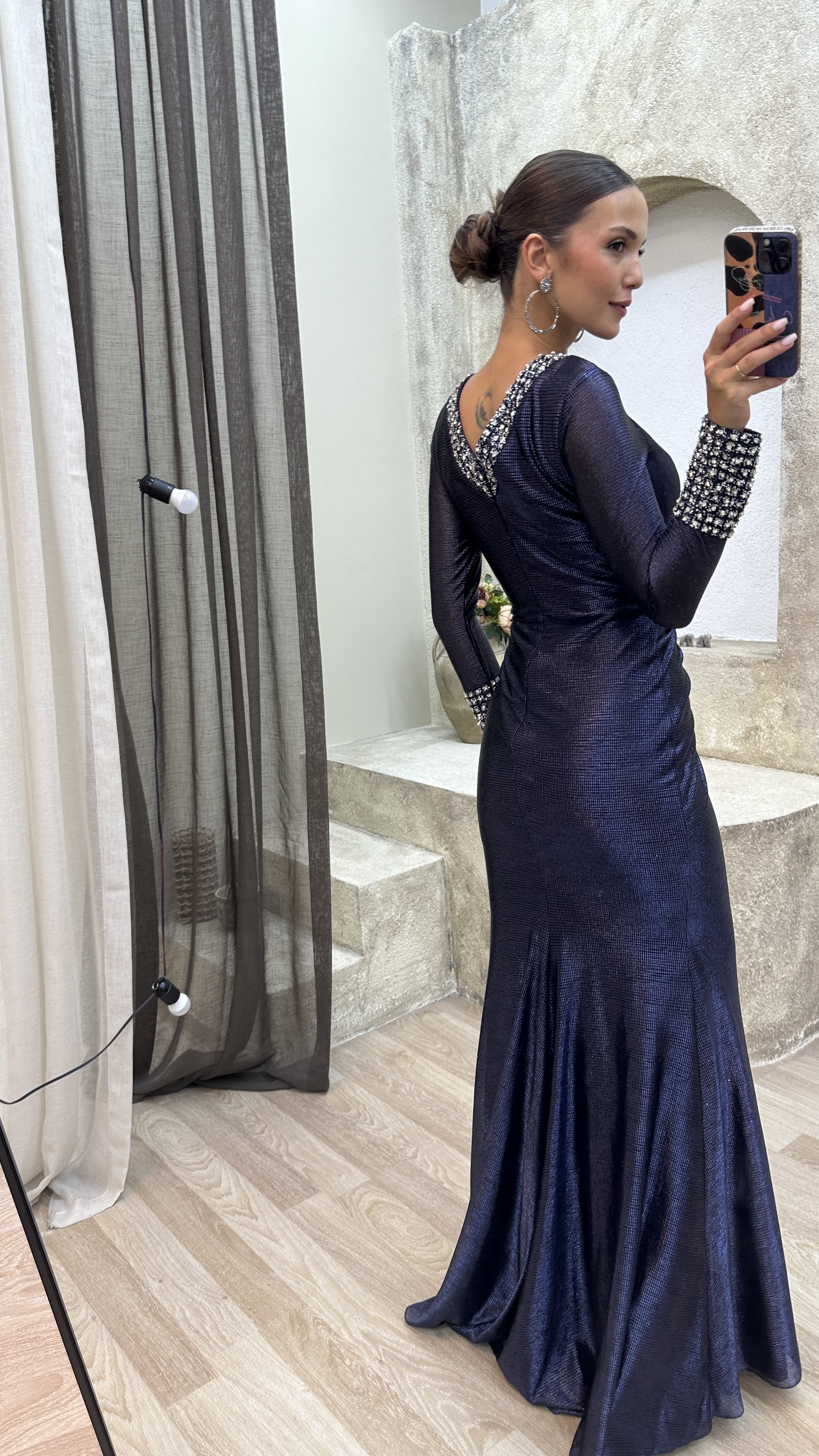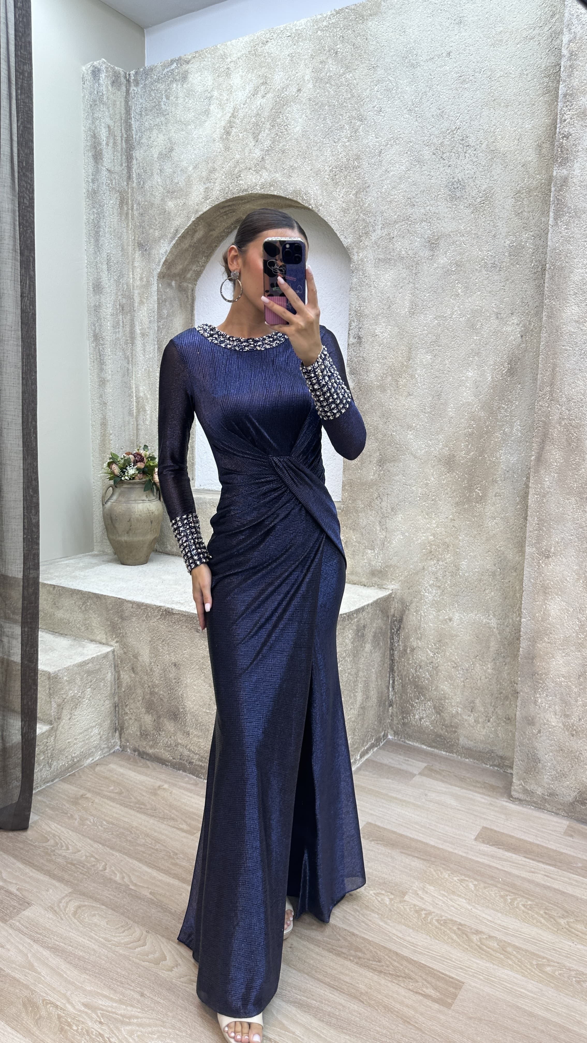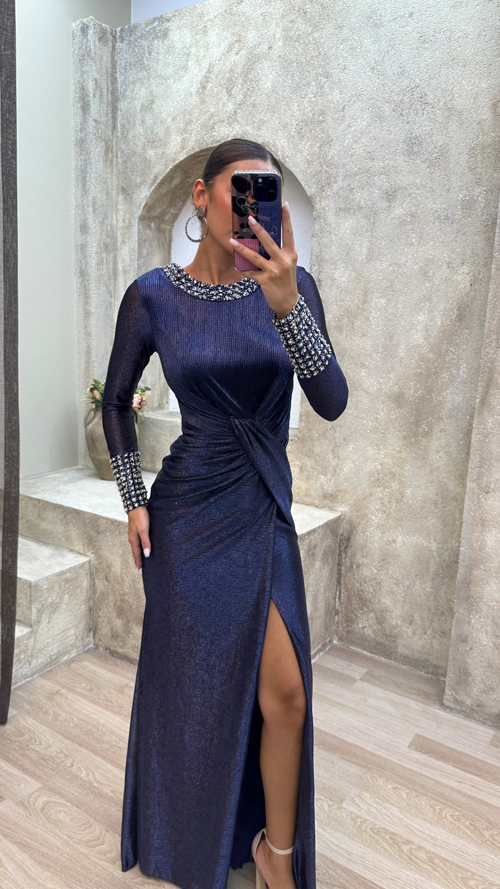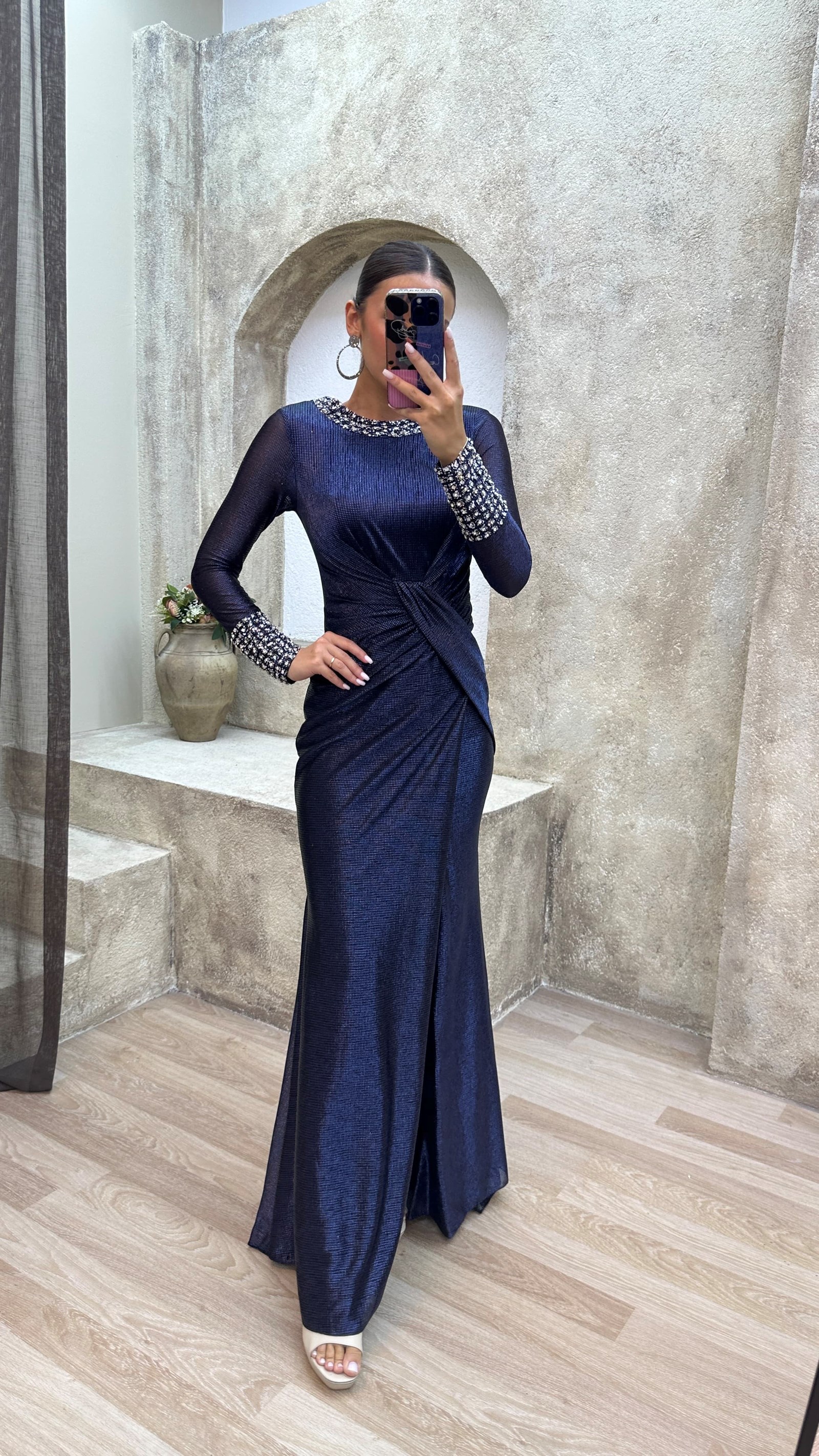 • Lacivert Bel Detay Taş İşlemeli Büyük Beden Abiye Elbise