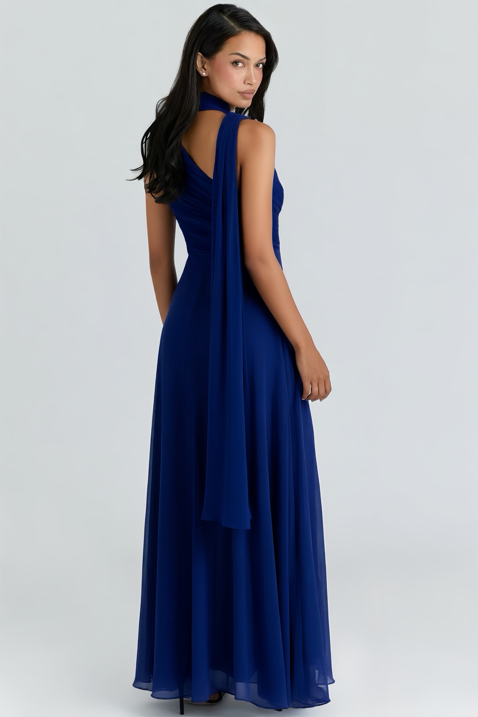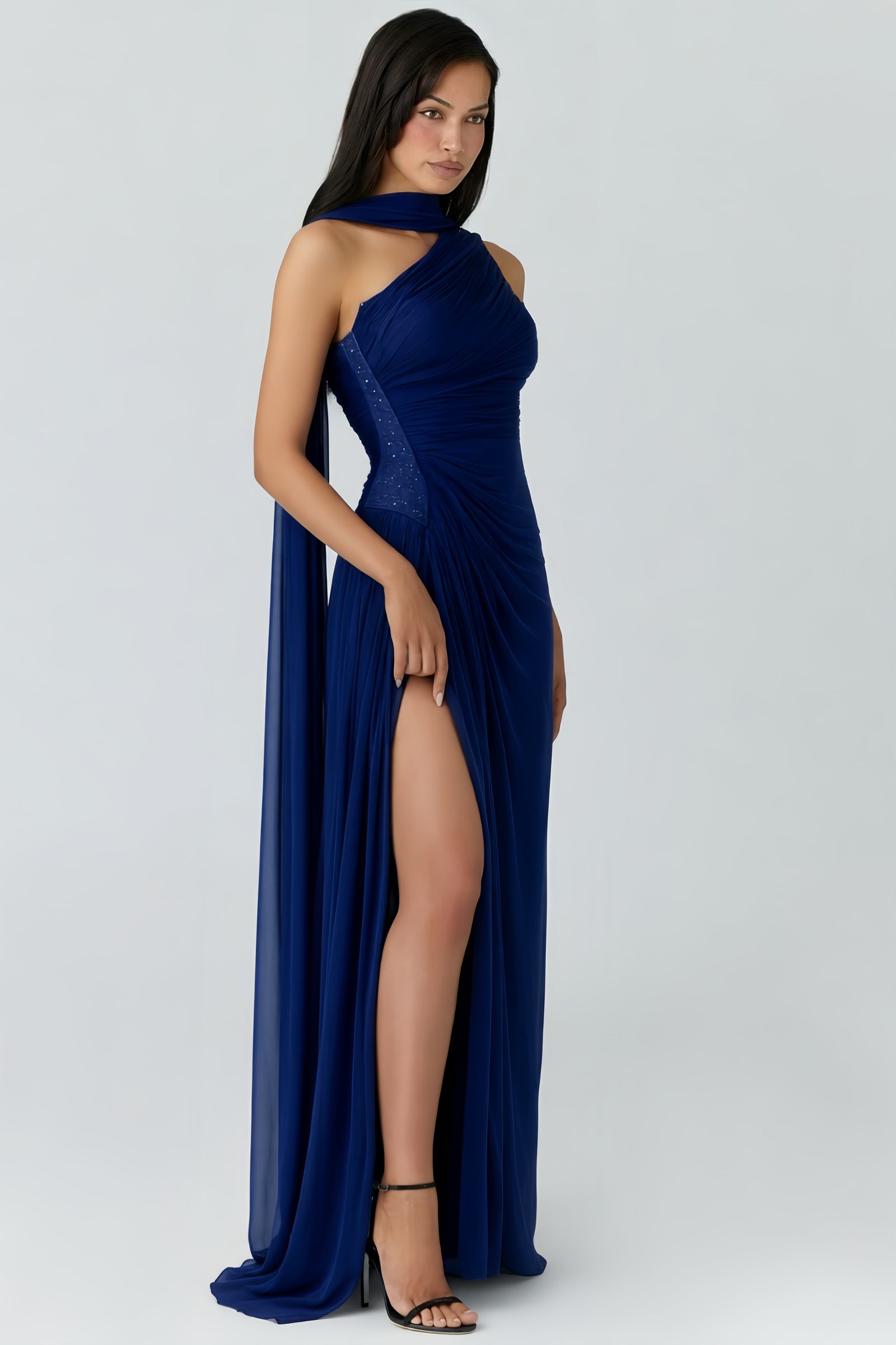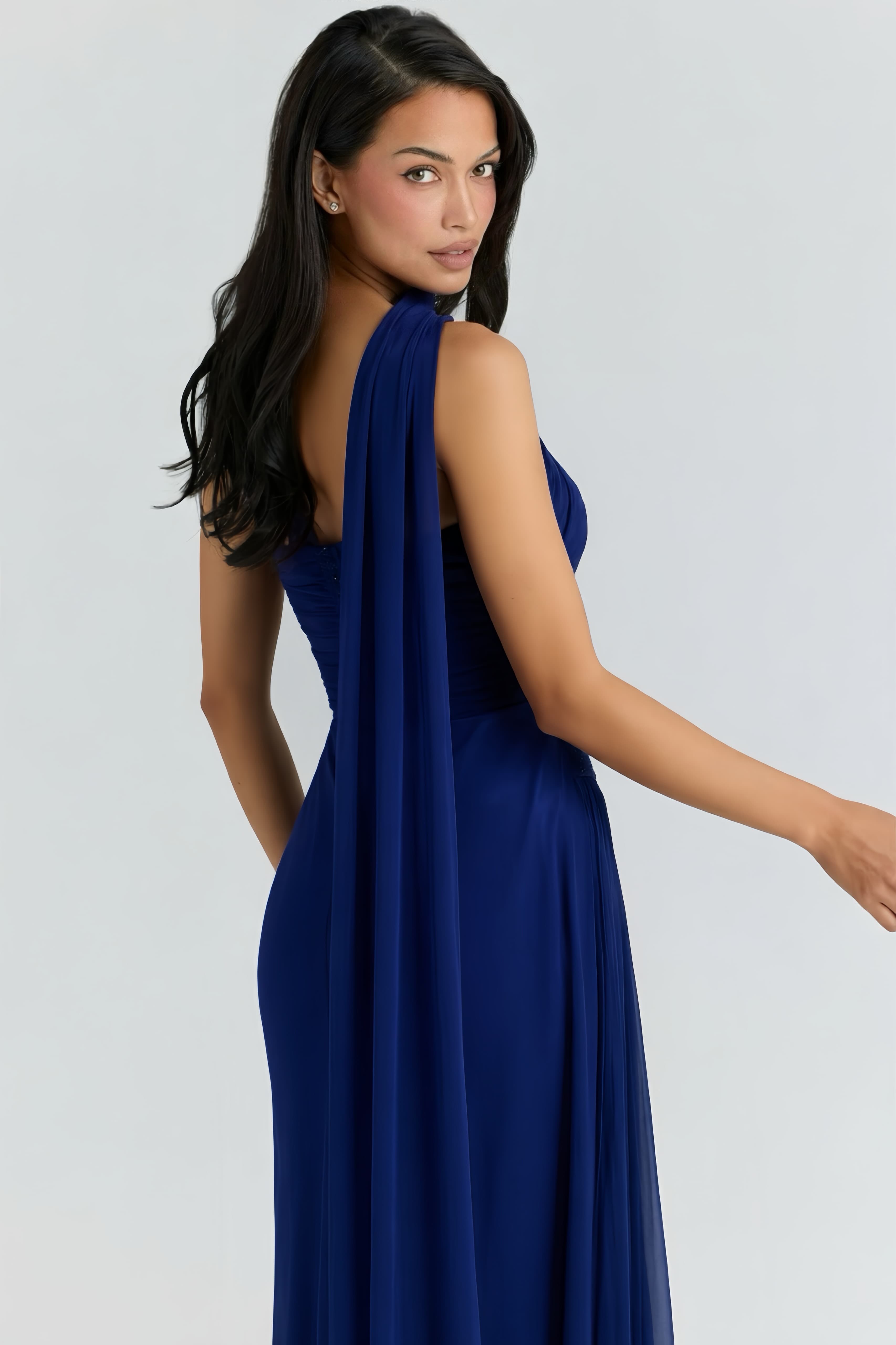 Lacivert Belden Taş Detaylı Abiye Elbise