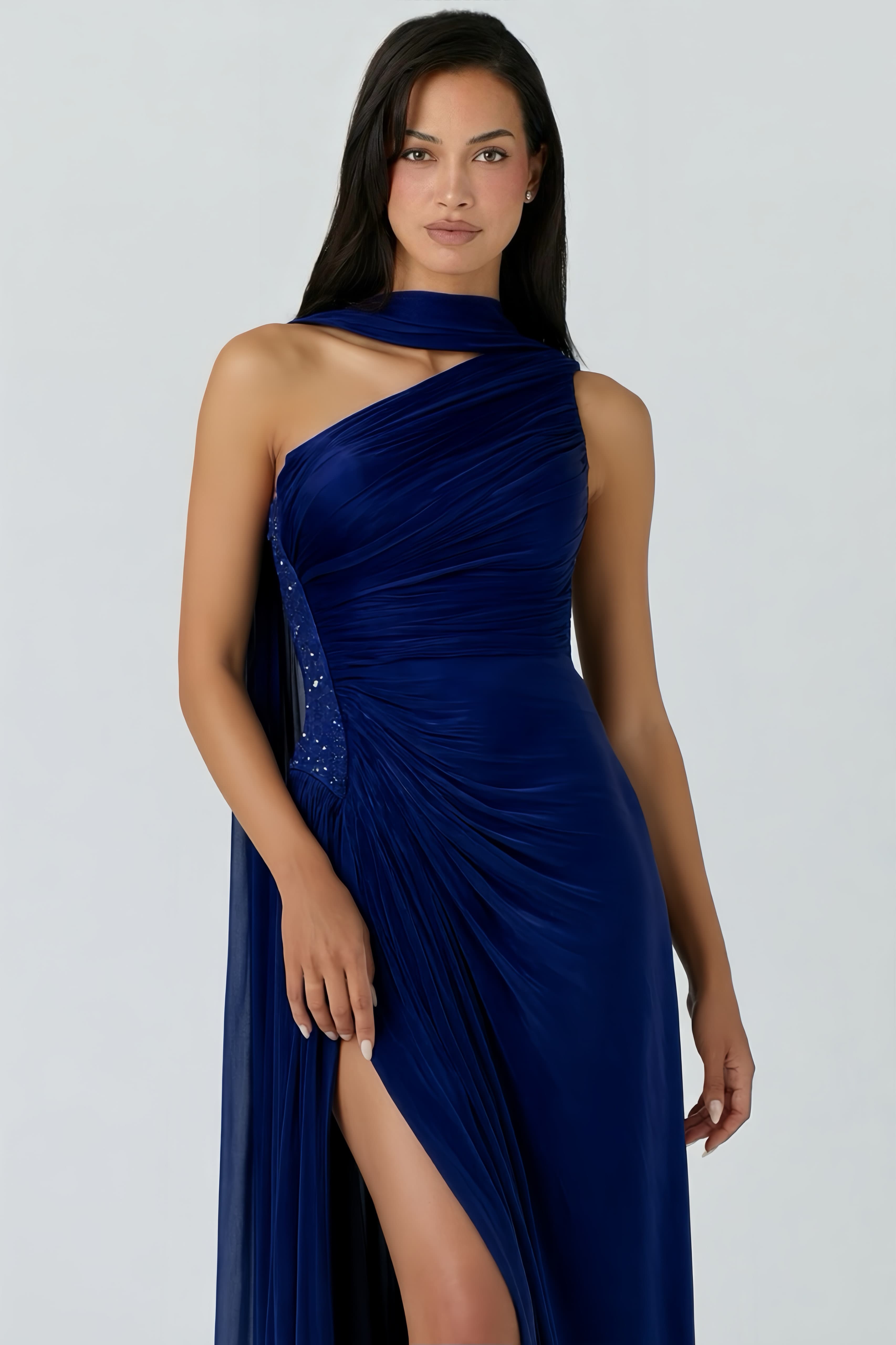 Modern ve dikkat çekici tasarımıyla öne çıkan bu özel abiye, Taş işlemeli detaylar, Vücuda oturan kalıp, Astarlı iç yapı, Dengeli ve modern kesim detayları ile güçlü ve zarif bir duruş sunar. Modelin tasarım detayları elbiseye sofistike bir görünüm kazandırırken, vücuda uyum sağlayan formu sayesinde şık ve estetik bir siluet oluşturur.