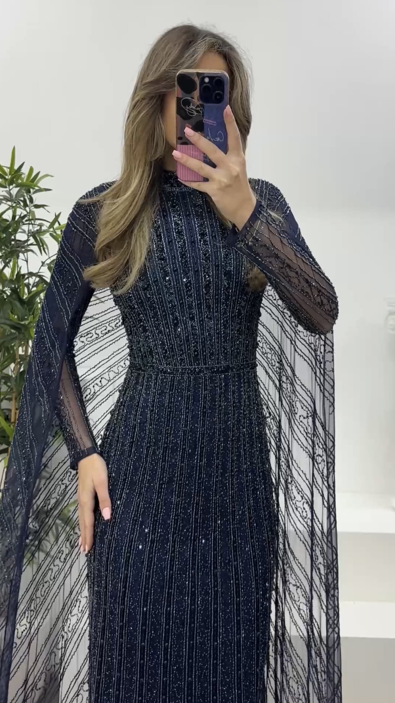 Bisiklet yaka pelerinli boncuk işlemeli abiye elbise