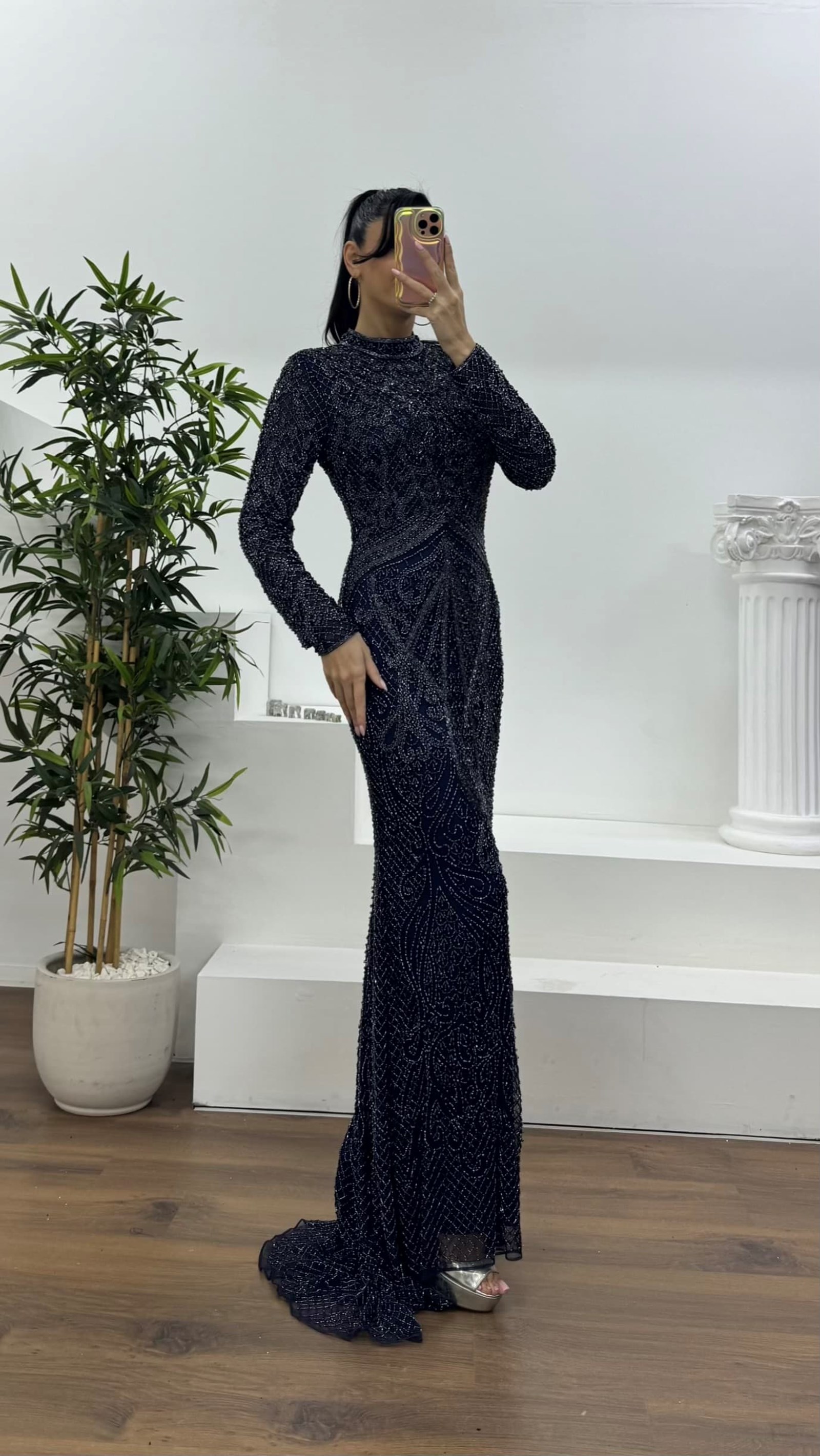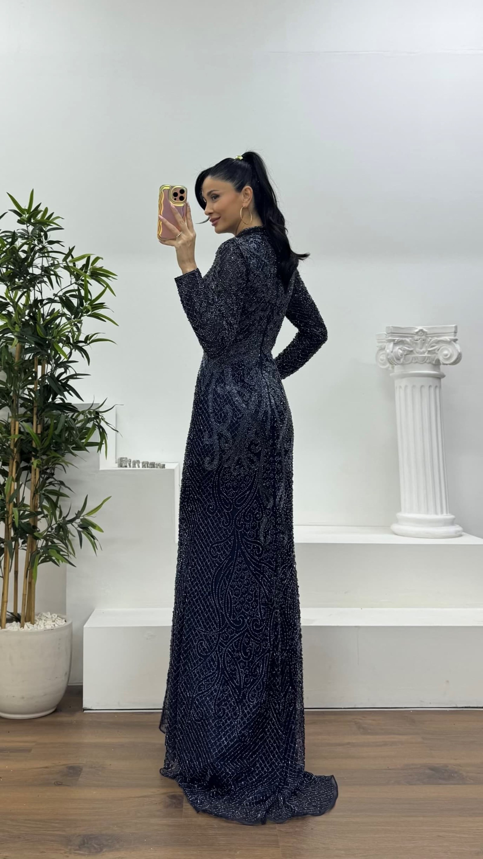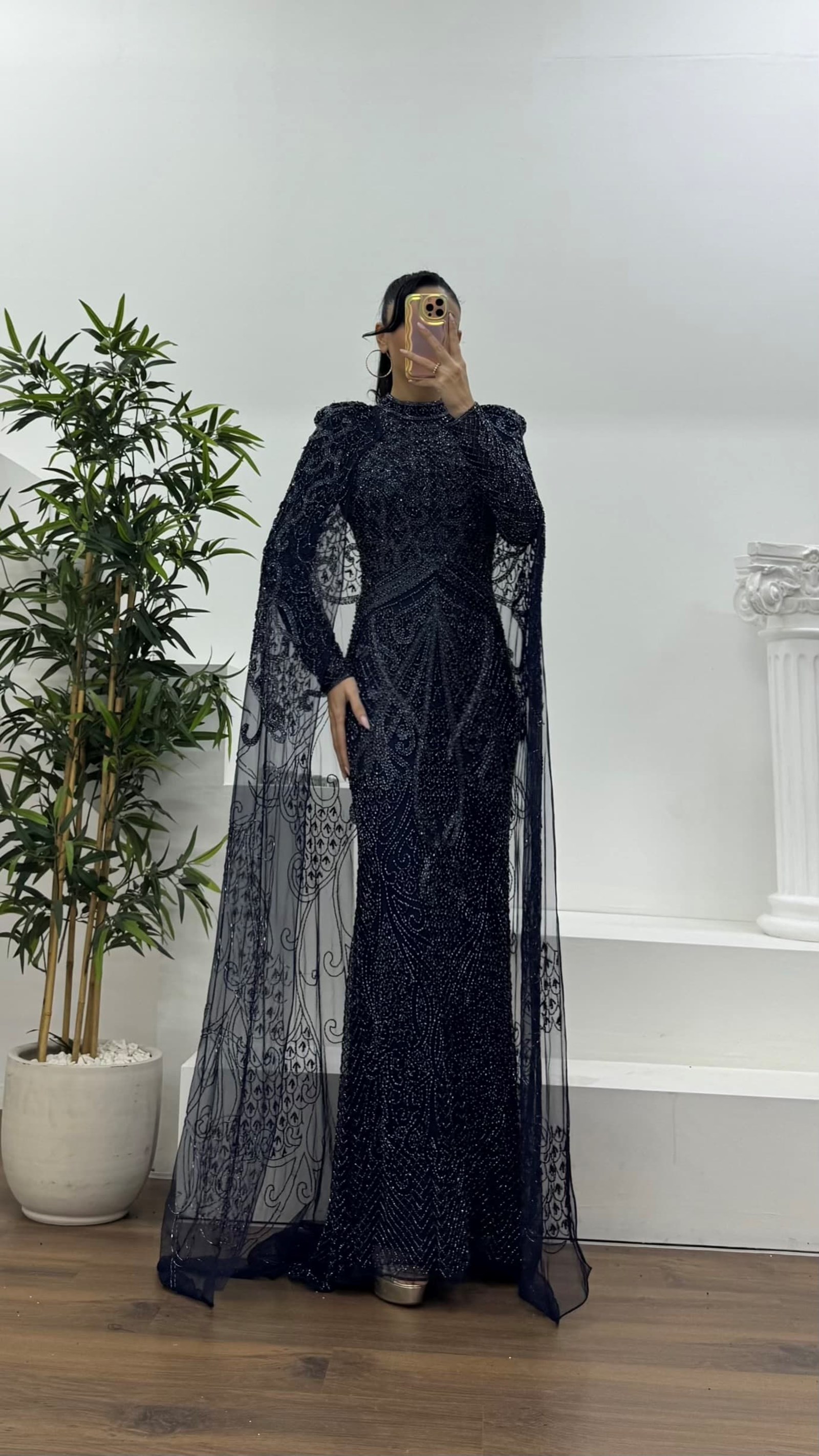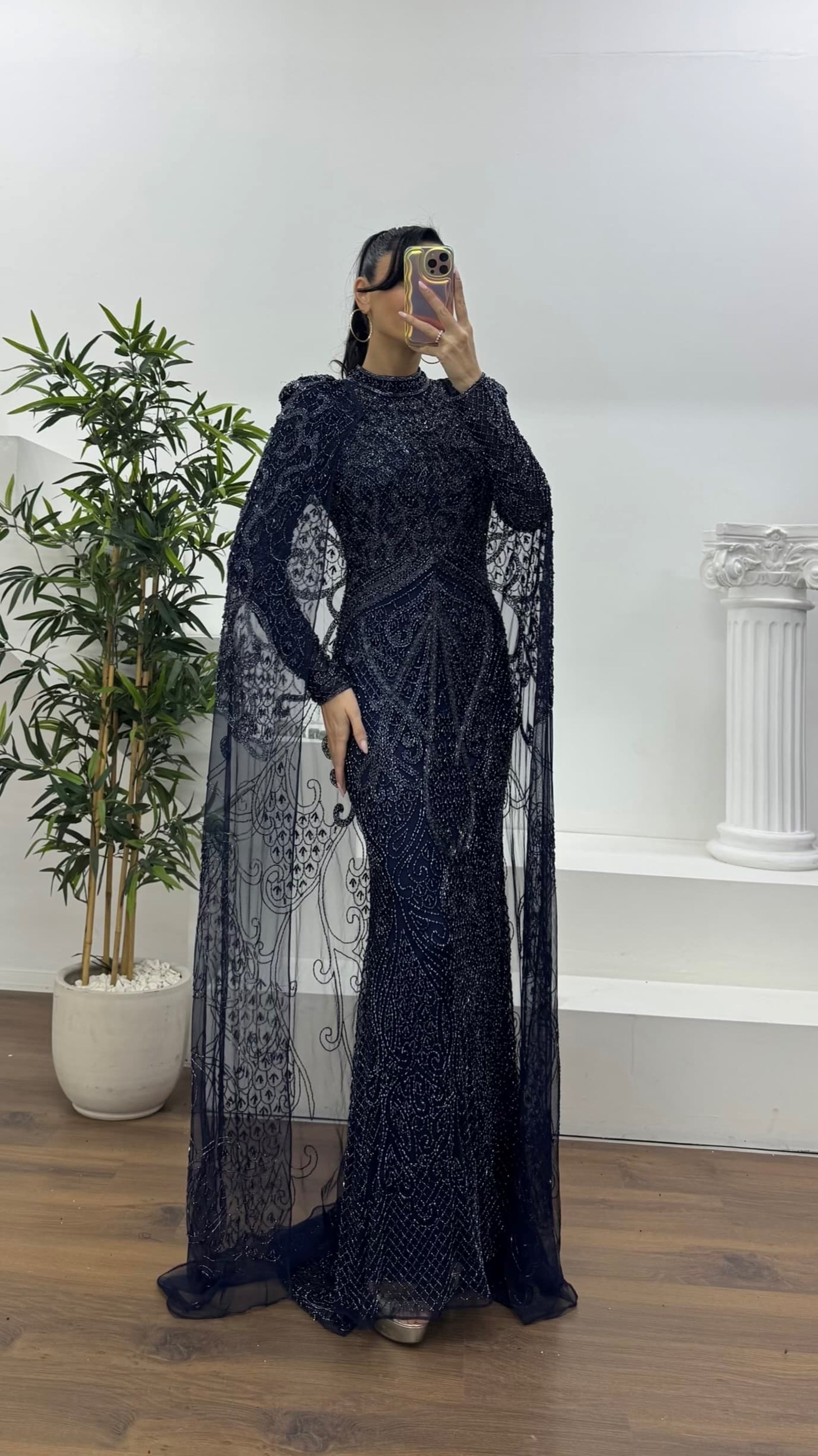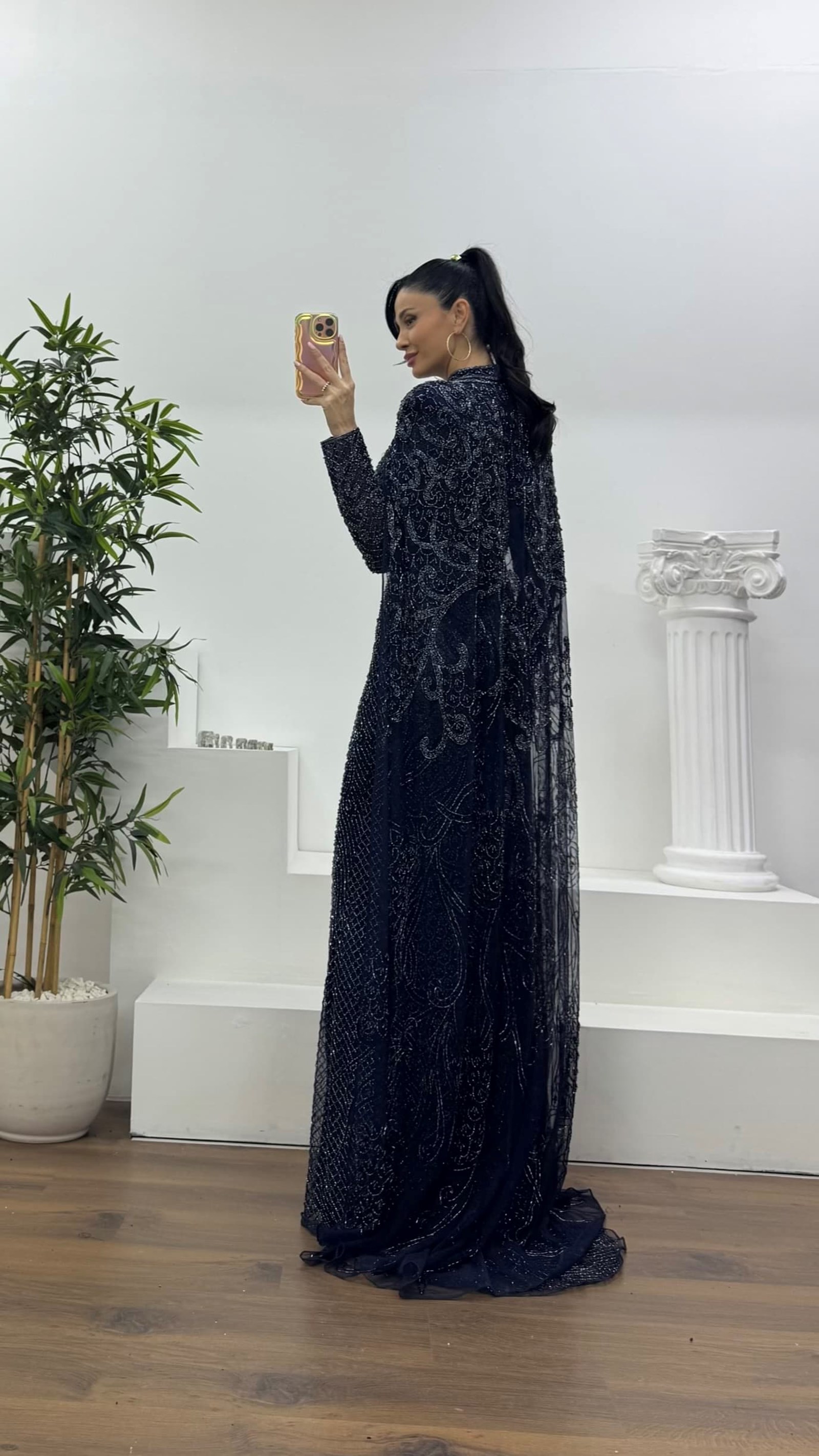 • Lacivert Boncuk İşlemeli Uzun Kollu Pelerin Detaylı Abiye Elbise