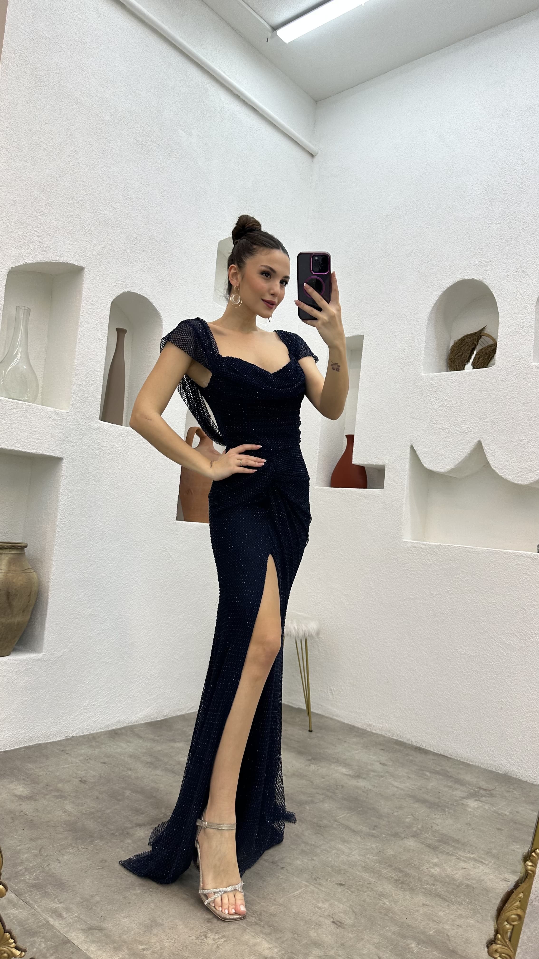 • Lacivert Büzgülü Straplez Abiye Elbise
