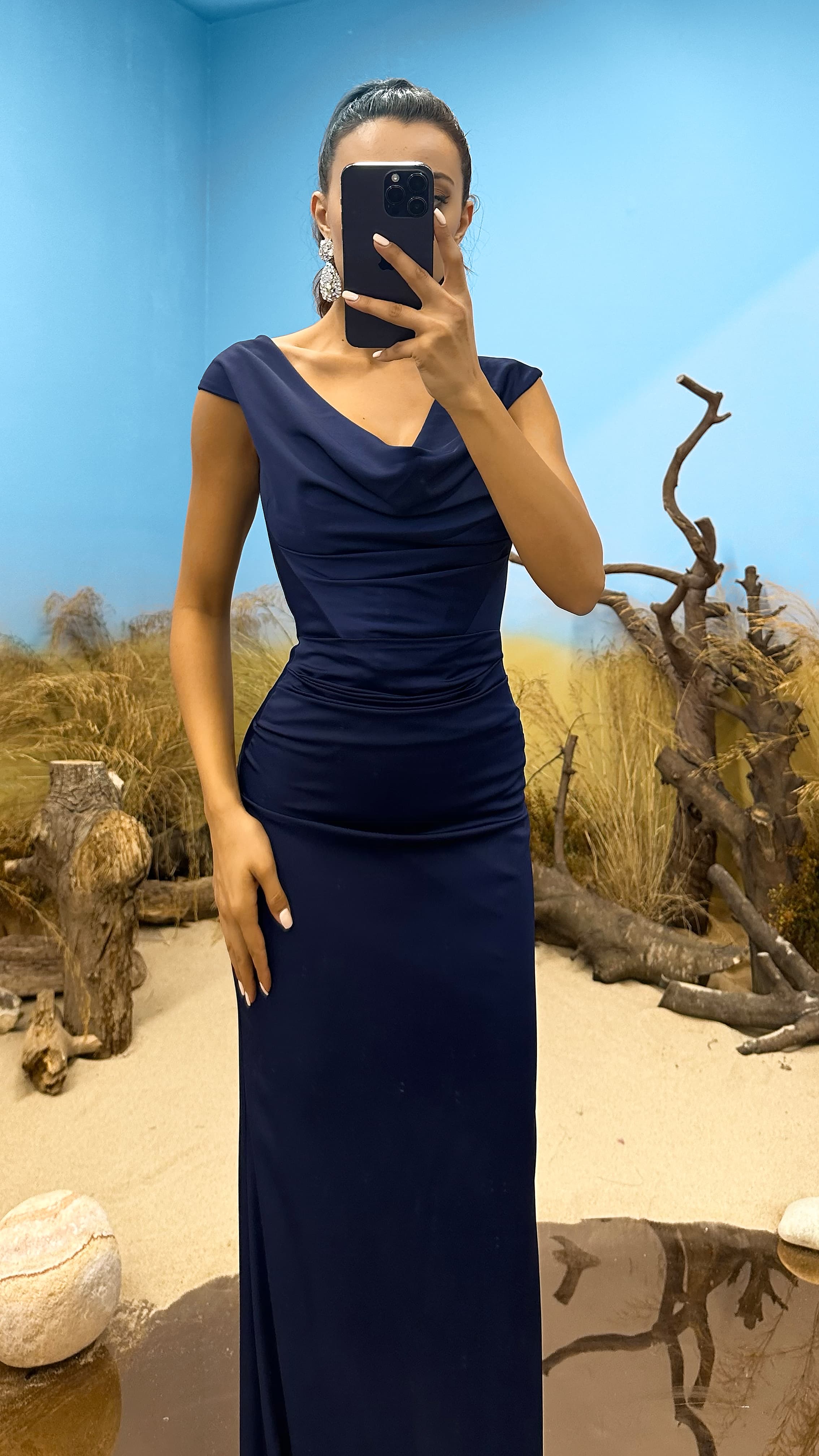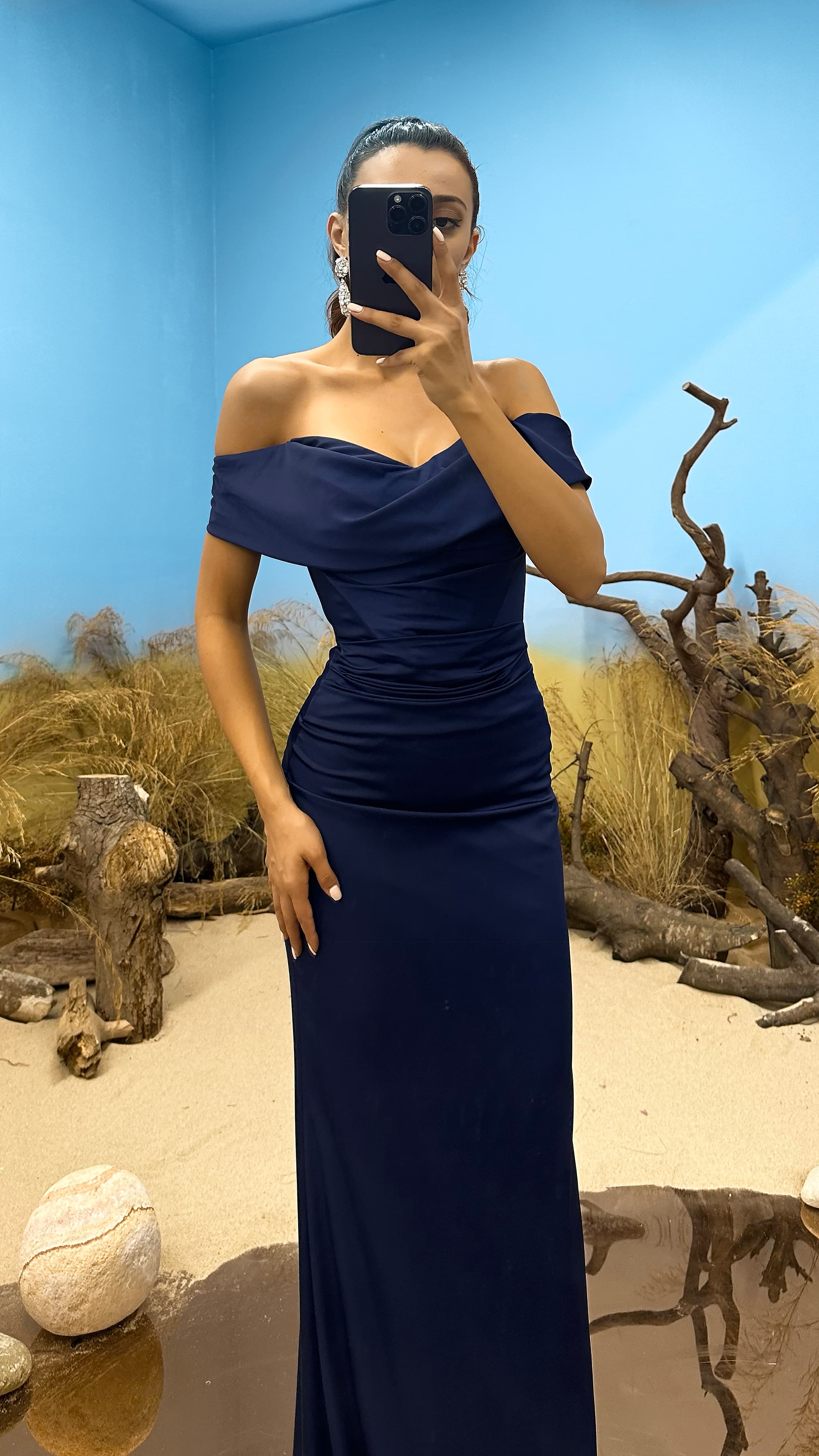 Lacivert Göğsü Kayık Yaka Tasarım Abiye Elbise