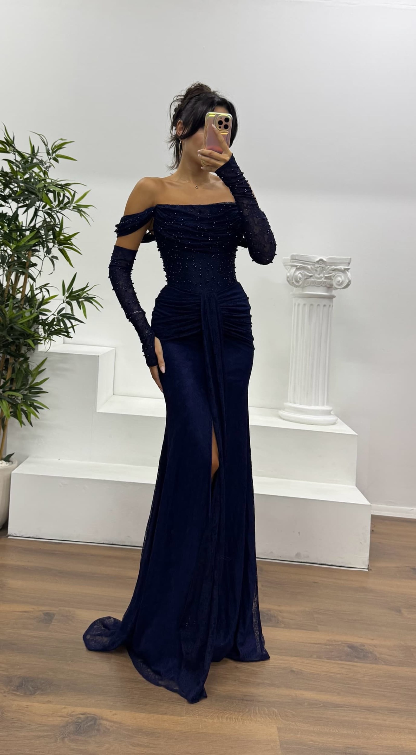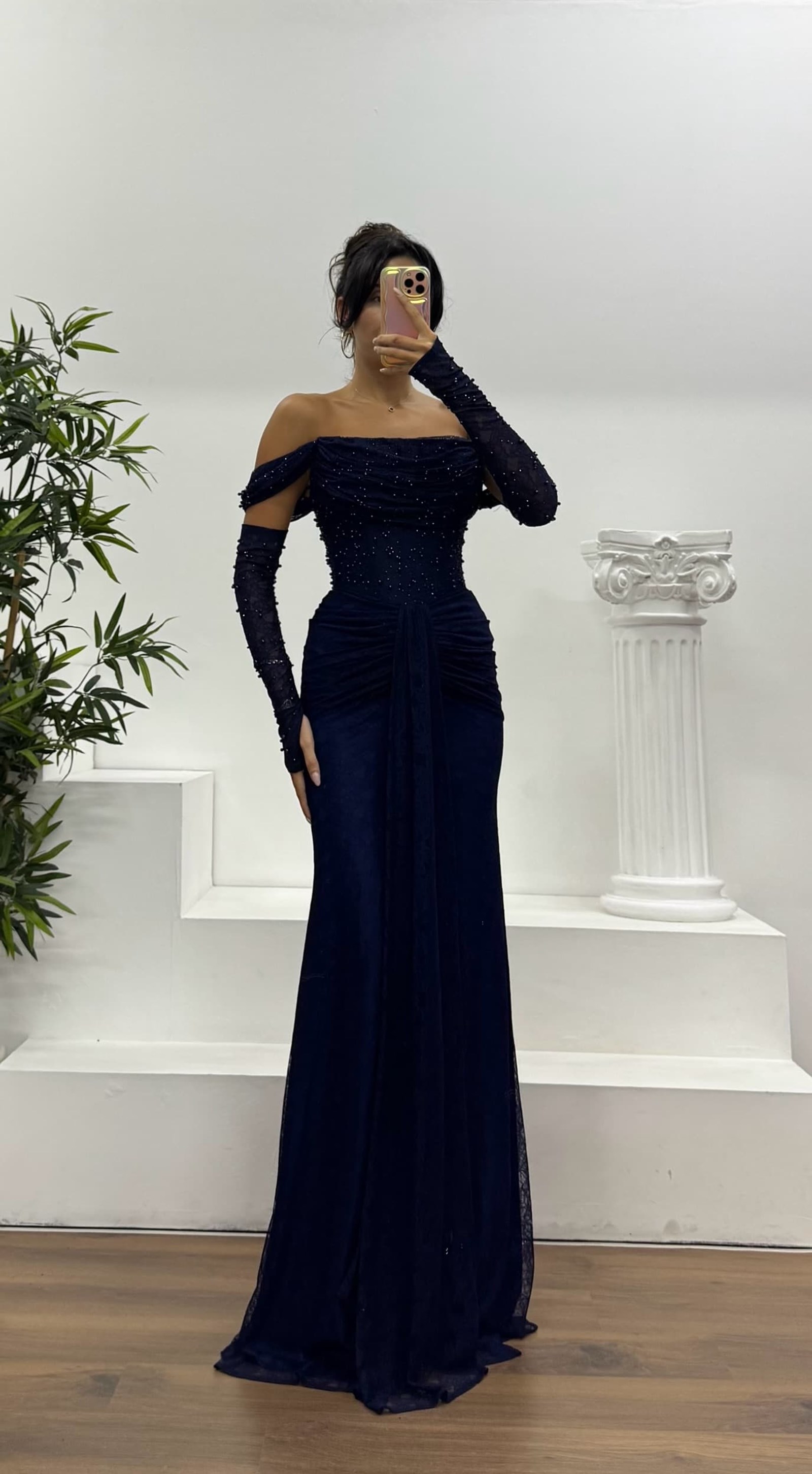 Ürün 36-42 bedene kadar uyumlu, göğüs pedli, astarlı, sırt capraz ip ve fermuar kapamalı, eldivenli, yırtmaçlı, incili abiye olarak tasarlanmıştır.