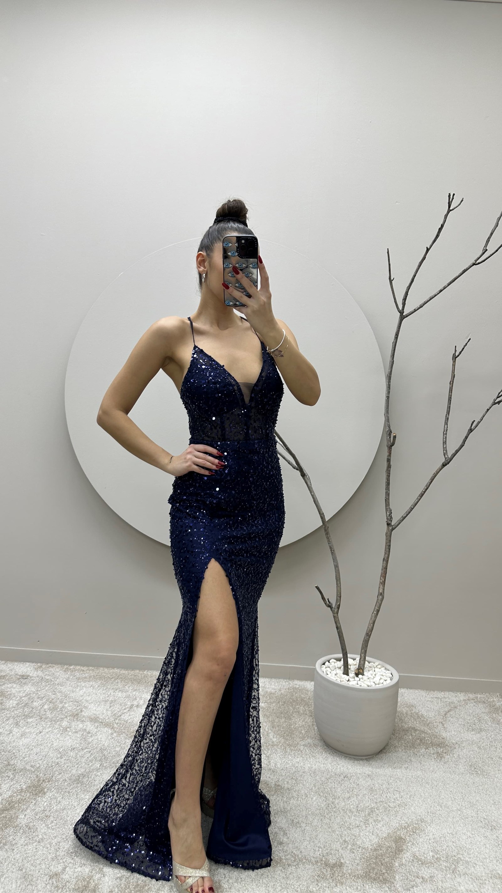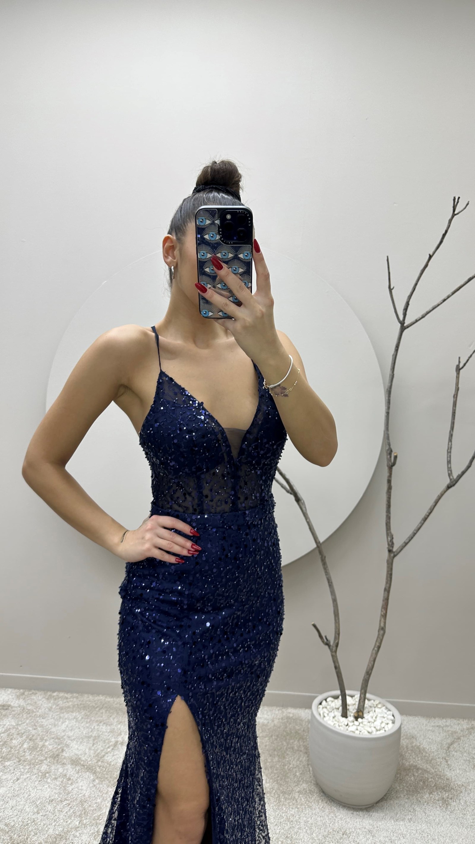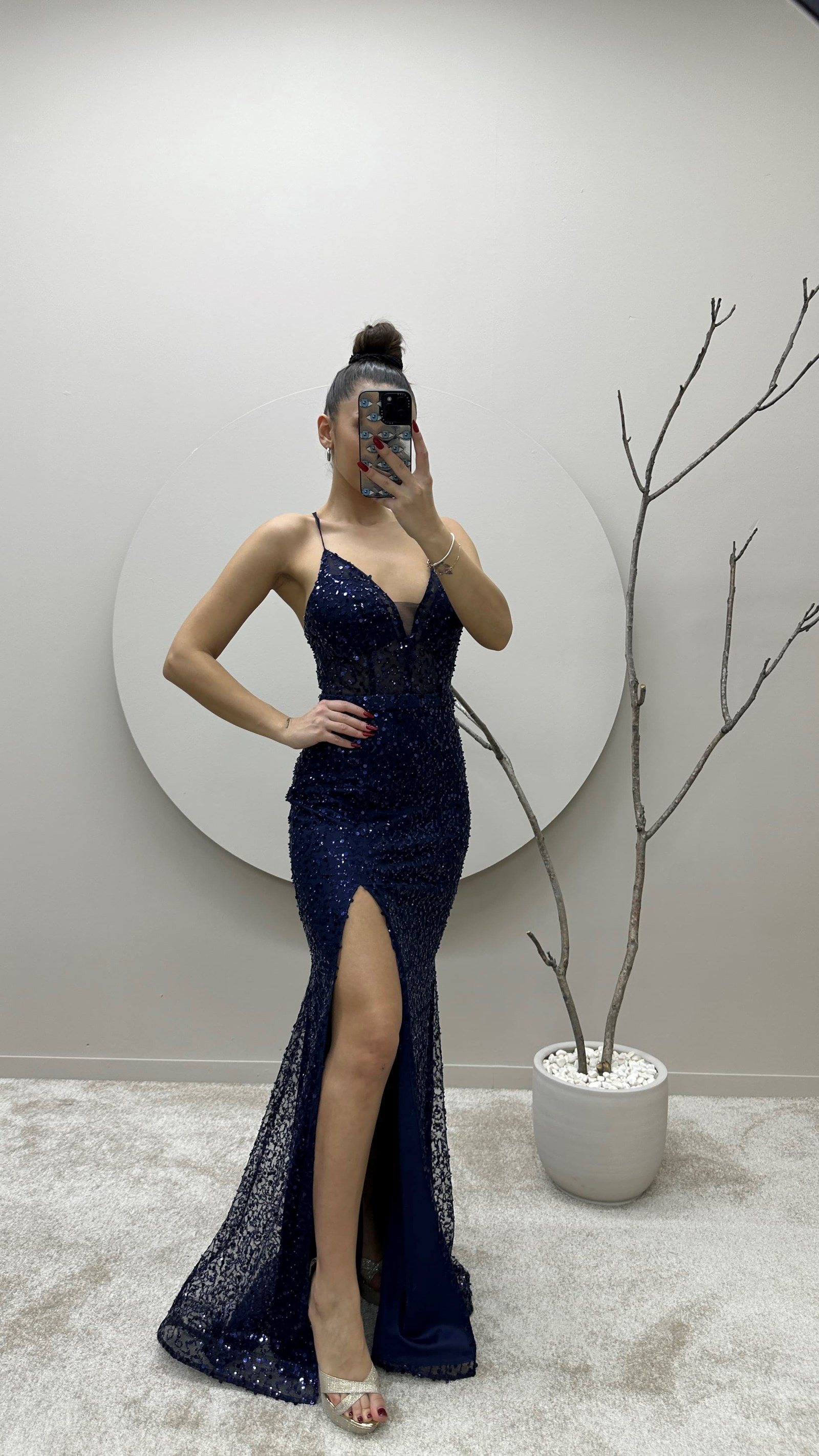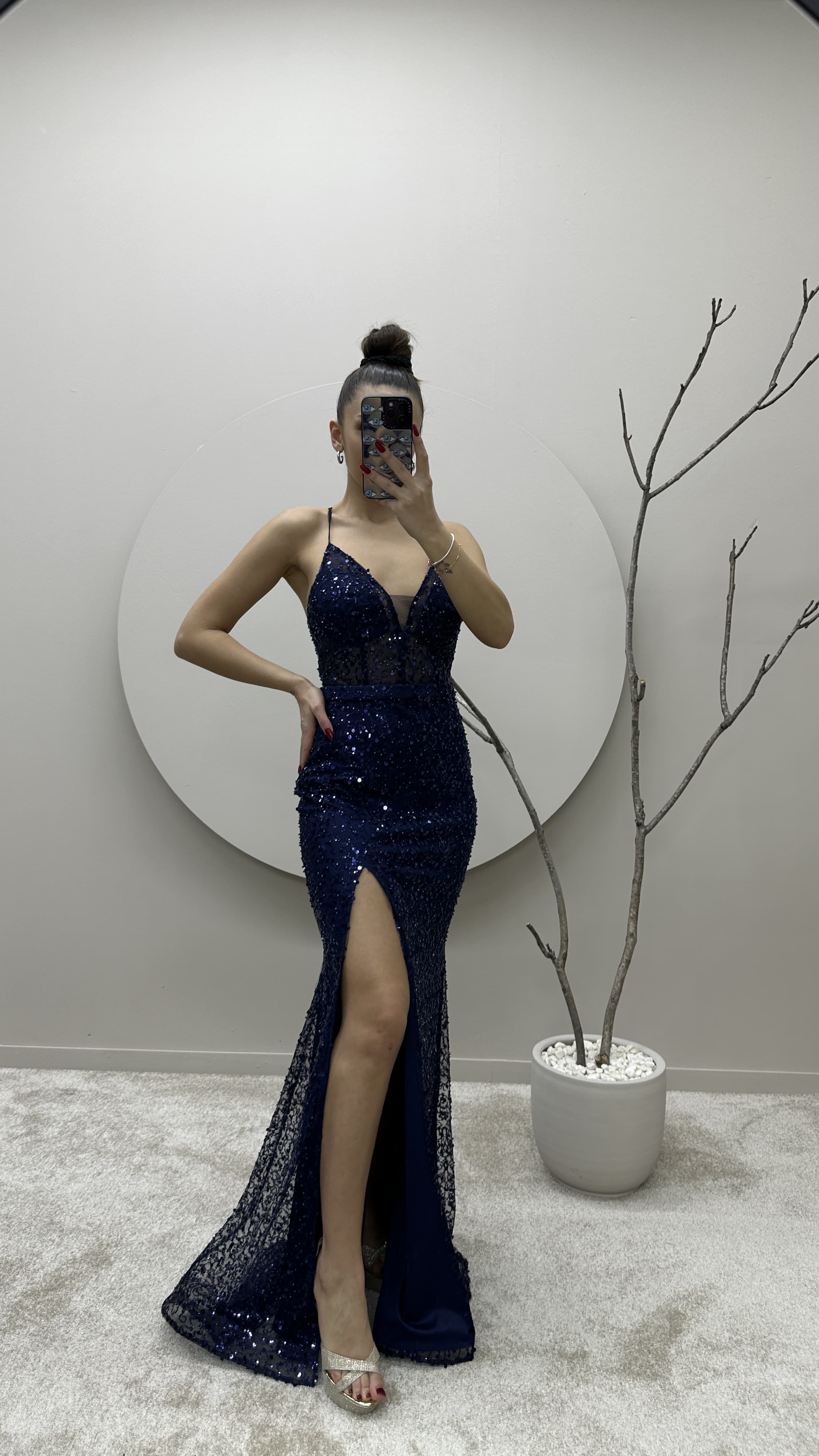 • Lacivert İp Askılı Yırtmaçlı Tasarım Pul Detay Abiye Elbise