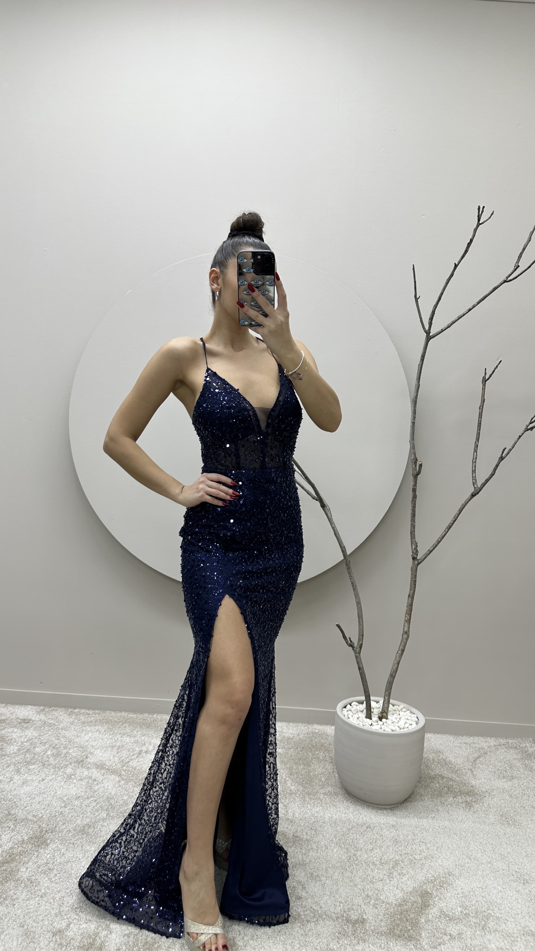 Lacivert İp Askılı Yırtmaçlı Tasarım Pul Detay Abiye Elbise