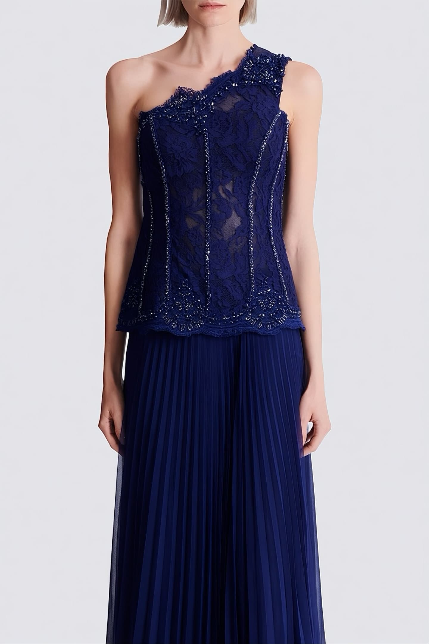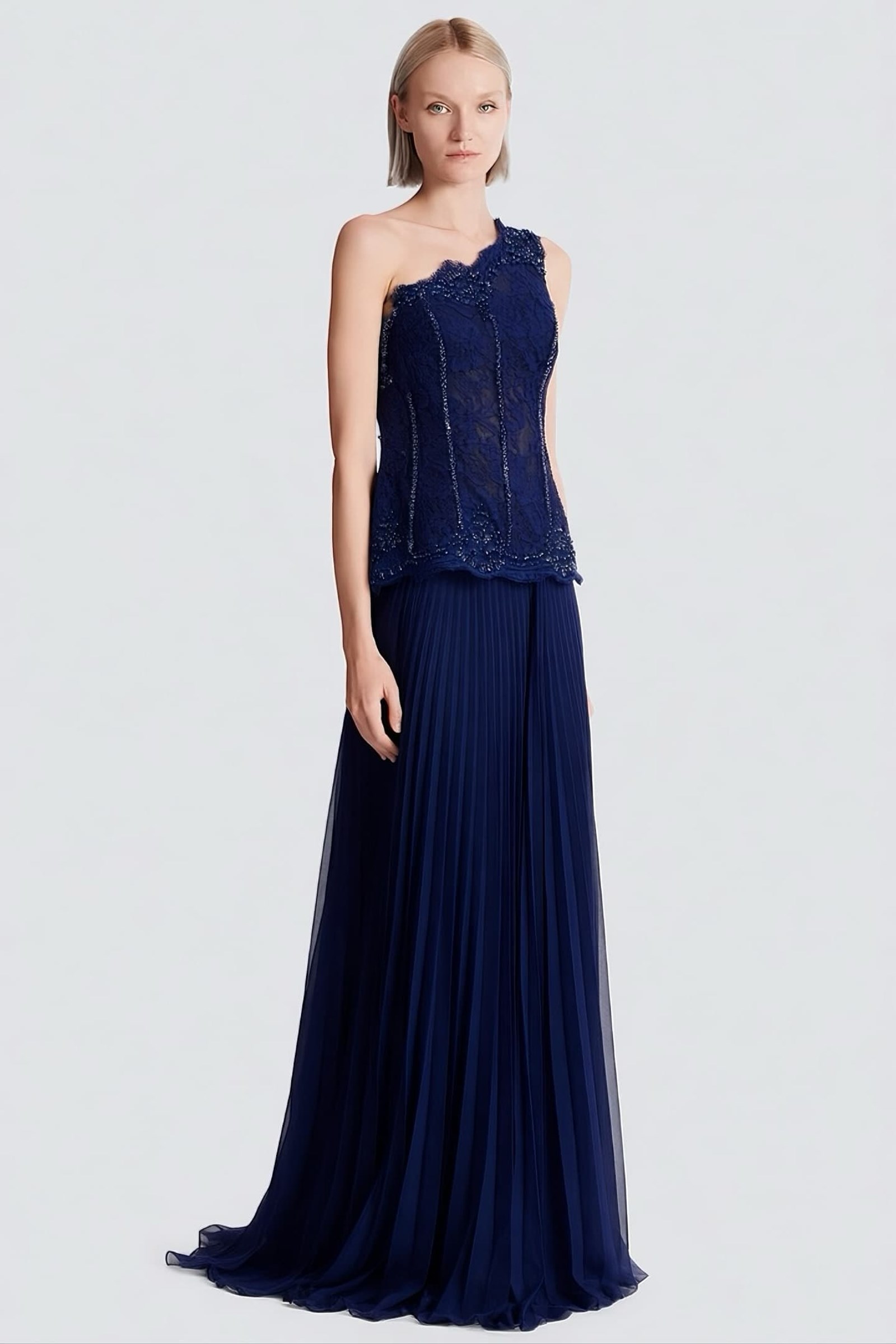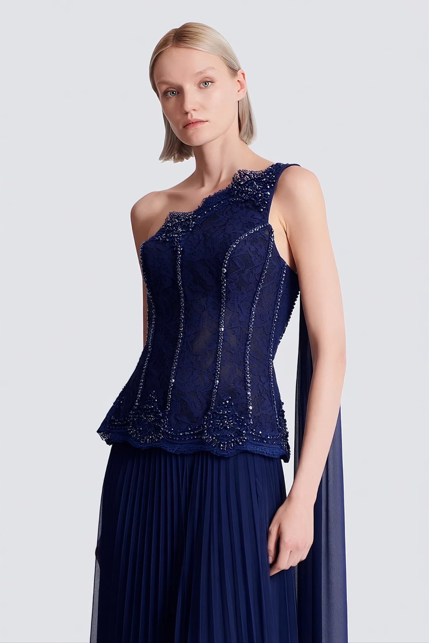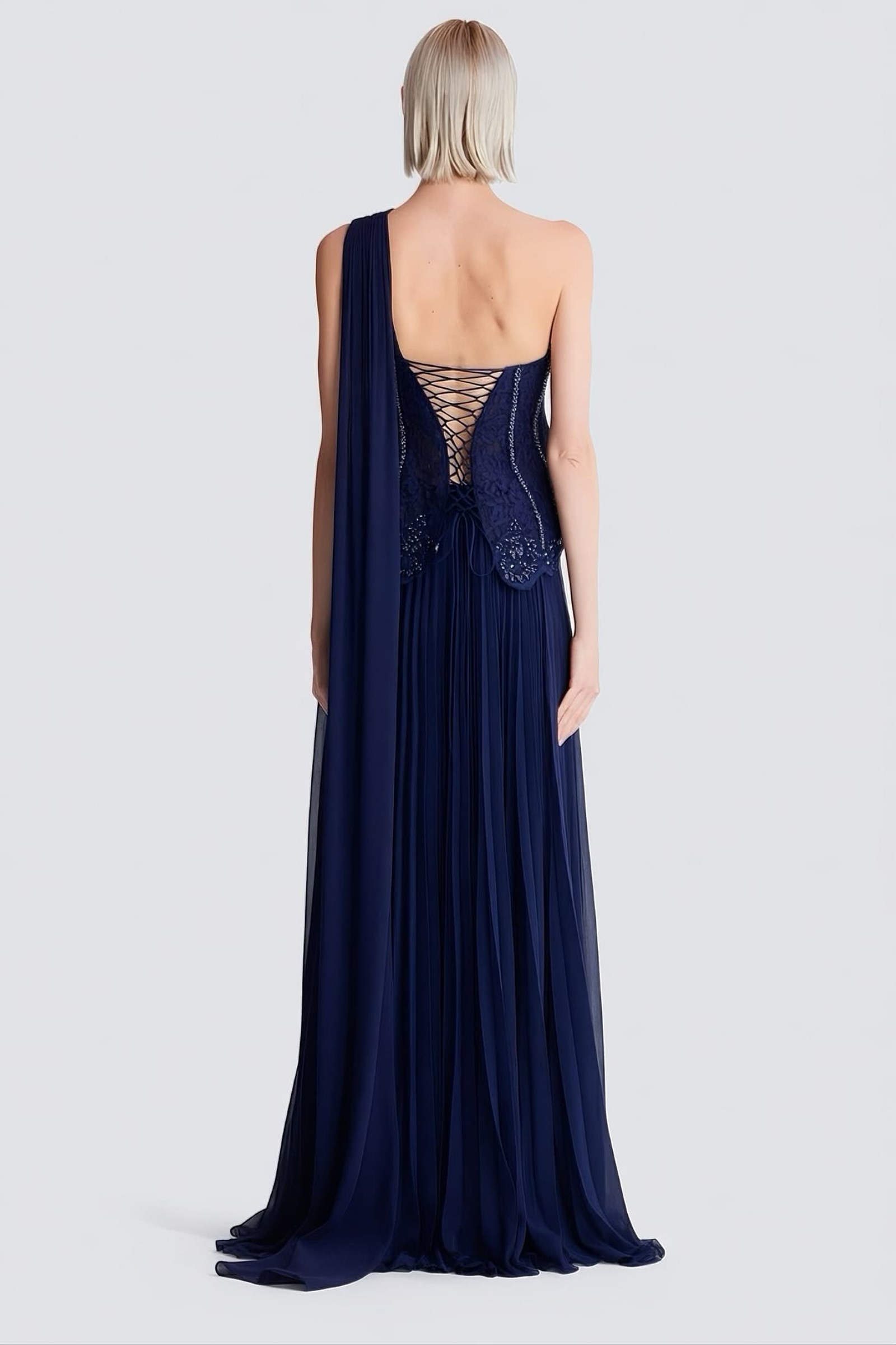 Lacivert İşlemeli Korse Üstlü Pileli Şifon Abiye Elbise