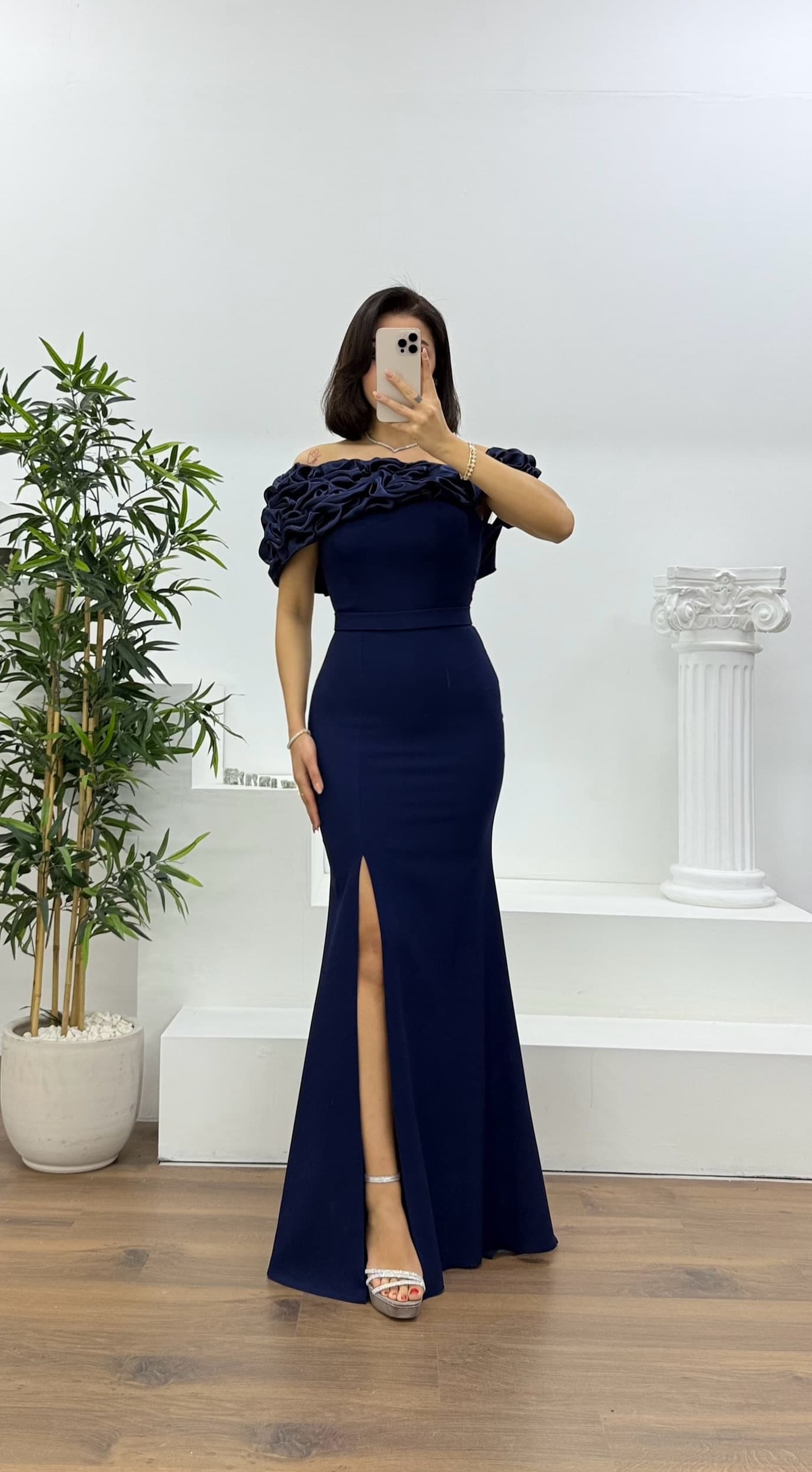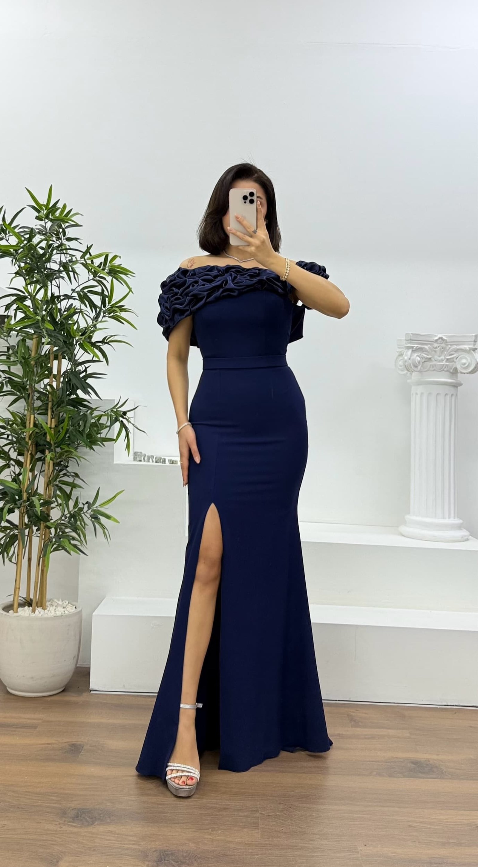 Lacivert Kayık Yaka Fırfırlı Abiye Elbise
