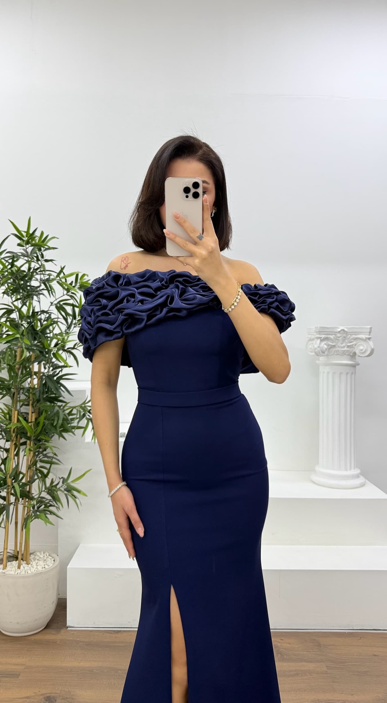 • Lacivert Kayık Yaka Fırfırlı Abiye Elbise