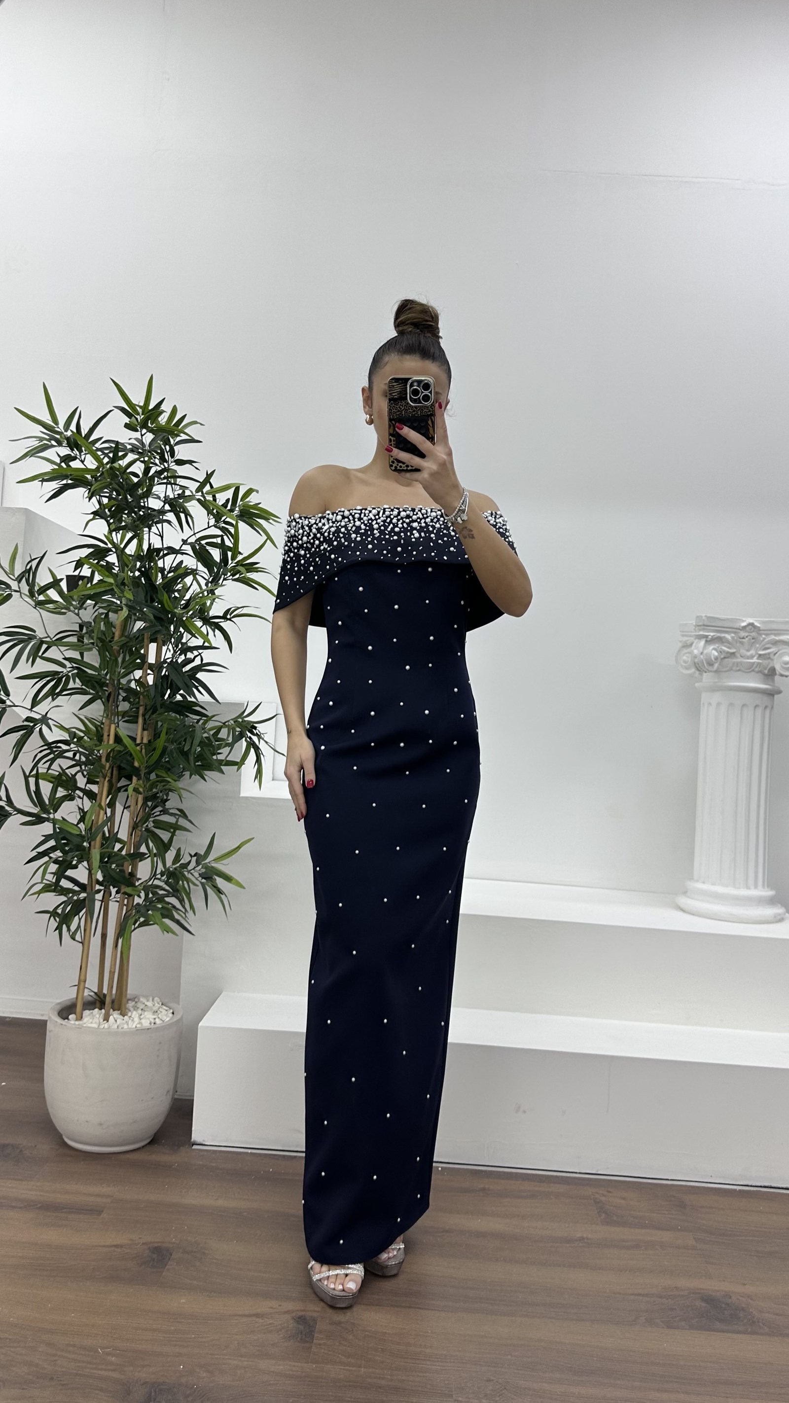 • Lacivert Kayık Yaka İnci Detaylı Abiye Elbise