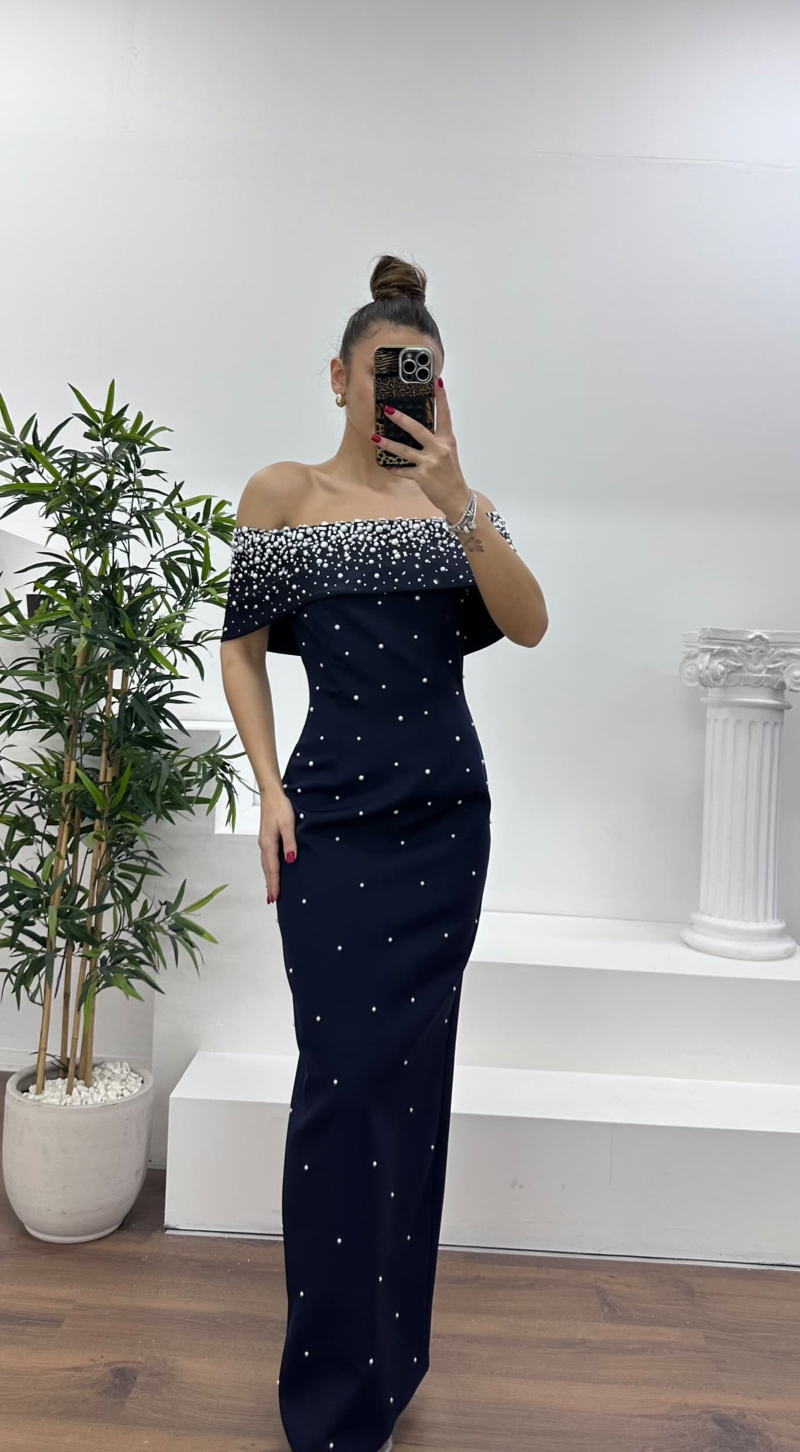 • Kemik Kayık Yaka İnci Detaylı Abiye Elbise
