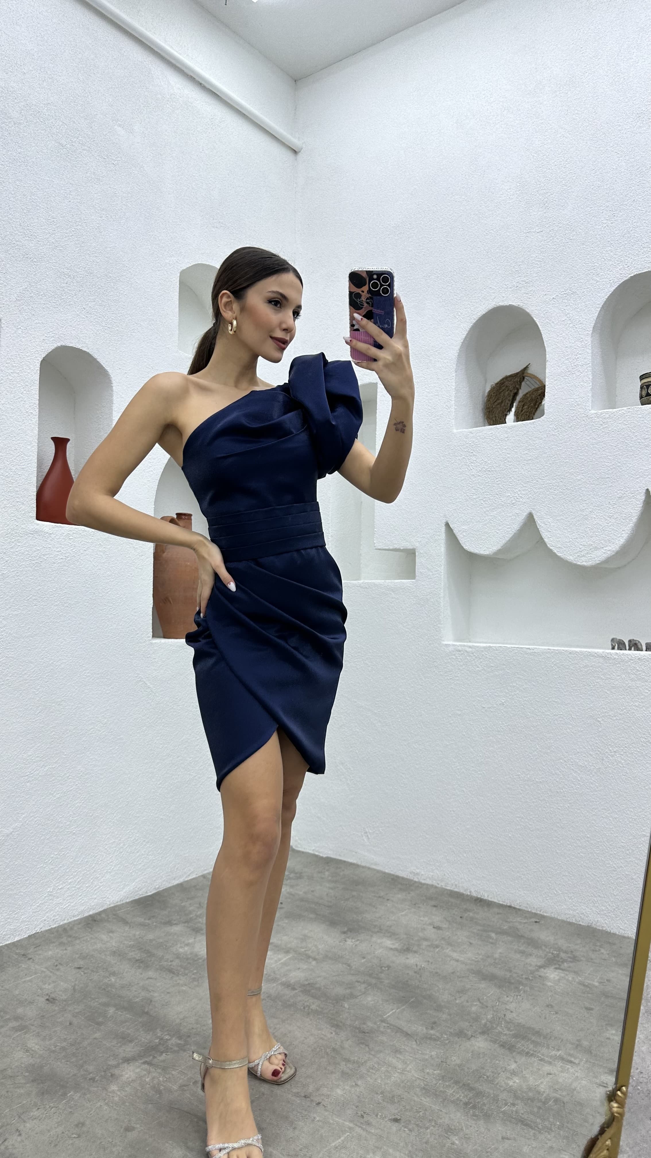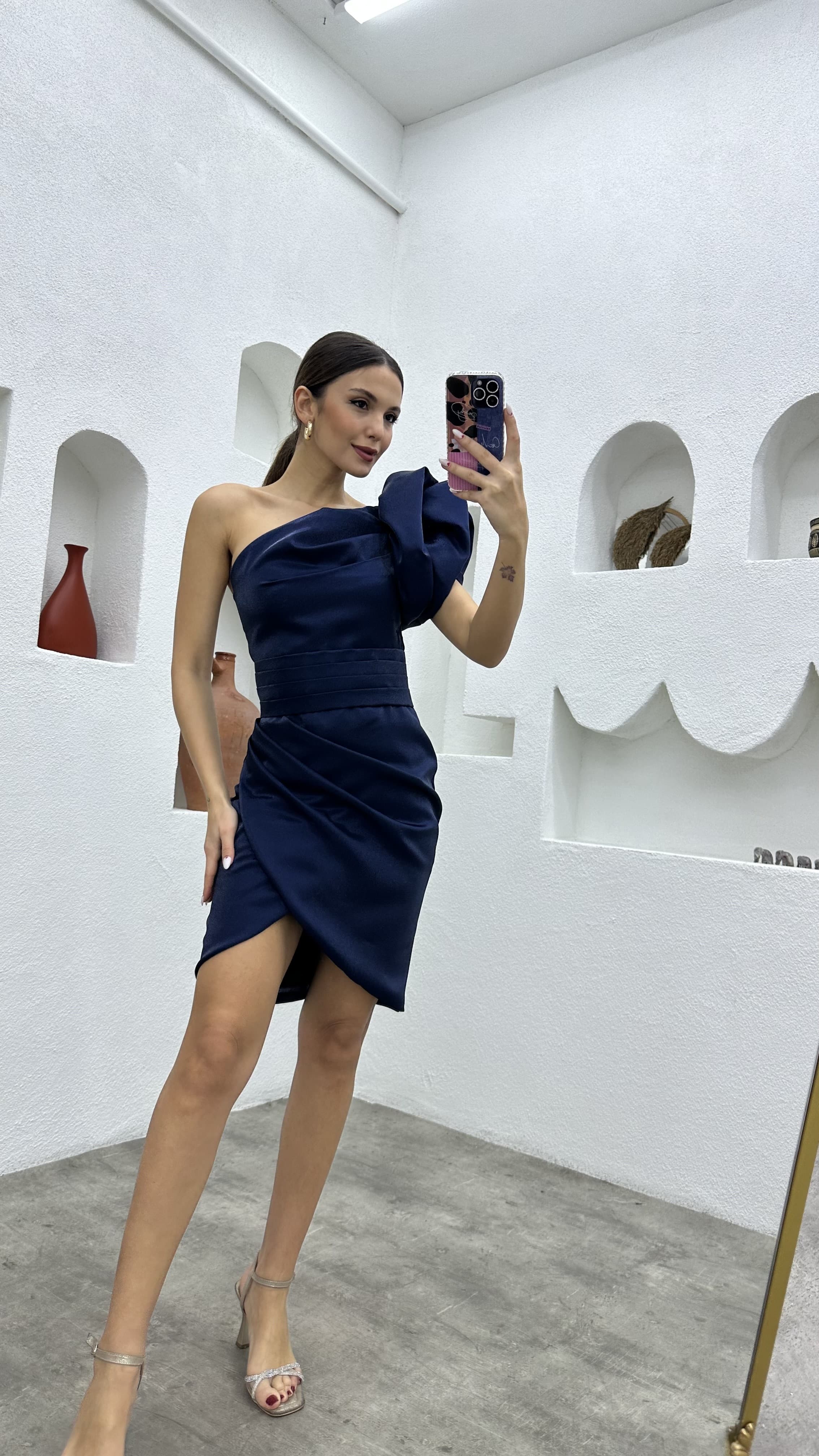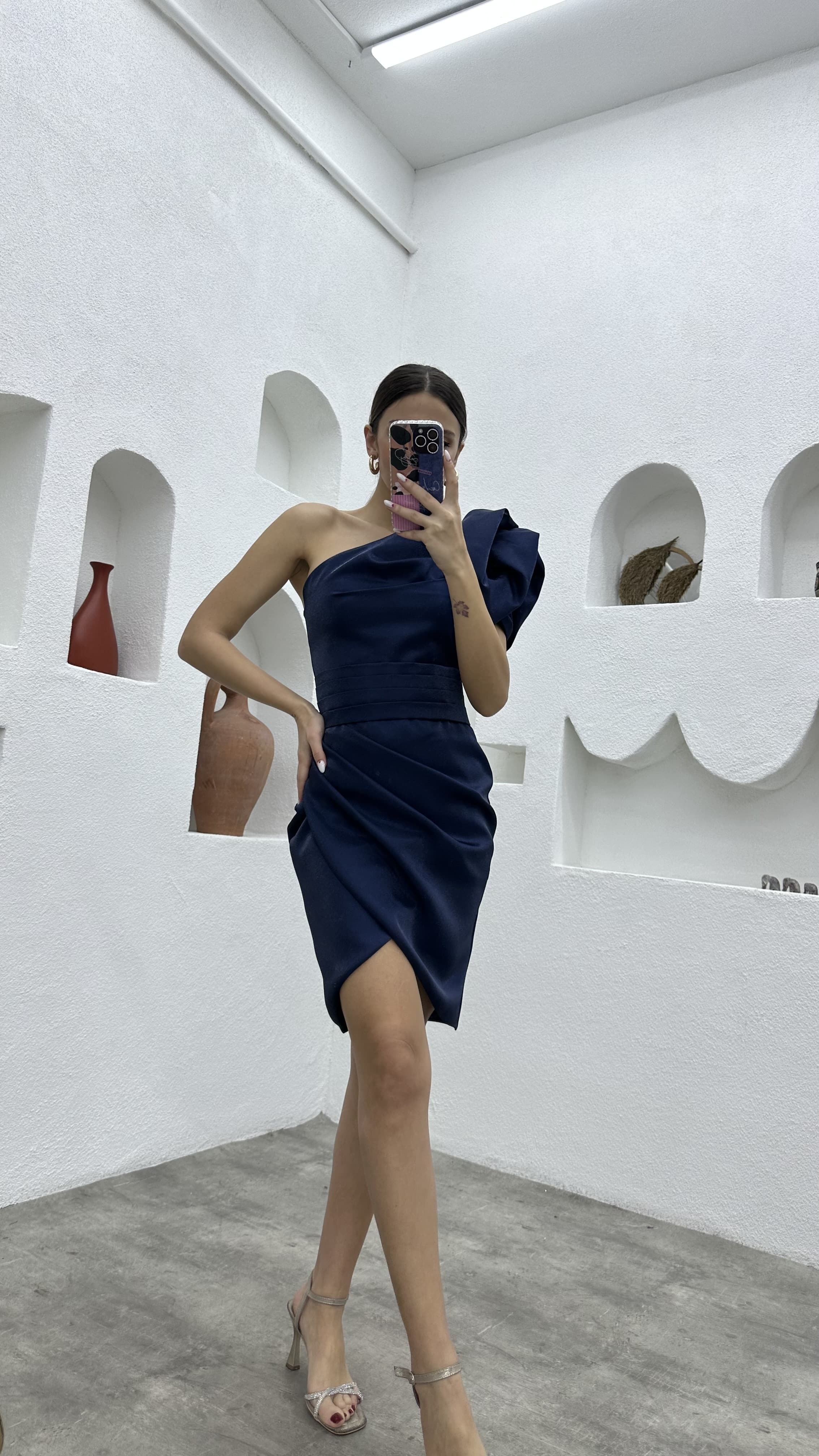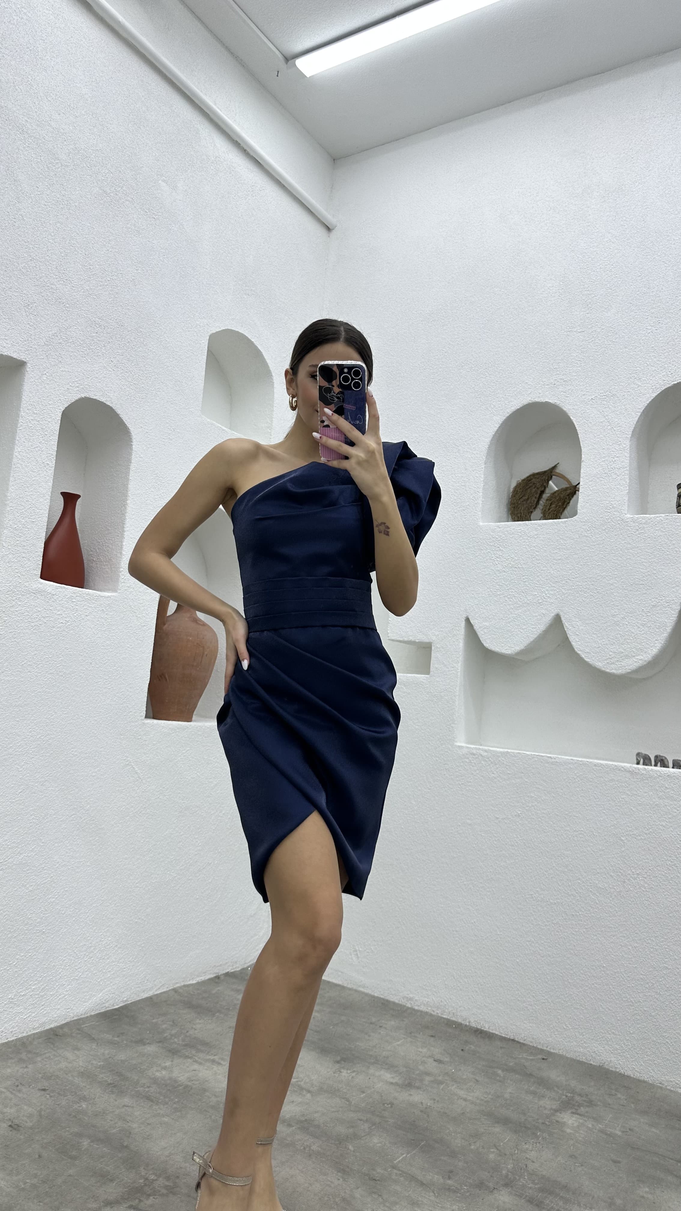 • Lacivert Kolu Volanlı Tek Omuz Abiye Elbise